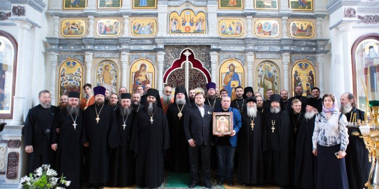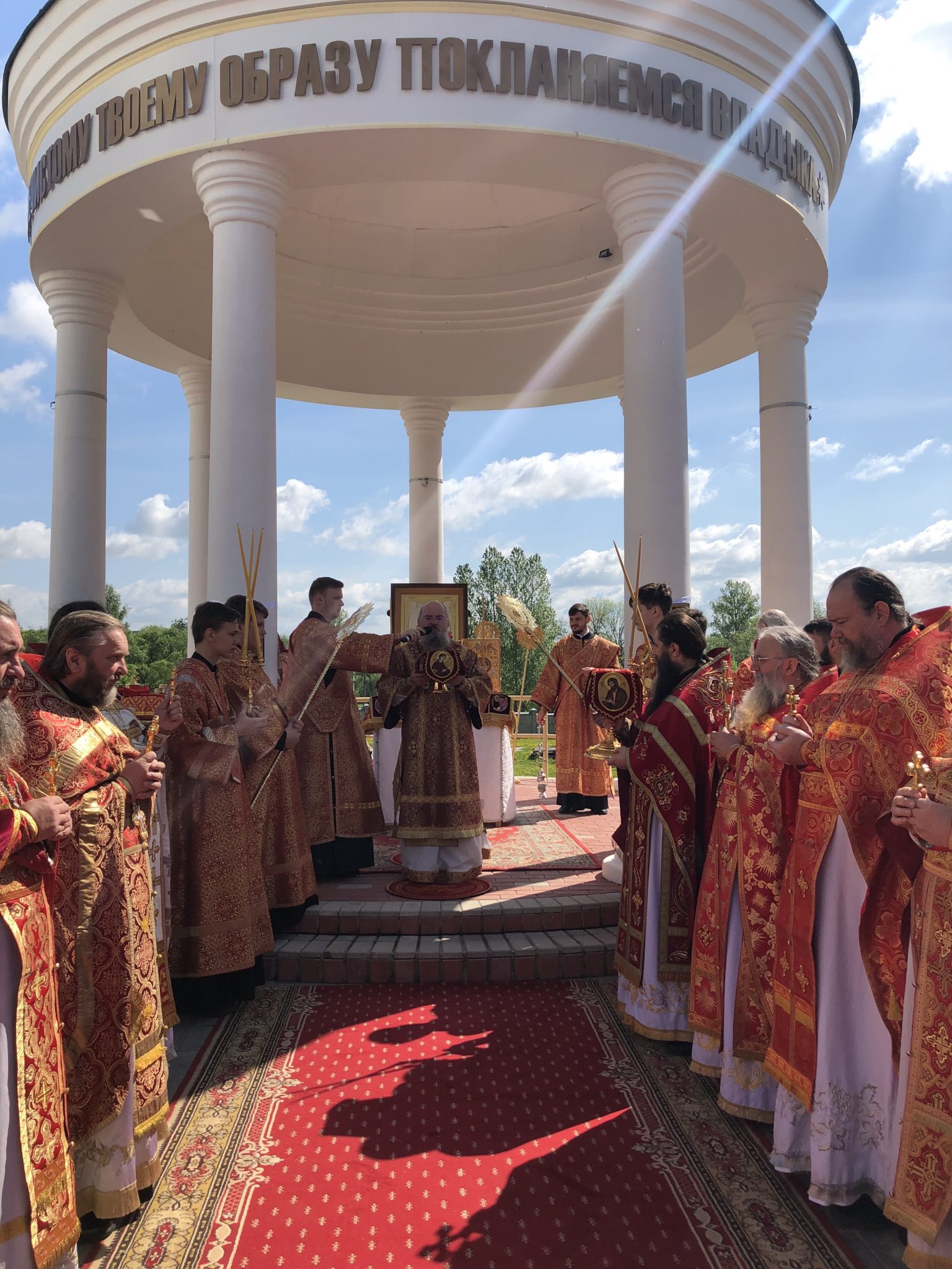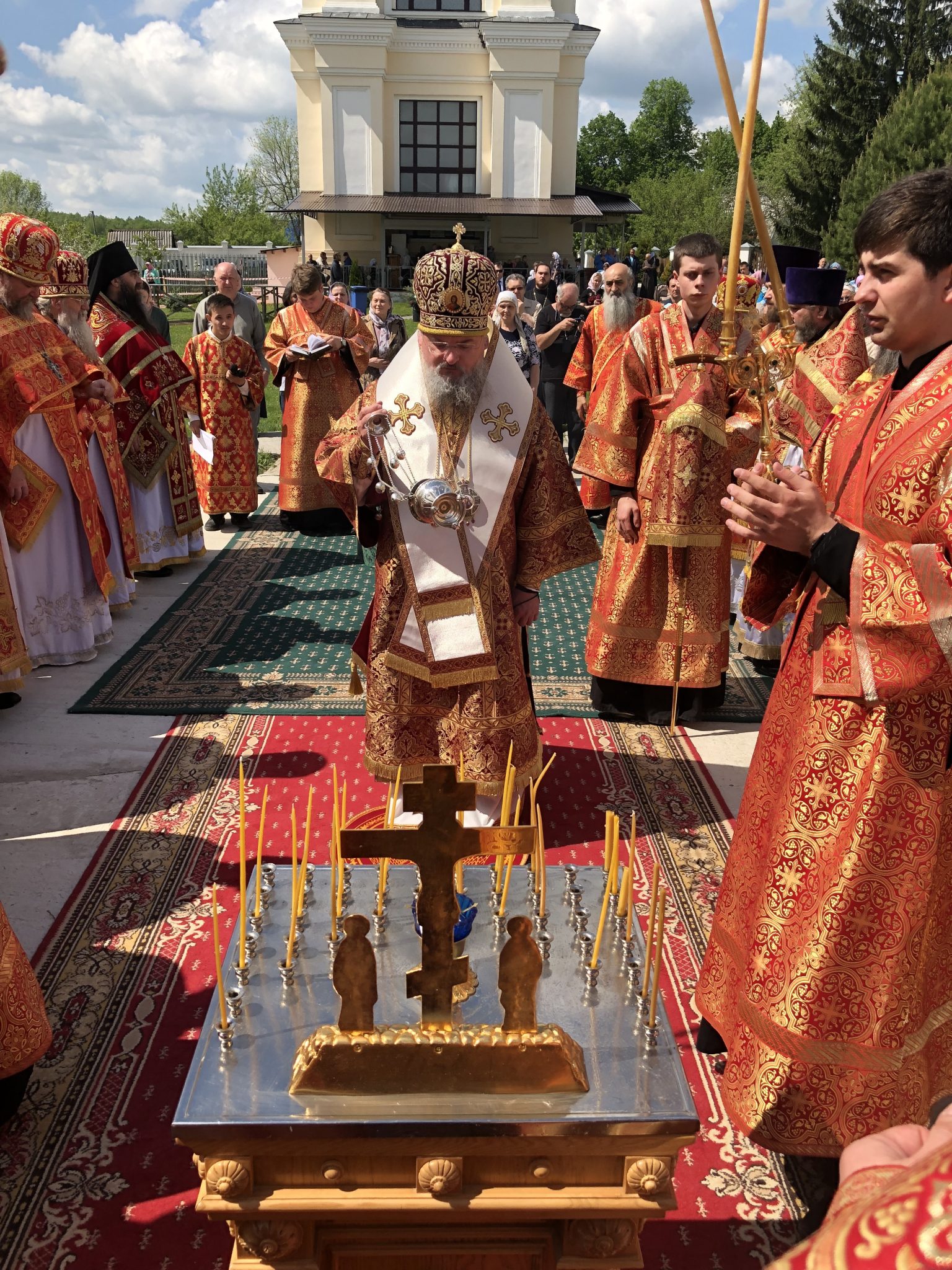 Перед началом богослужения священнослужители и паломники торжественно встретили мироточивый образ царя страстотерпца Николая Второго, пребывающий в эти дни в Козельской епархии.
