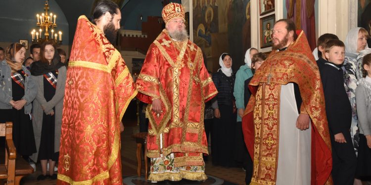 Преосвященнейшему владыке сослужили: секретарь епархии протоиерей Владимир Бахаев, протоиерей Сергий Сычев, иерей Сергий Барыкин – настоятель храма, иерей Антоний Лунин – директор православной гимназии, иерей Максим Изопов, иерей Олег Леонов, диакон Евгений Ковригин, диакон Евгений Васильев и диакон Димитрий Лутков.
