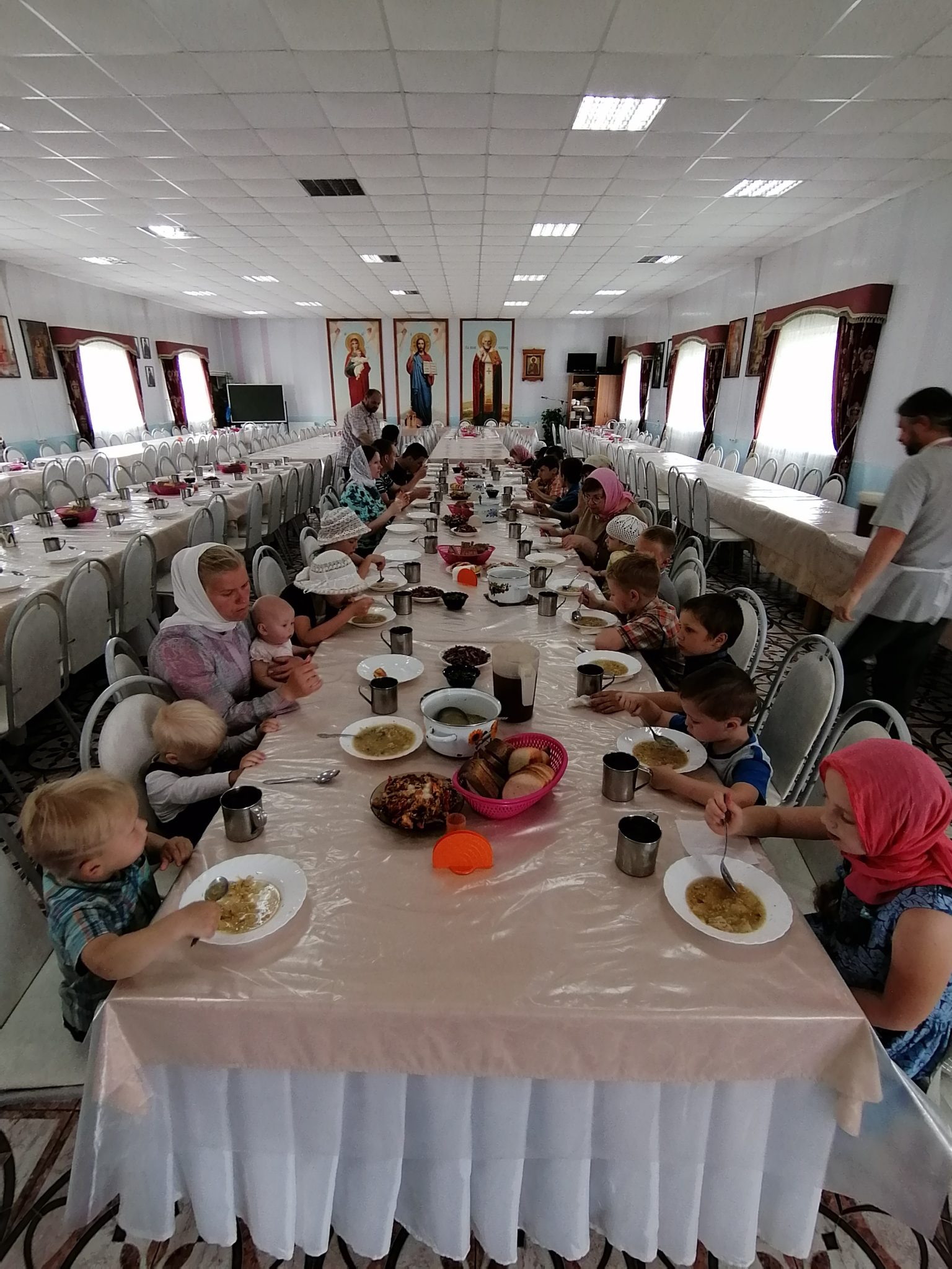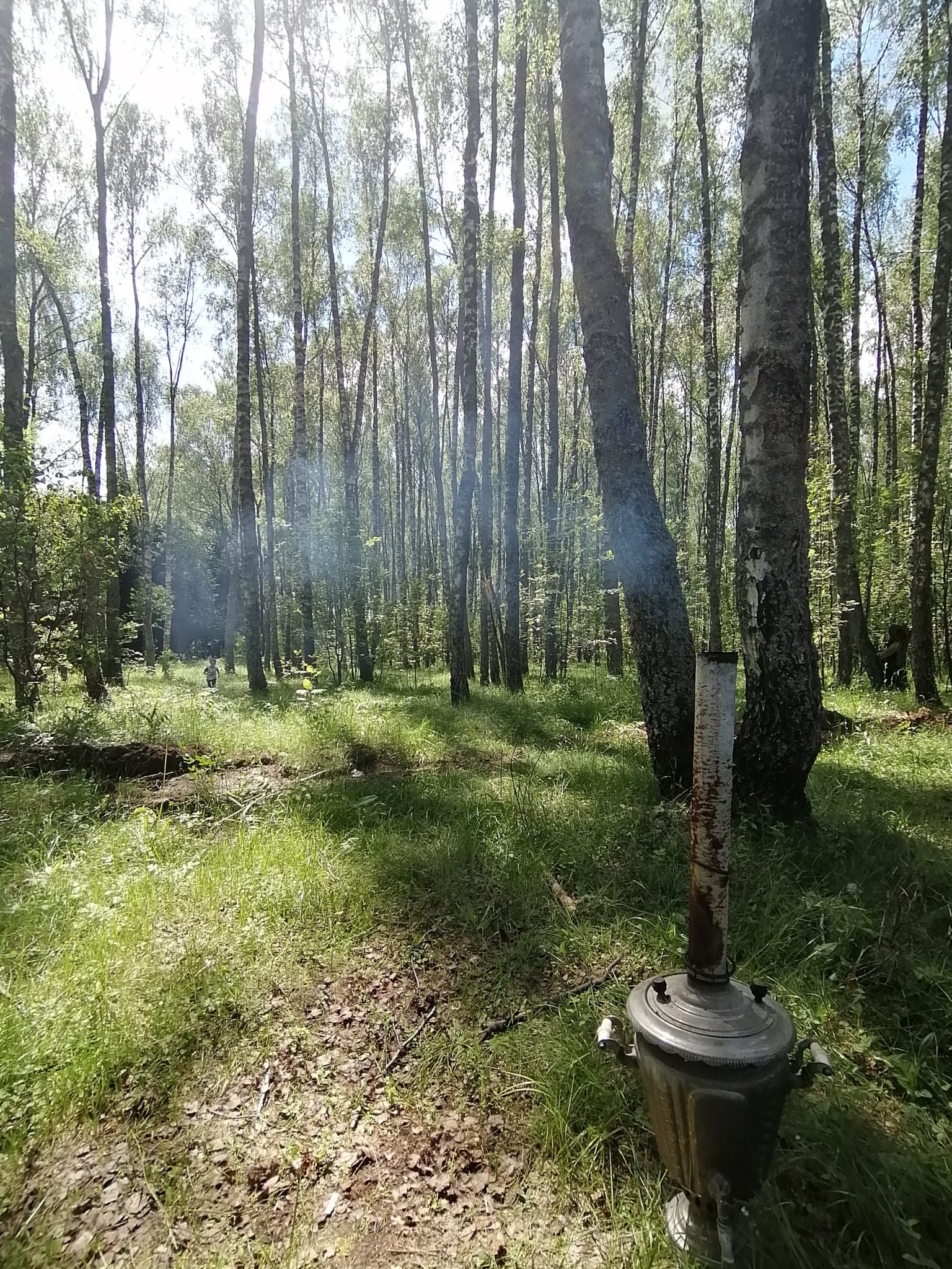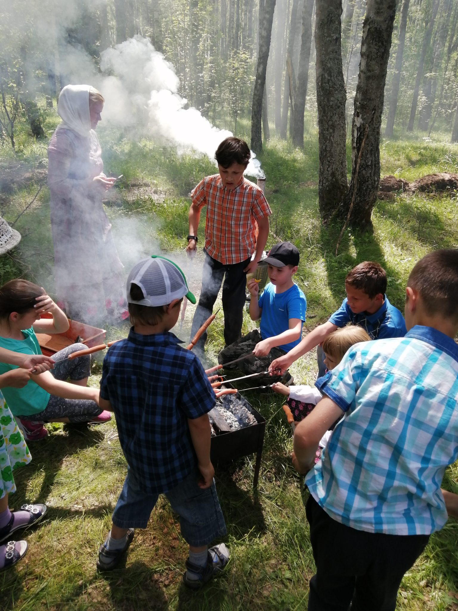 На обратном пути в Козельск, паломники остановились для отдыха на природе. Дети играли в спортивные игры, пили чай из самовара.