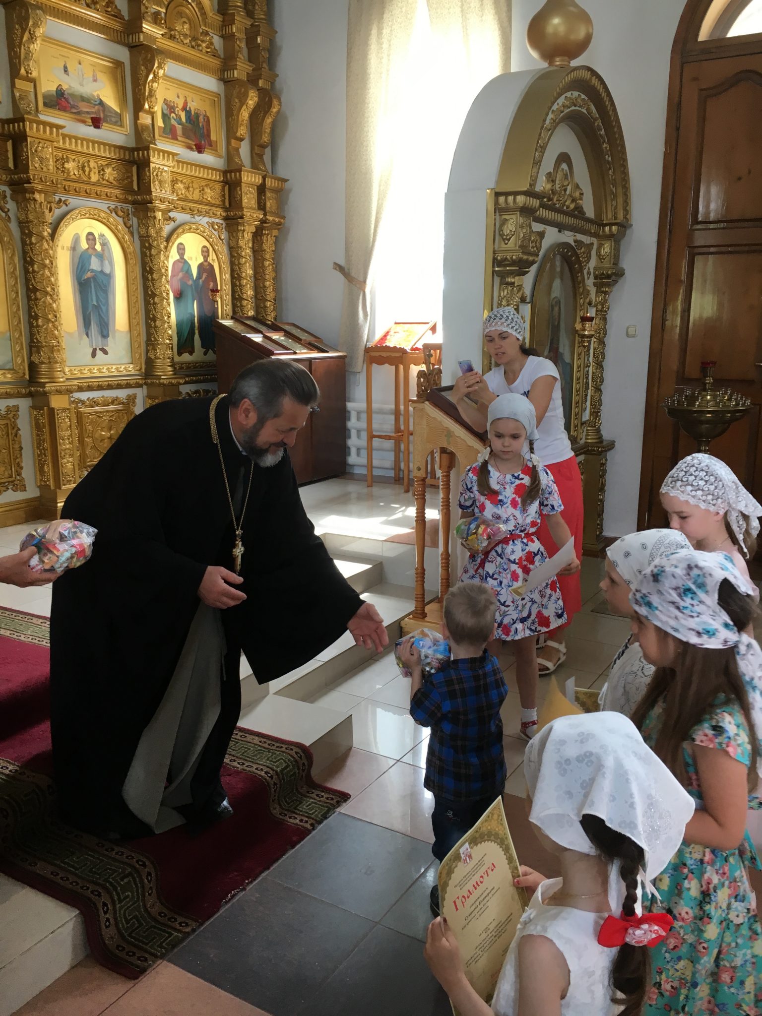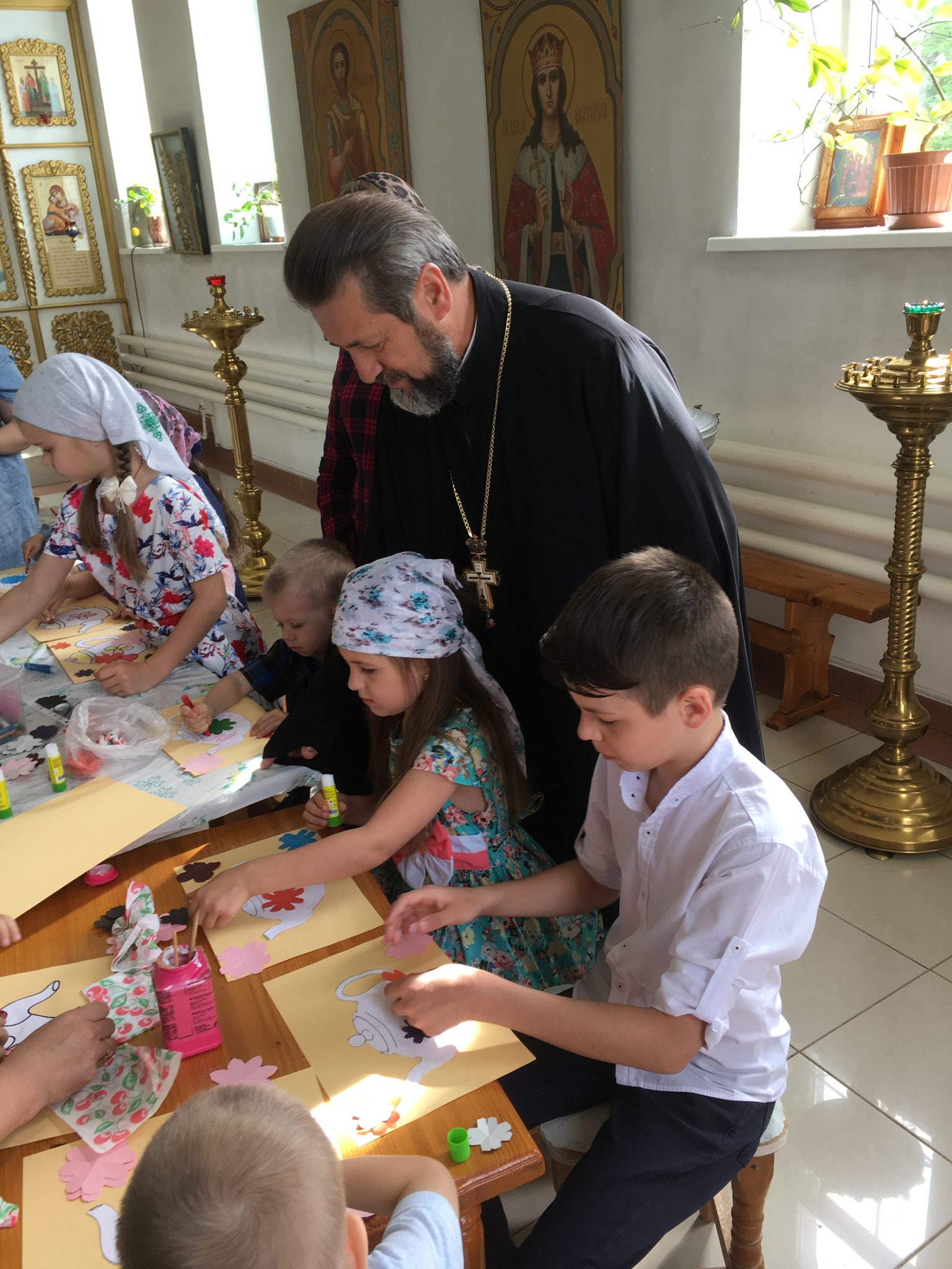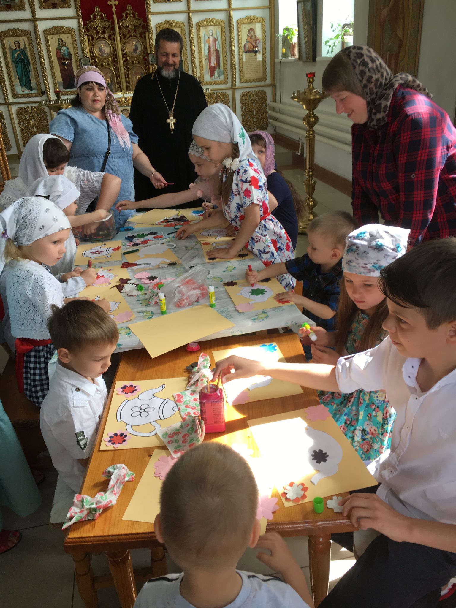 Настоятель благодарил участников конкурса пасхальных рисунков. Он вручил участникам грамоты Калужской митрополии. Был организован мастер класс по изготовлению памятных сувенирных рисунков для родителей. Дети с радостью раскрашивали и украшали свои поделки и дарили своим родителям.