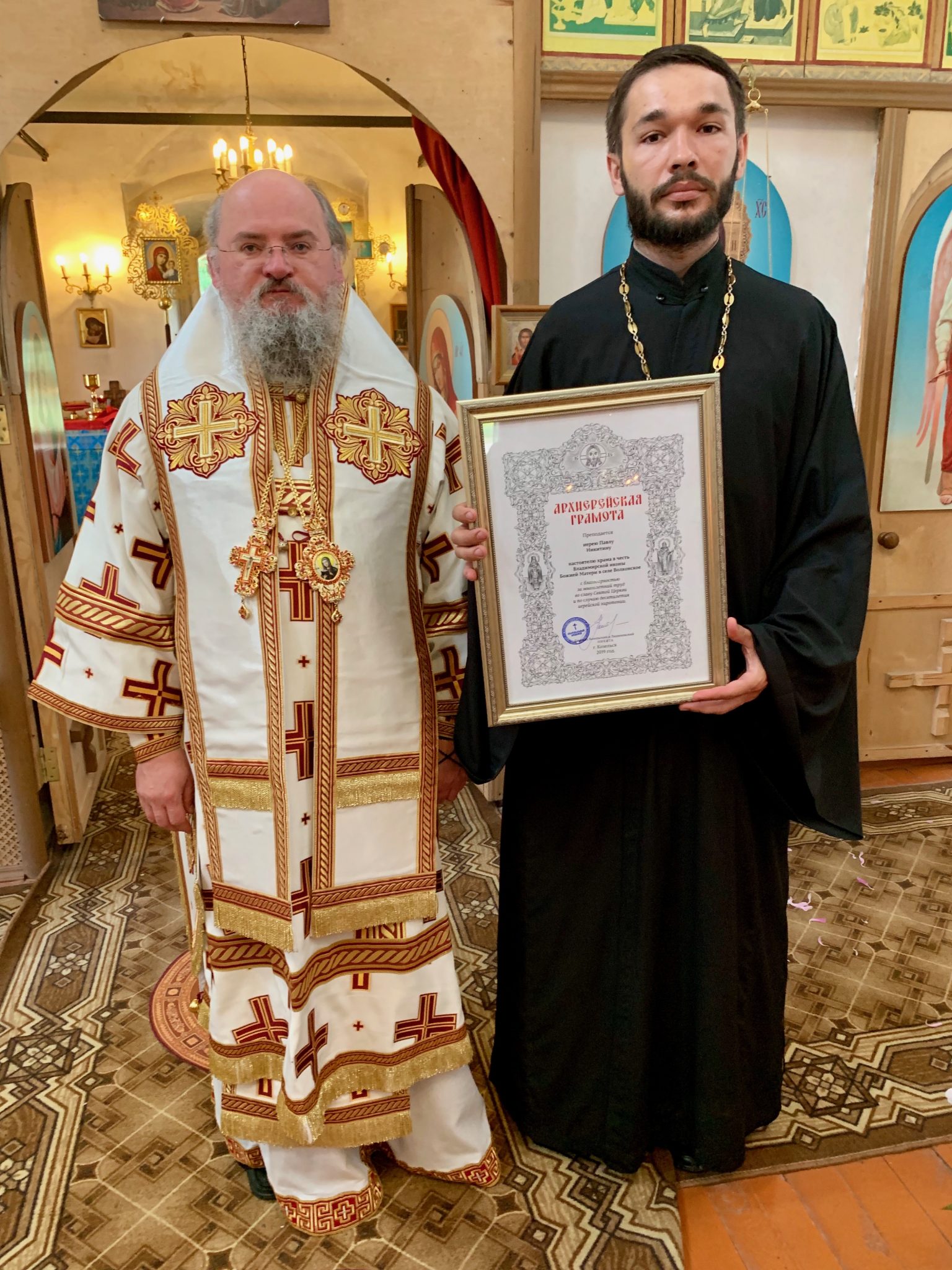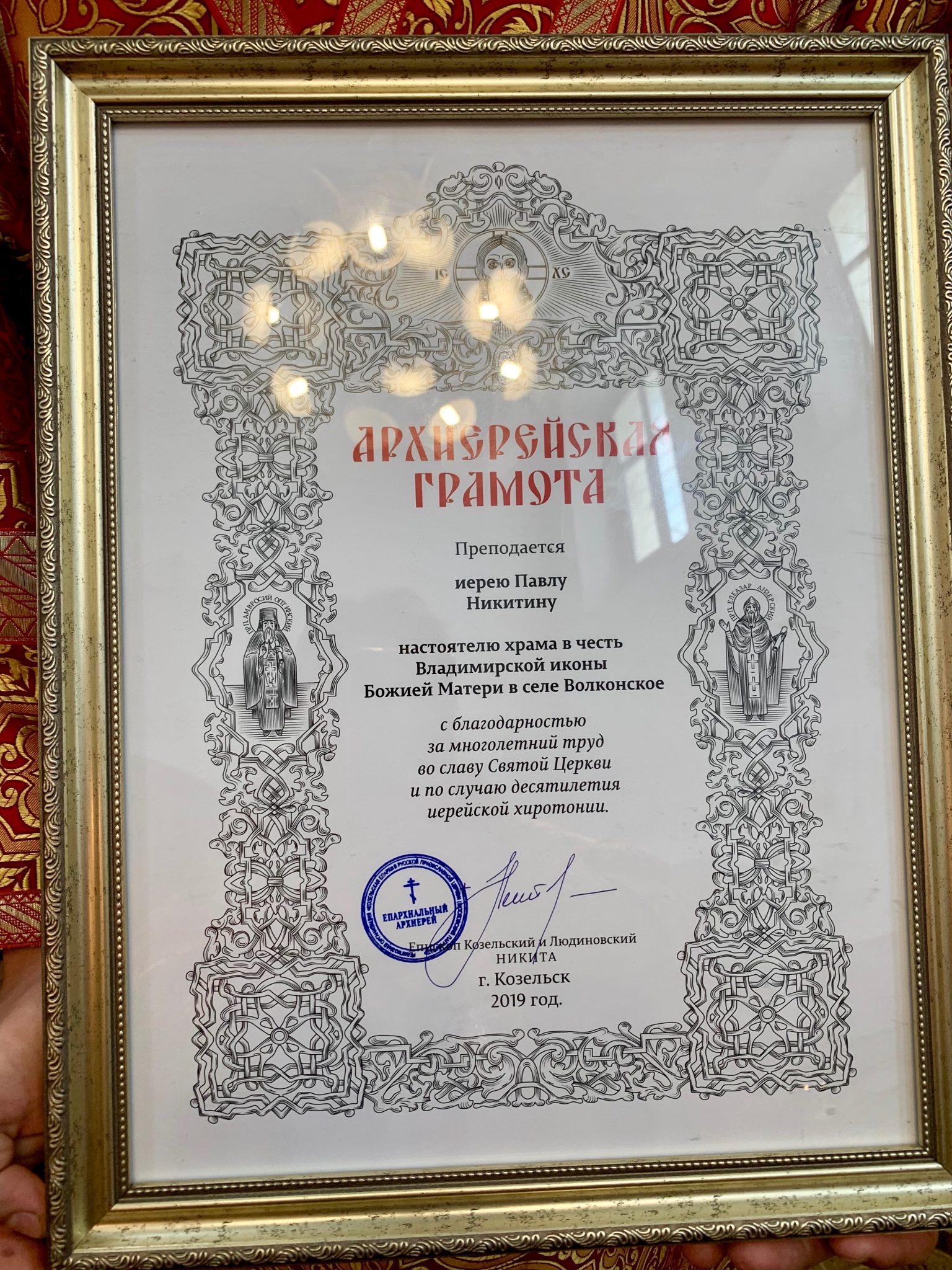 Во внимание к усердным трудам во славу Святой Церкви и в связи с десятилетием служения в священном сане настоятель прихода иерей Павел Никитин был удостоен Архиерейской грамоты.