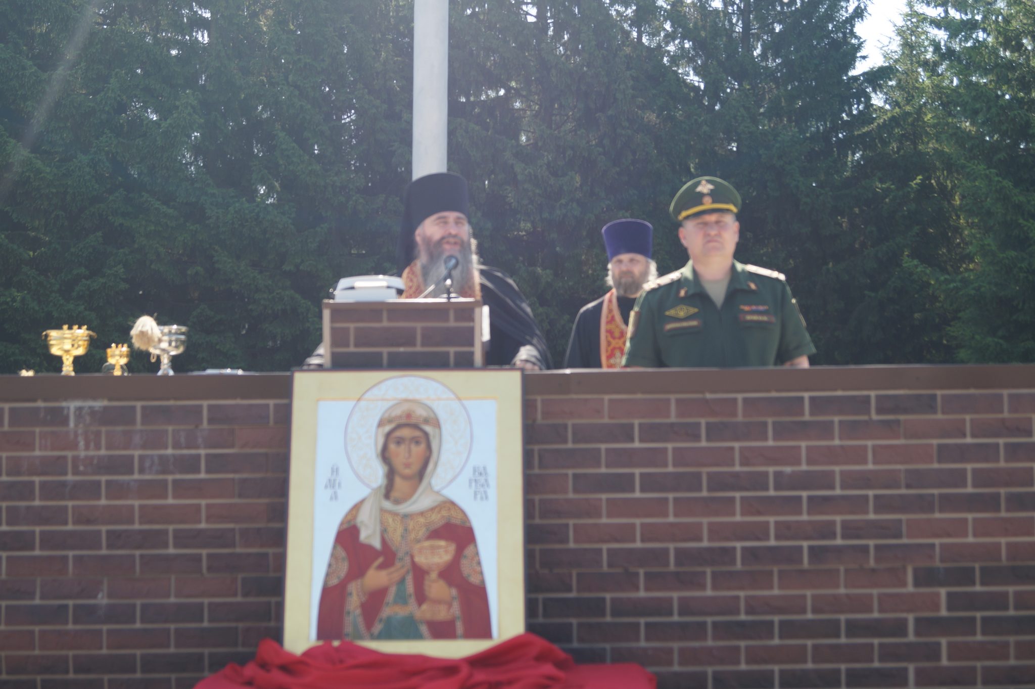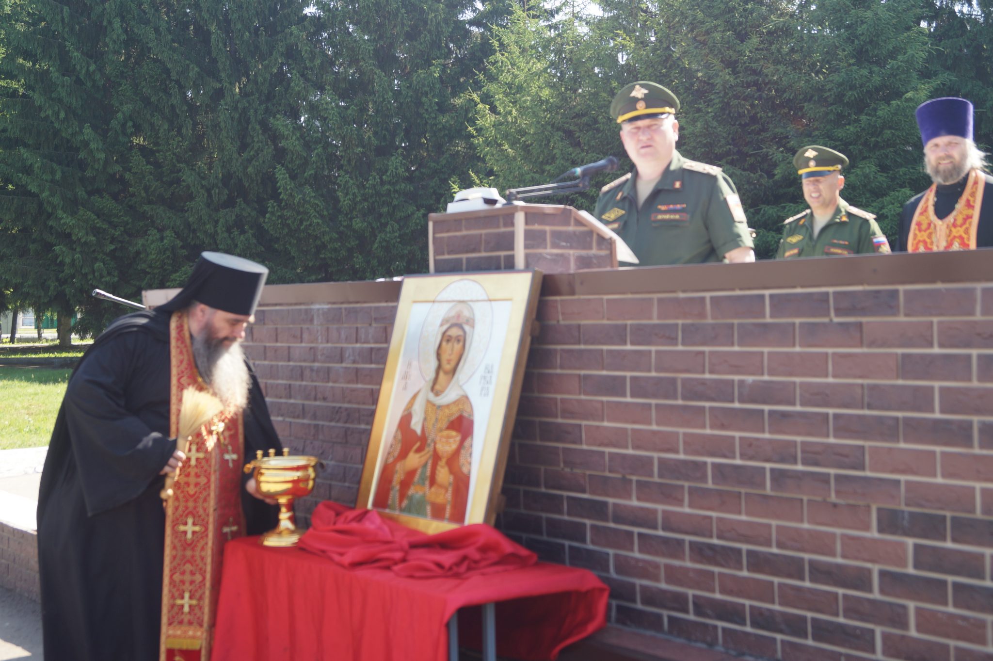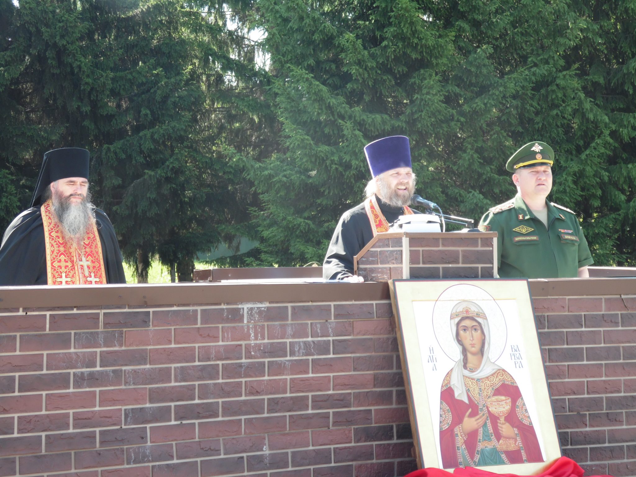 Перед военнослужащими выступили: командир дивизии Драй Ю.В. руководитель епархиального отдела по взаимодействию с Вооруженными Силами и правоохранительными органами Козельской епархии иерей Николай Кузнецов и насельник Оптиной Пустыни иеромонах Силуан. Был отслужен краткий молебен и вознесена молитва великомученице Варваре. Икона и военнослужащие окроплены святой водой.