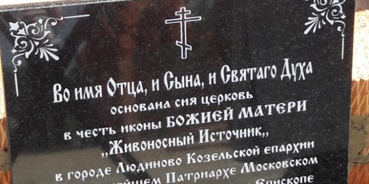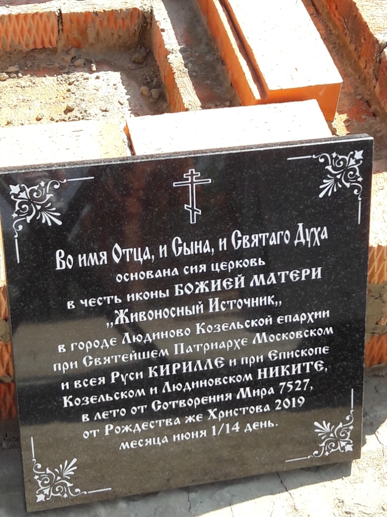 14 июня 2019 года по благословению Преосвященного Никиты, епископа Козельского и Людиновского настоятелем Казанского собора города Людиново митрофорным протоиереем Алексием Жигановым на улице Механизаторов в городе Людиново, на месте нового храма в честь иконы Божией Матери «Живоносный Источник», совершено богослужение при основании (закладке) храма, так называемый чин, бываемый при основании Церкви и водружении Креста.