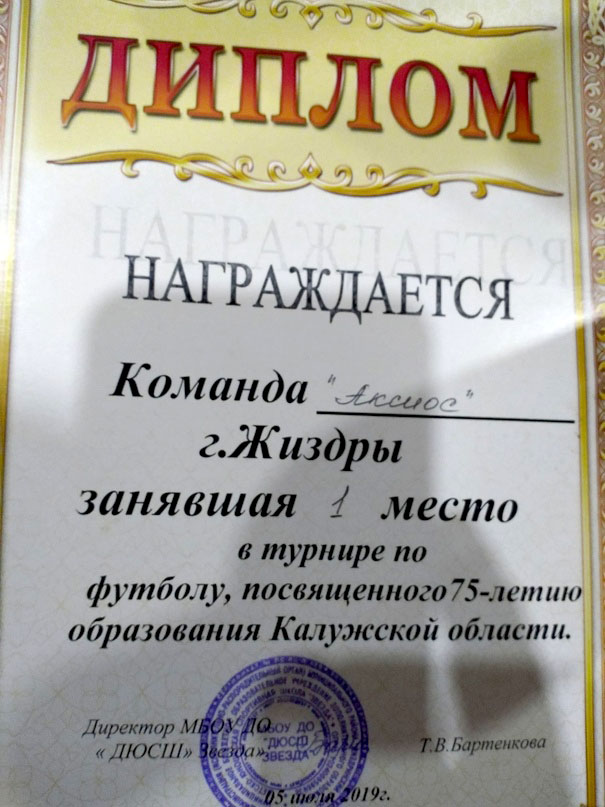5 июля в городе Жиздре прошел турнир по футболу, посвященный 75-летию образования Калужской области. По итогам соревнования уверенную победу одержала команда «Аксиос». Капитану команды, руководителю комиссии по физкультуре и спорту Козельской епархии, иерею Артемию Арутюняну были вручены диплом и кубок победителей. Лучшим игроком команды признан диакон Евгений Васильев. Лавры в номинации «Лучший вратарь турнира» достались руководителю молодёжного отдела Козельской епархии иерею Алексию Ефименкову.