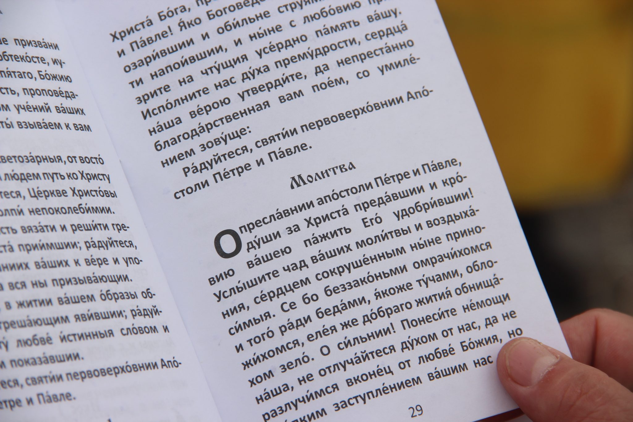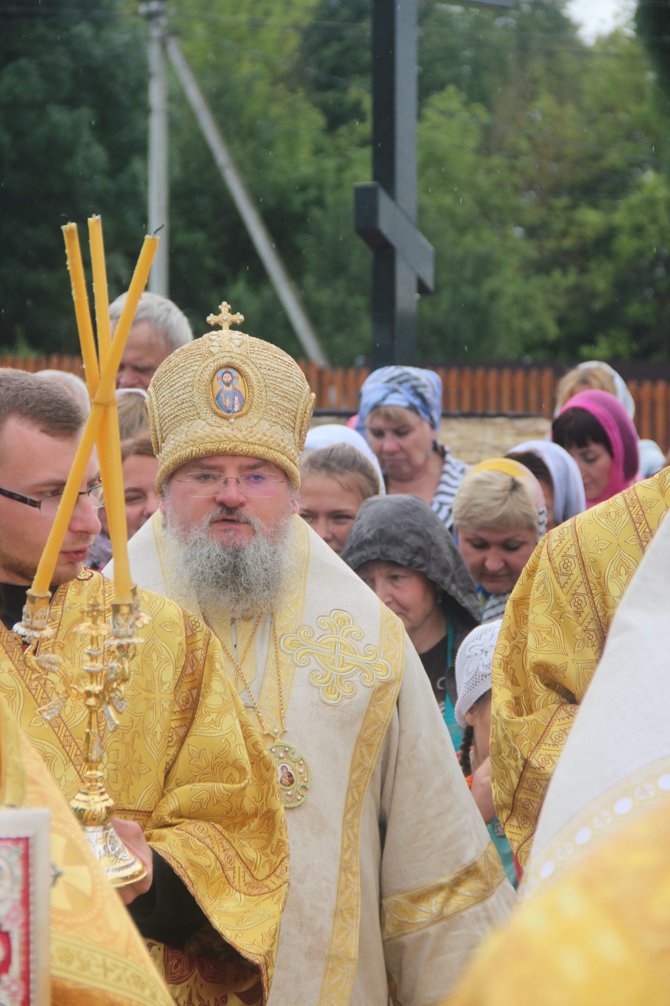 По опусте литургии состоялся праздничный крестный ход вокруг храма в завершении которого, сотворив молитву святым апостолам Петру и Павлу, владыка обратился к богомольцам с проповедью.