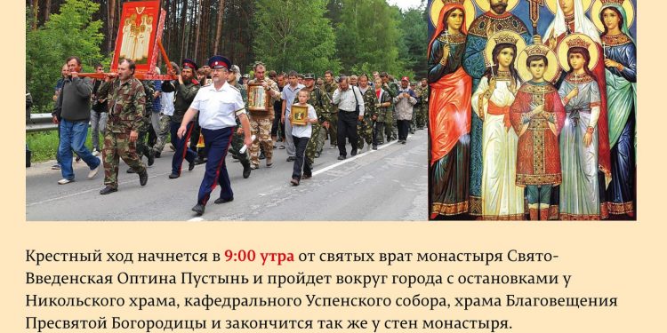 Крестный ход начнется в 9:00 утра от святых врат монастыря Свято Введенская Оптина Пустынь и пройдет вокруг города с остановками у Никольского храма, кафедрального Успенского собора, храма Благовещения Пресвятой Богородицы и закончится так же у стен монастыря. Общая протяженность пути составит 20 километров.