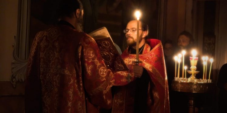 Песнопения исполнил мужской хор Сретенской духовной семинарии.