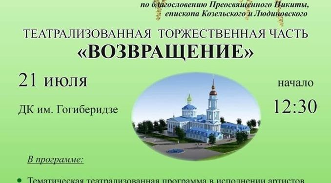 21 июля в городском Доме Культуры имени Гогиберидзе города Людиново состоялось праздничное торжественное театрализованное представление посвященное 20-ти летию возобновления богослужений в Казанском соборе.
