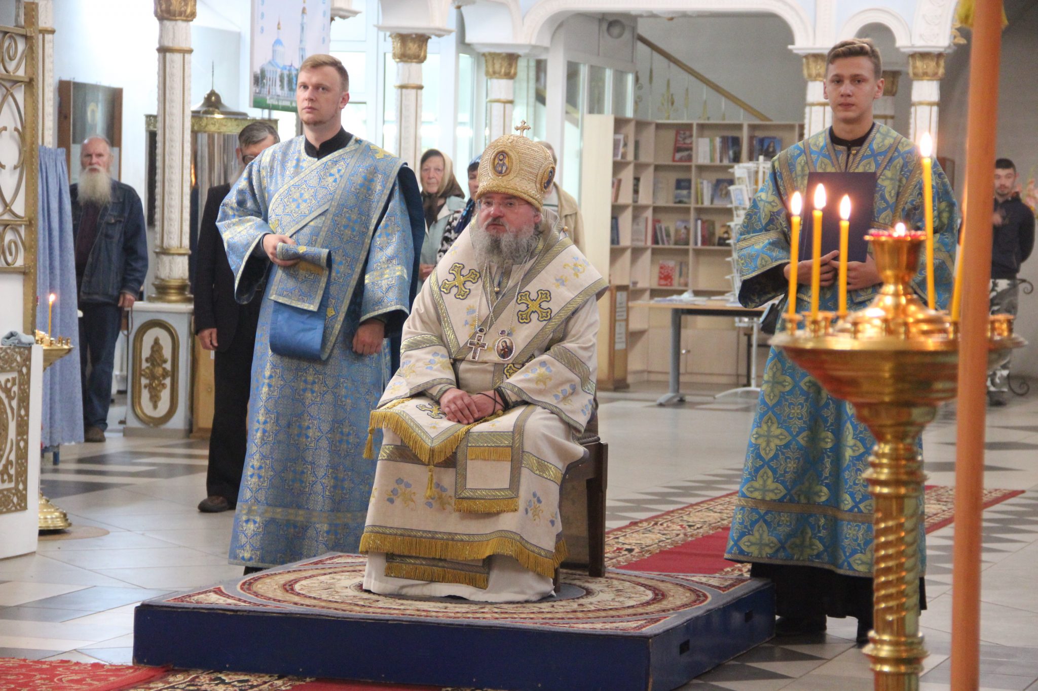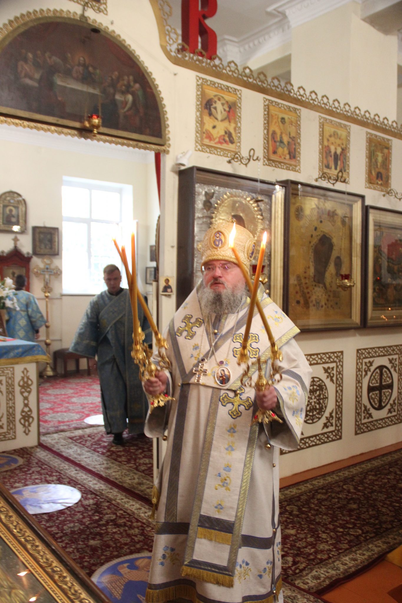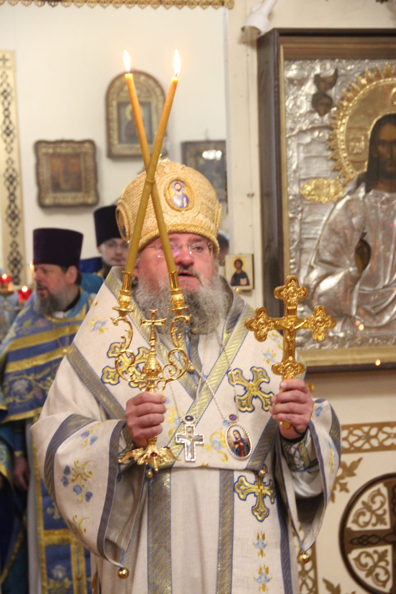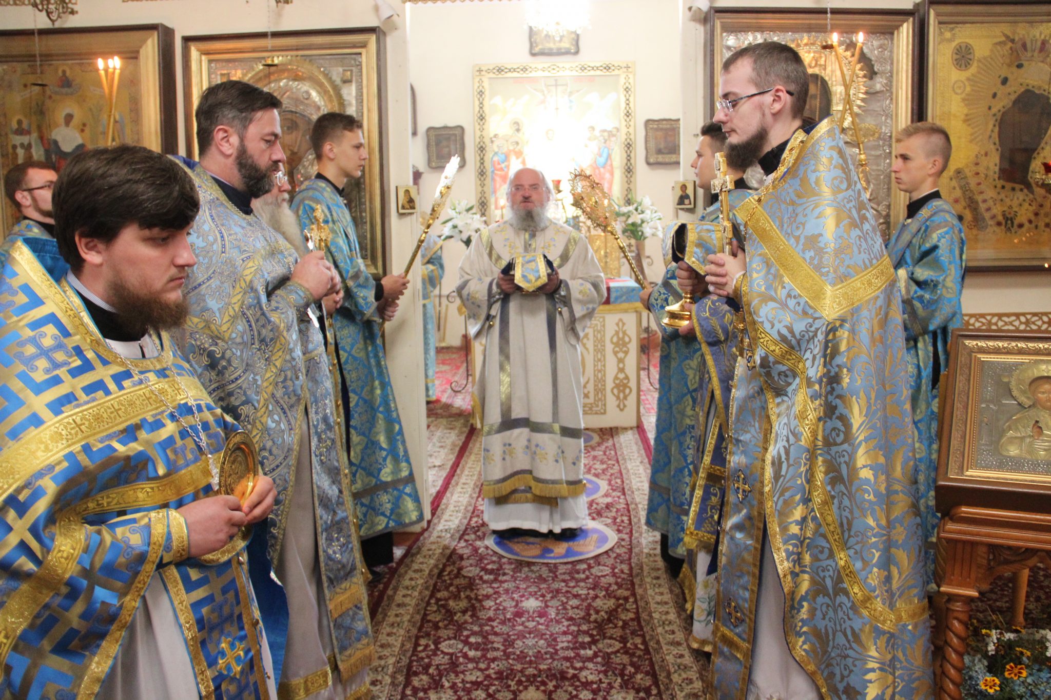 По отпусте литургии священнослужители совершили славление Божией Матери, а затем владыка обратился к богомольцам к архипастырским словом.