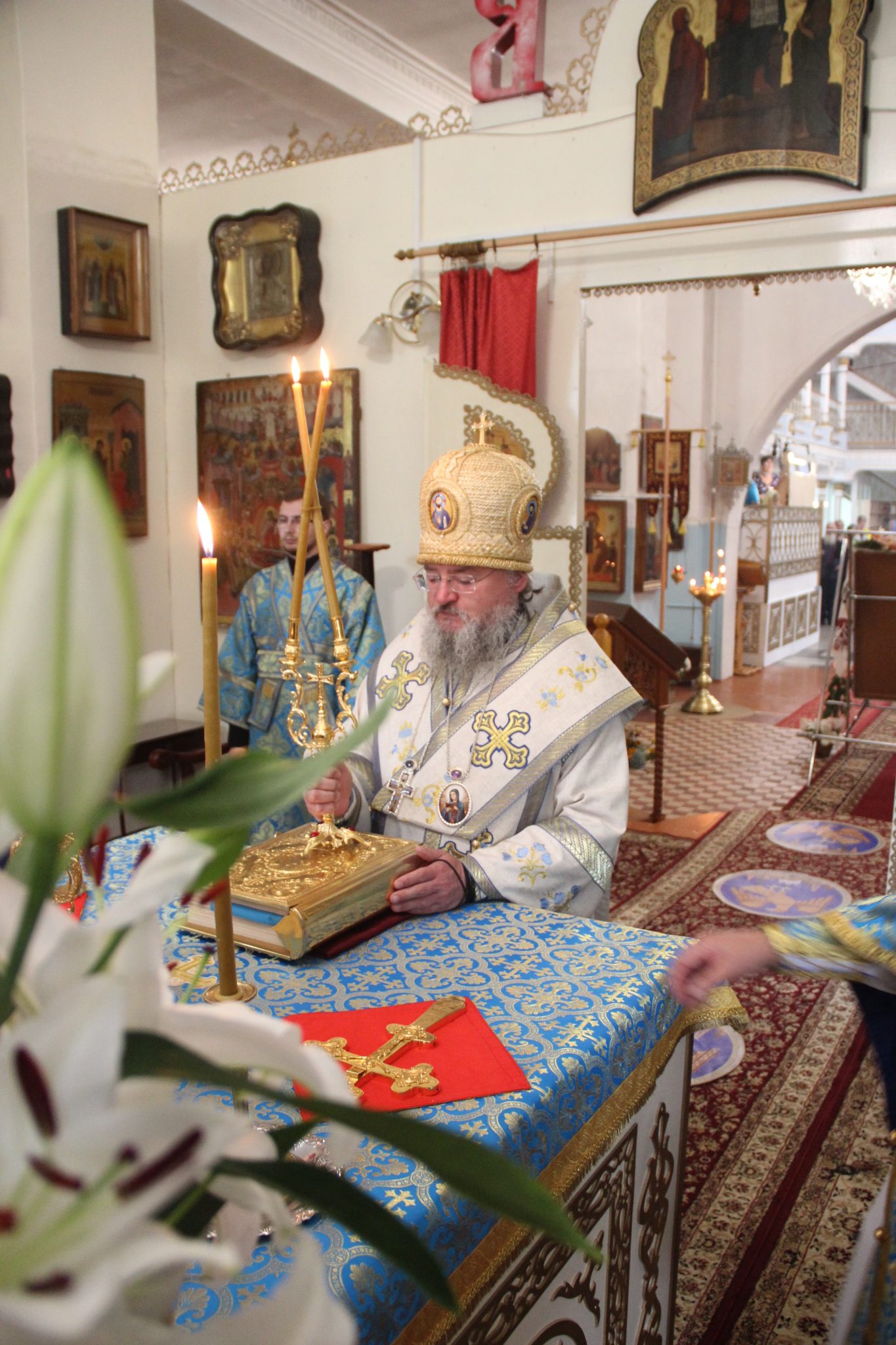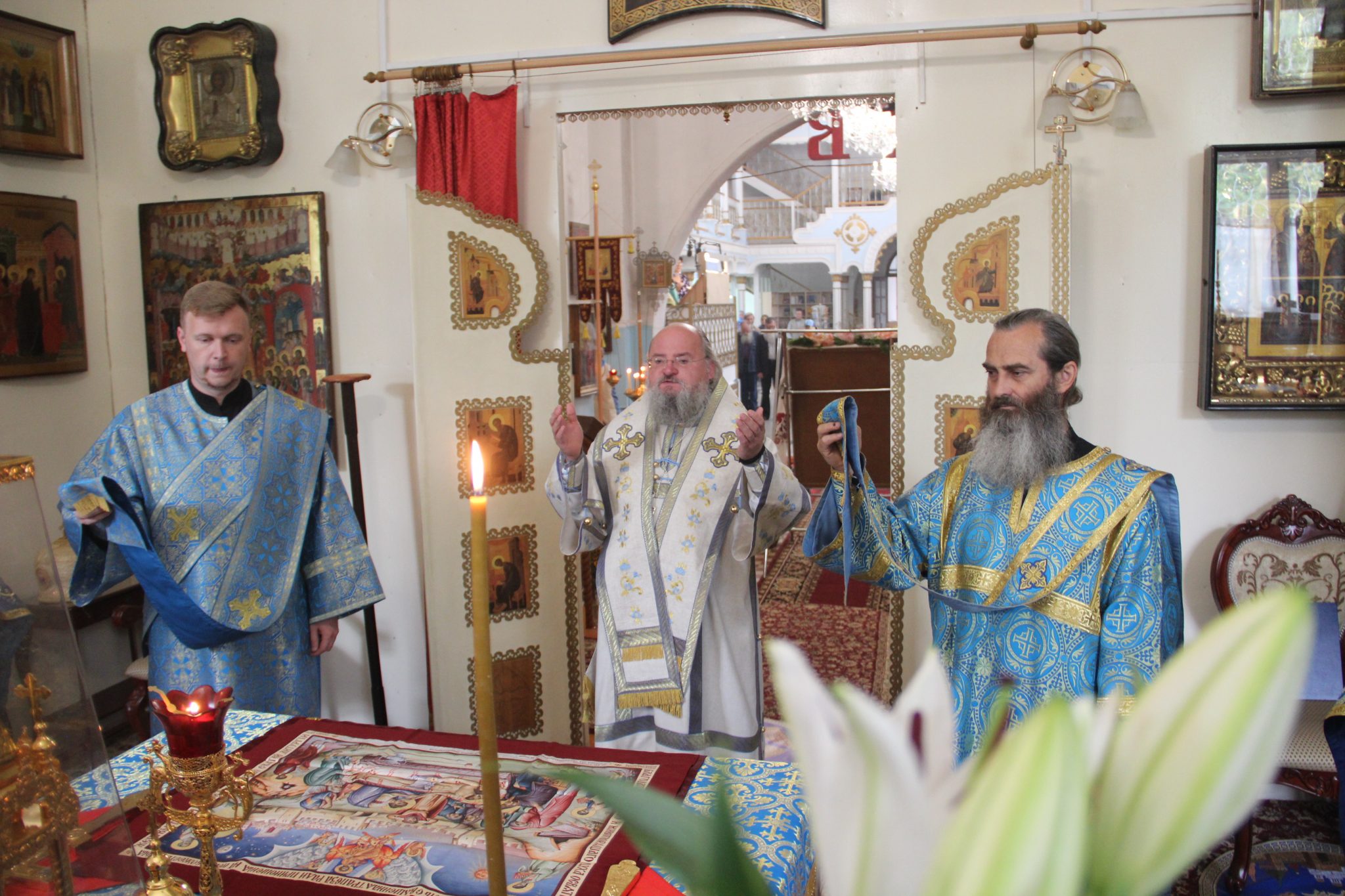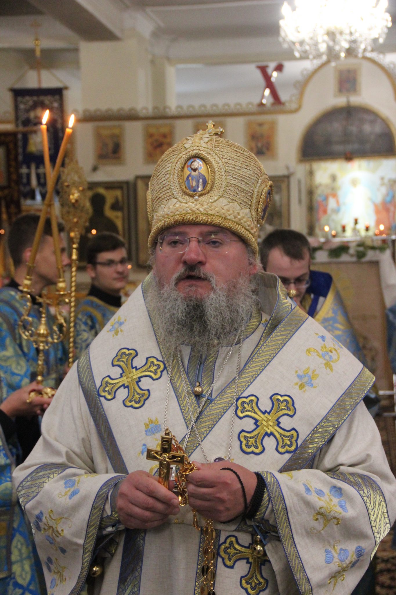 По отпусте литургии священнослужители совершили славление Божией Матери, а затем владыка обратился к богомольцам к архипастырским словом.