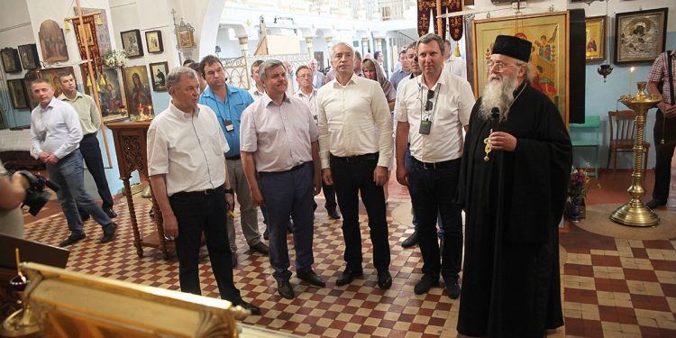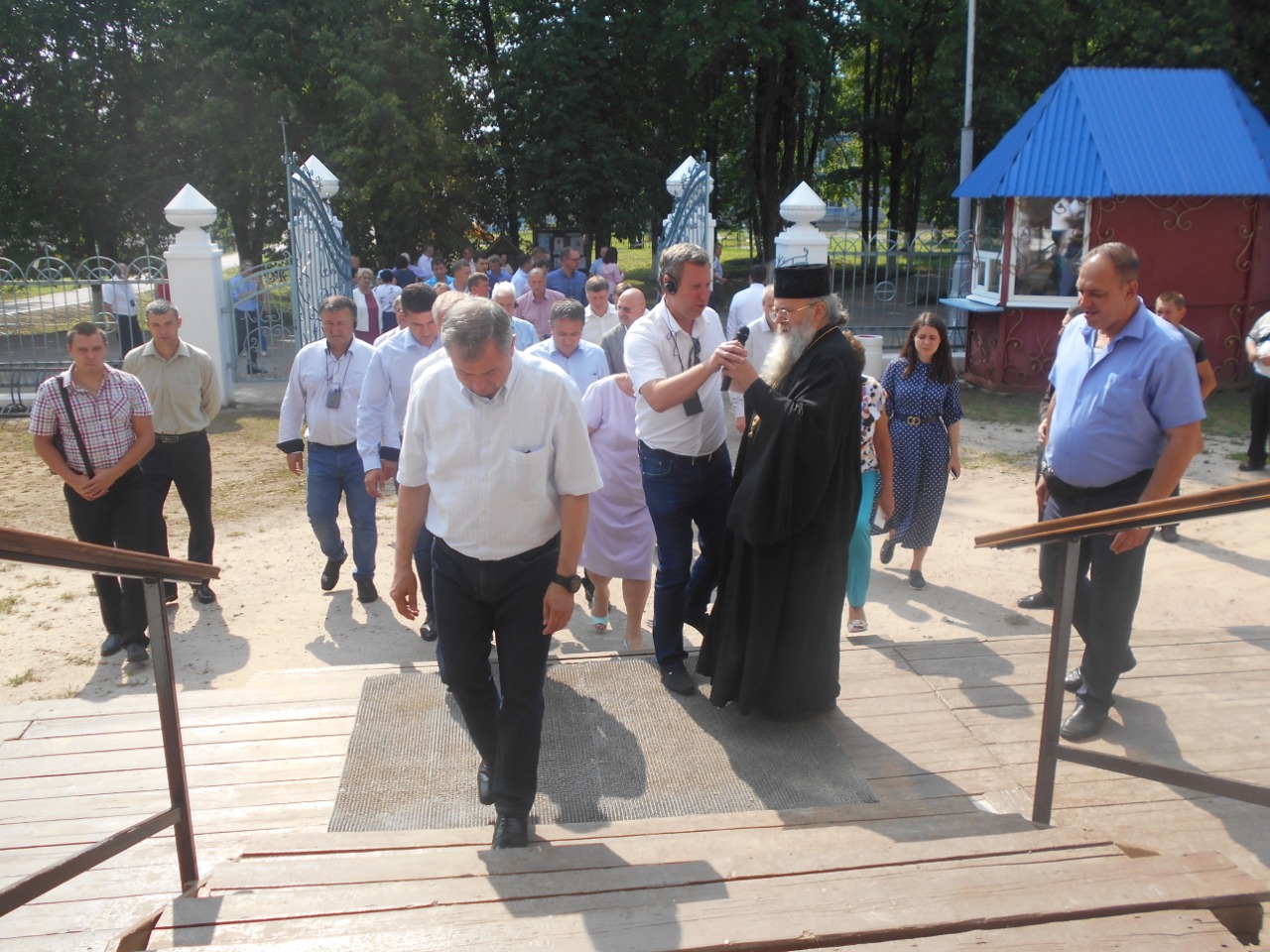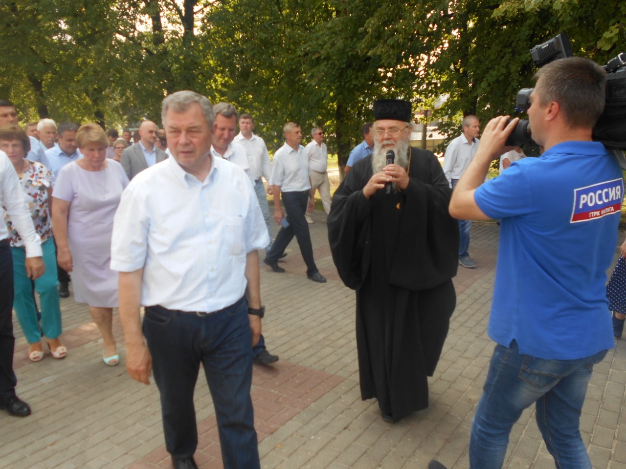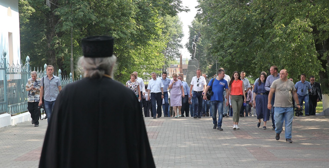 На территории Городского парка гости посетили Казанский кафедральный собор и православную выставку-ярмарку «Мир и Клир», проходящую в эти дни в Людиново.