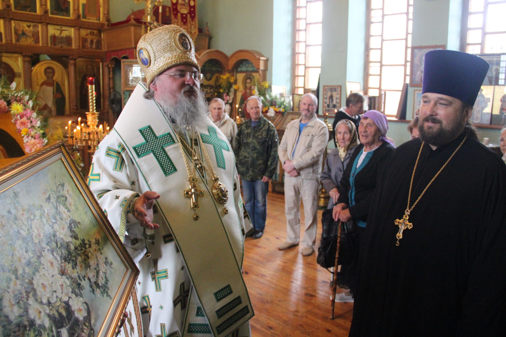 Владыка поздравил настоятеля храма отца Владимира Бахаева с прошедшими днем рождения и днем тезоименитства и преподнес ему в дар картину.