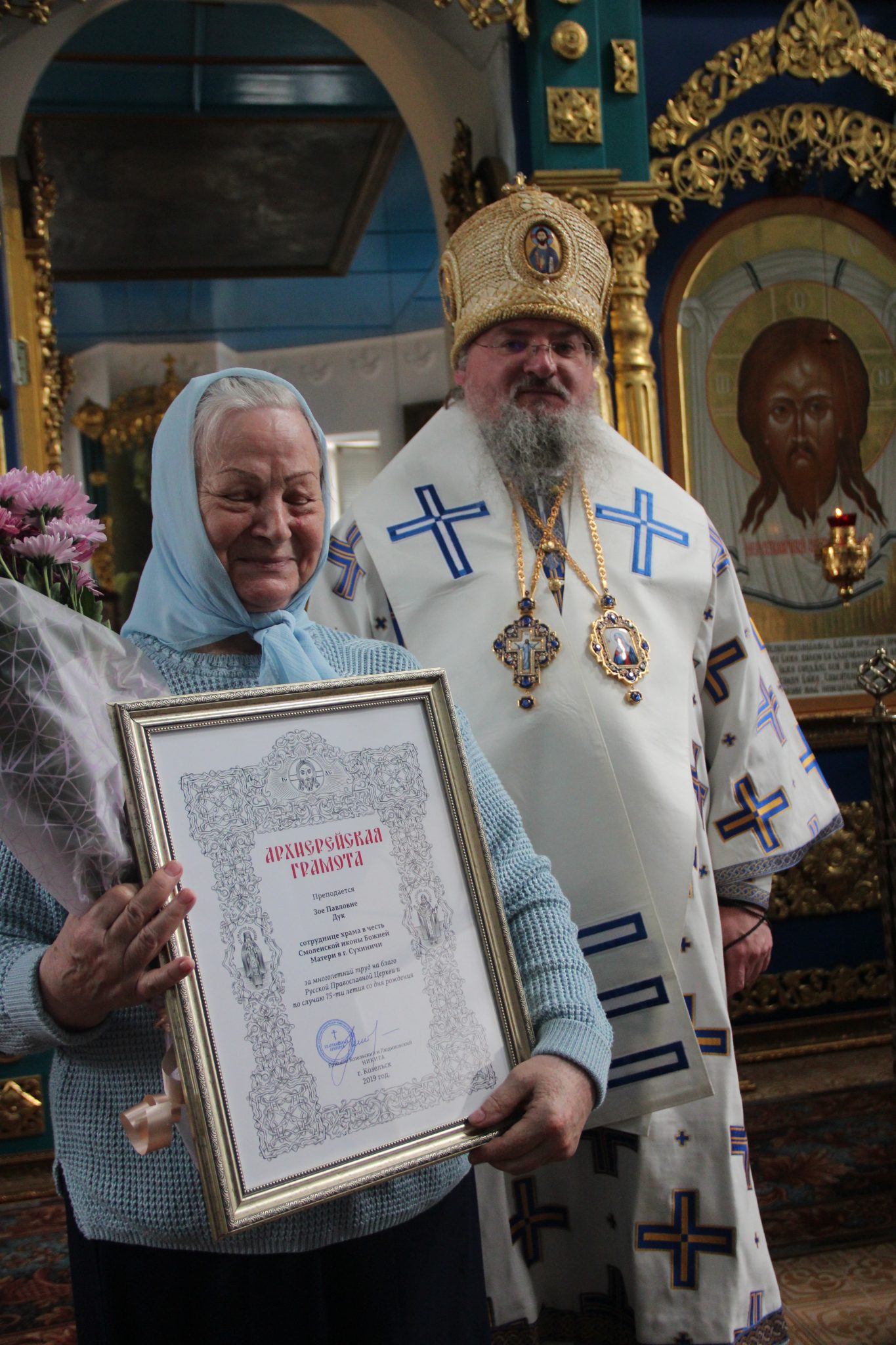 Сотрудники храма: Людмила Евгеньевна Некрасова и Зоя Павловна Дук во внимание к многолетним трудам на благо Церкви и в связи с юбилейными датами награждены Архиерейскими грамотами.