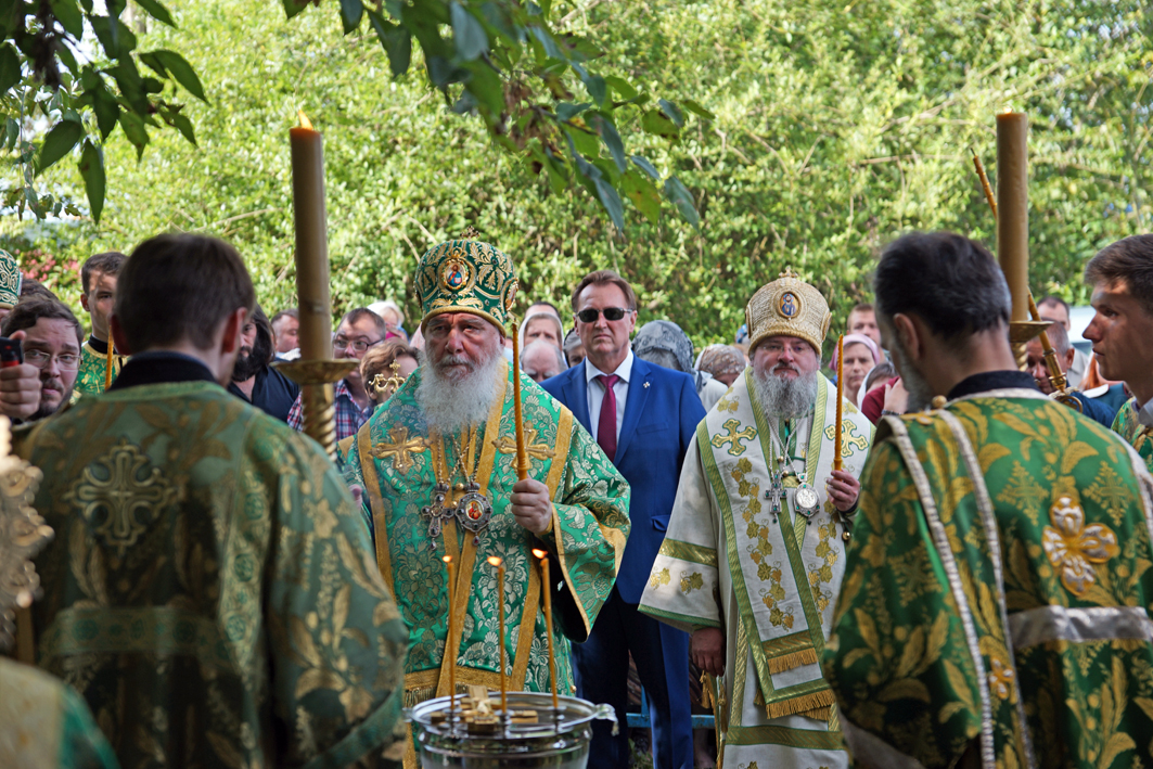 Литургия завершилась крестным ходом на святой источник праведного Лаврентия Калужского, где был отслужен водосвятный молебен. По преданию этот источник существует еще со времен святого, и для многих жителей этих мест он являлся «целительным для душ и телес». После освящения преосвяшенные архипастыри с молитвой окропили верующих святой водой, призывая на всех благодать Святого Духа и покровительство святого Лаврентия.