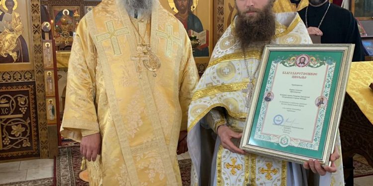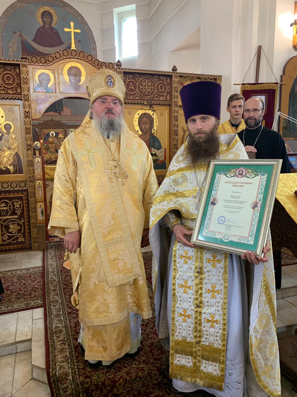 В ознаменование пятилетия иерейской хиротонии клирику xрама иерею Алексию Ефименкову владыка вручил благодарственное архиерейское письмо.