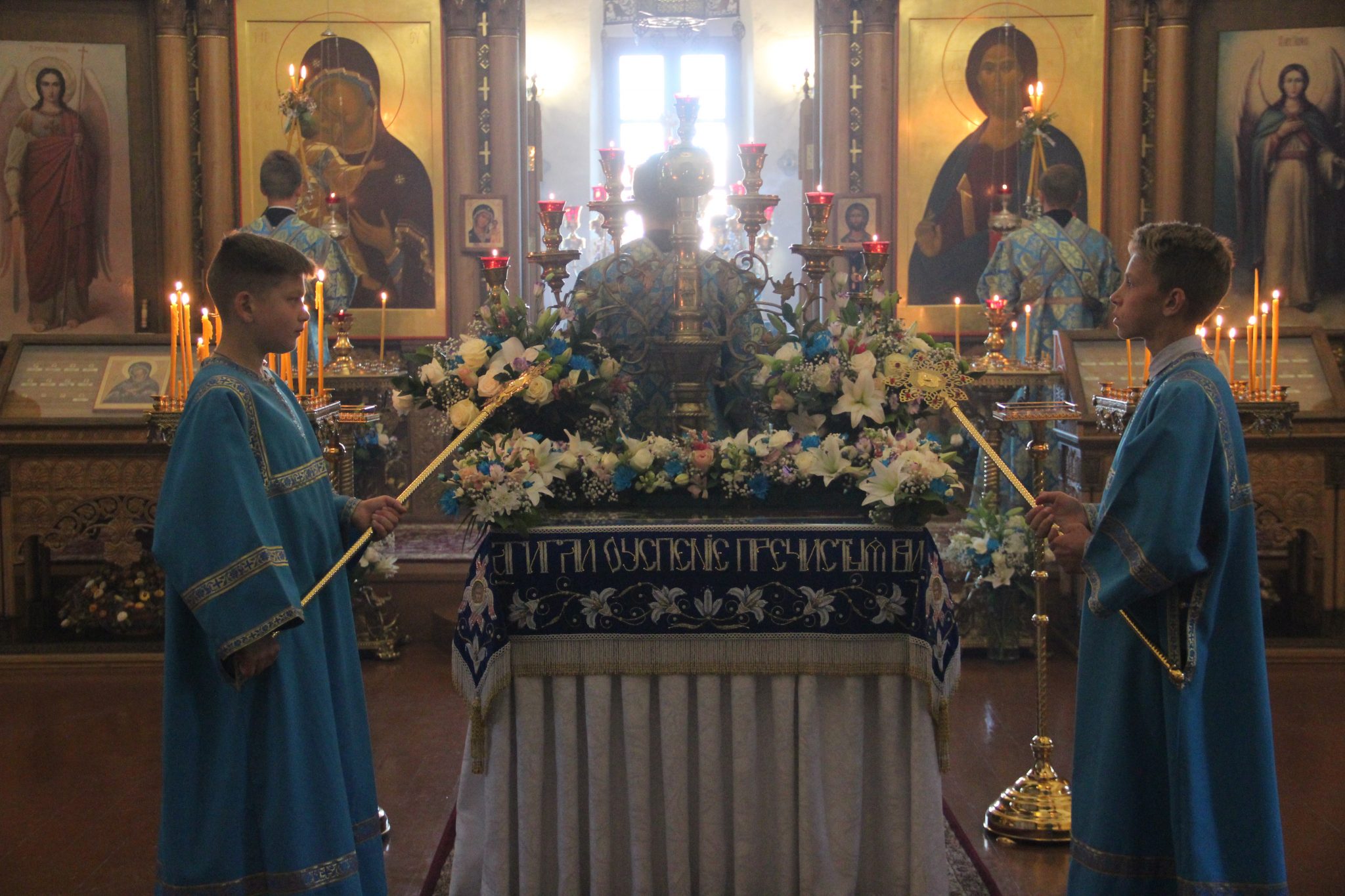 27 августа, накануне великого двунадесятого праздника Успения Пресвятой Владычицы нашей Богородицы, епископ Козельский и Людиновский Никита совершил всенощное бдение с освящением хлебов и чтением акафиста Успению Божией в Успенском кафедральном соборе города Козельска.