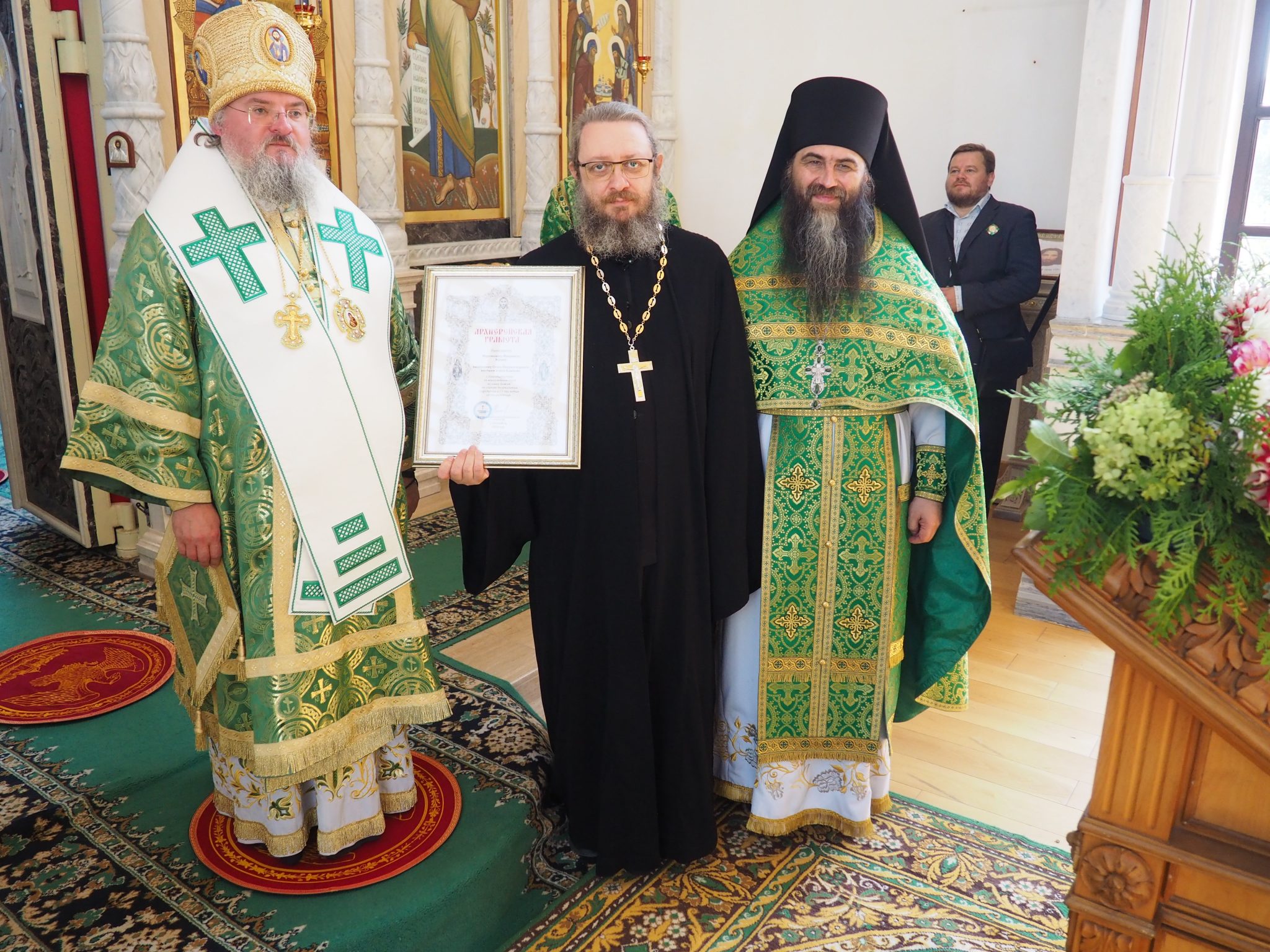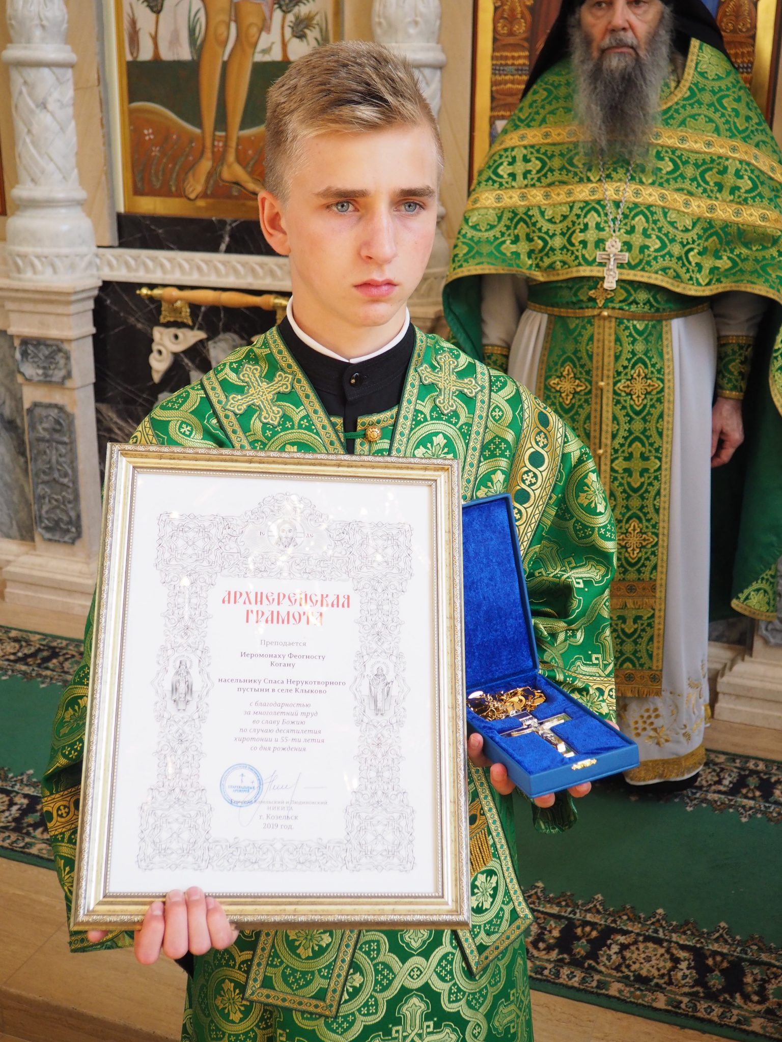 Другой насельник монастыря иеромонах Феогност (Коган) во внимание к усердным трудам во славу Святой Церкви и в связи с 55-летием со дня рождения был удостоен архиерейской грамоты.