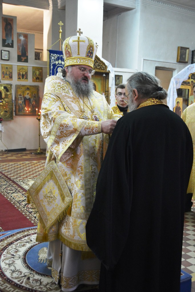 По завершении богослужения владыка вручил протоиерею Алексию Жиганову, настоятелю Казанского собора, церковную награду — патриарший знак «700-летие Преподобного Сергия Радонежского»,  во внимание к трудам на благо Святой Церкви.