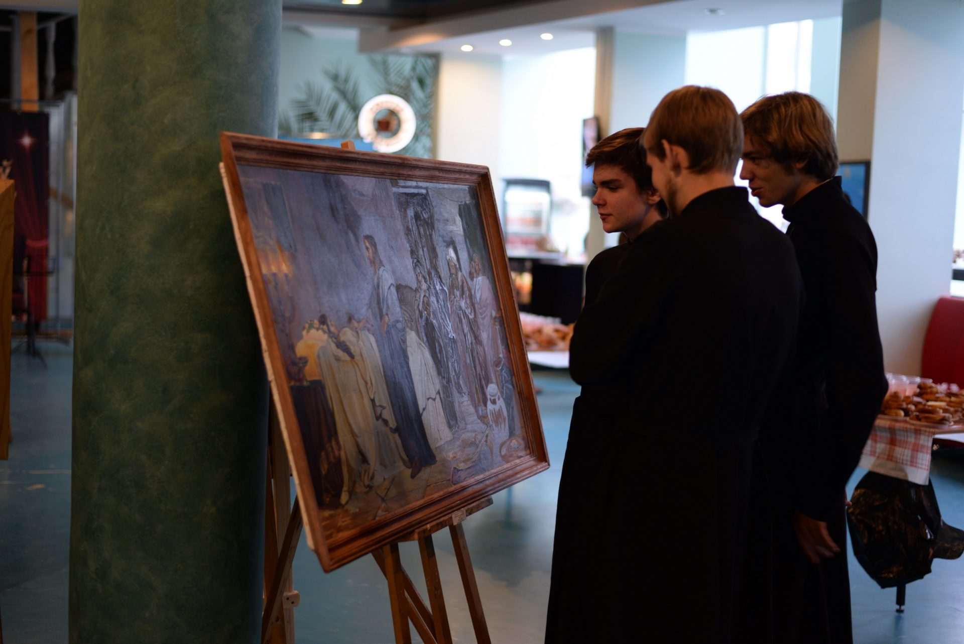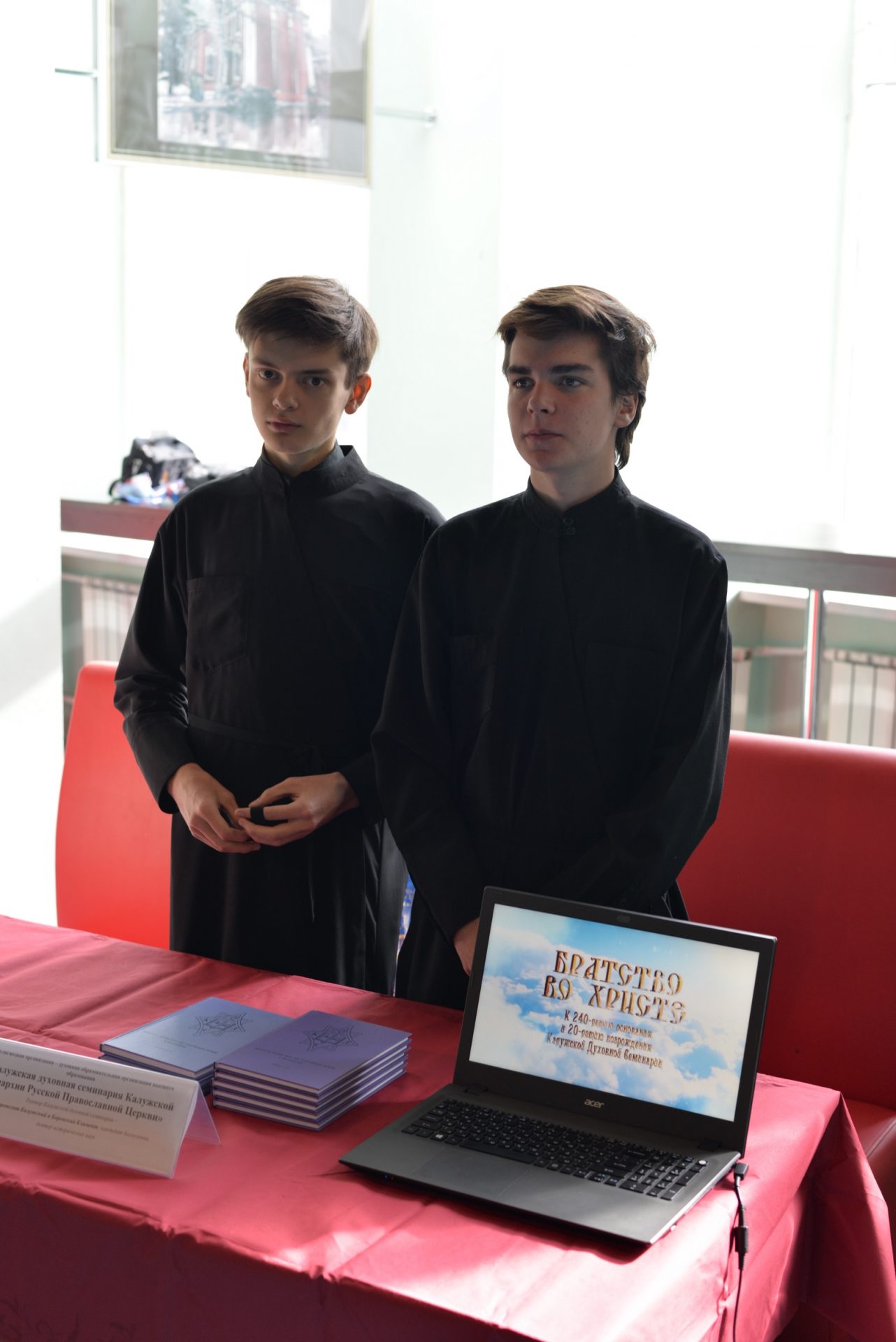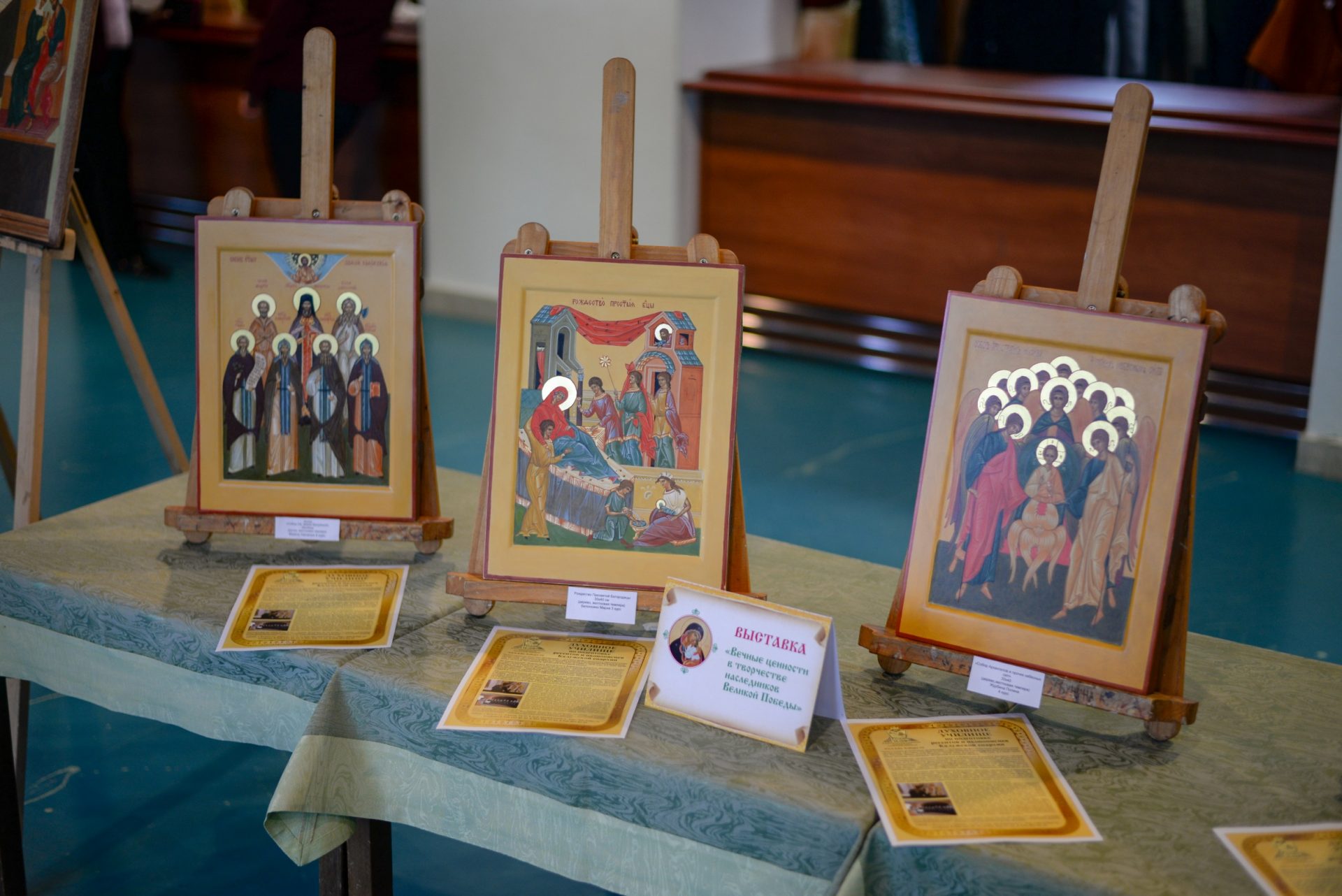 Перед началом чтений в фойе были представлены различные выставки, презентации и стендовые доклады. Особое внимание было уделено выставке «Вечные ценности в творчестве наследников Великой Победы» студентов Калужского духовного училища.