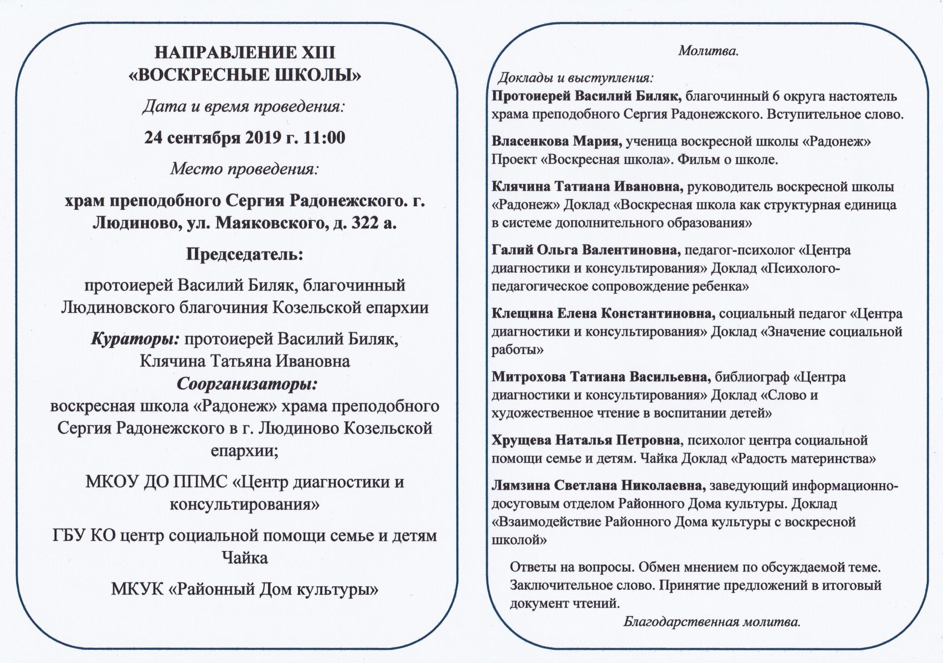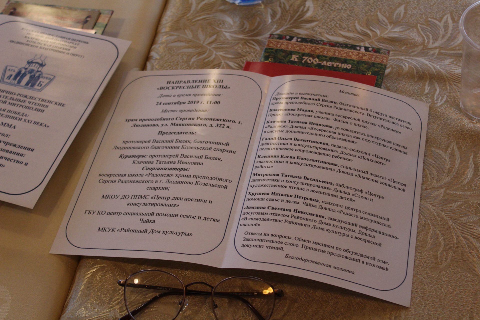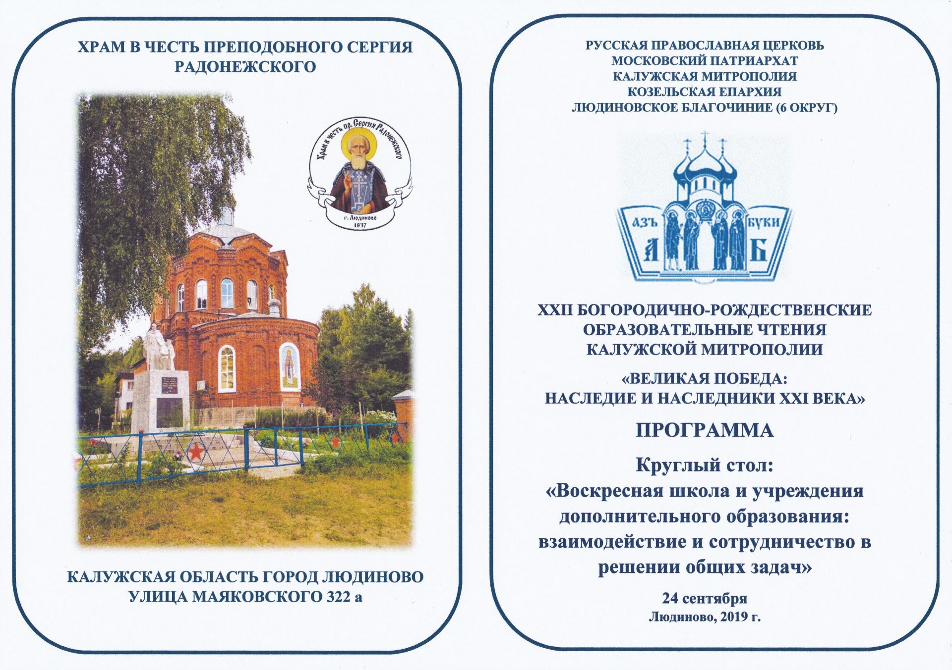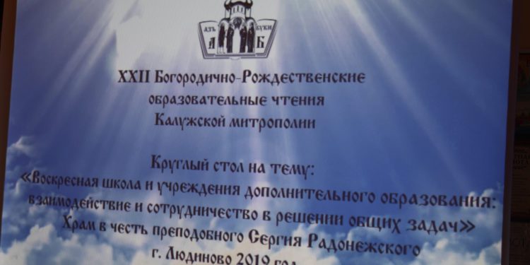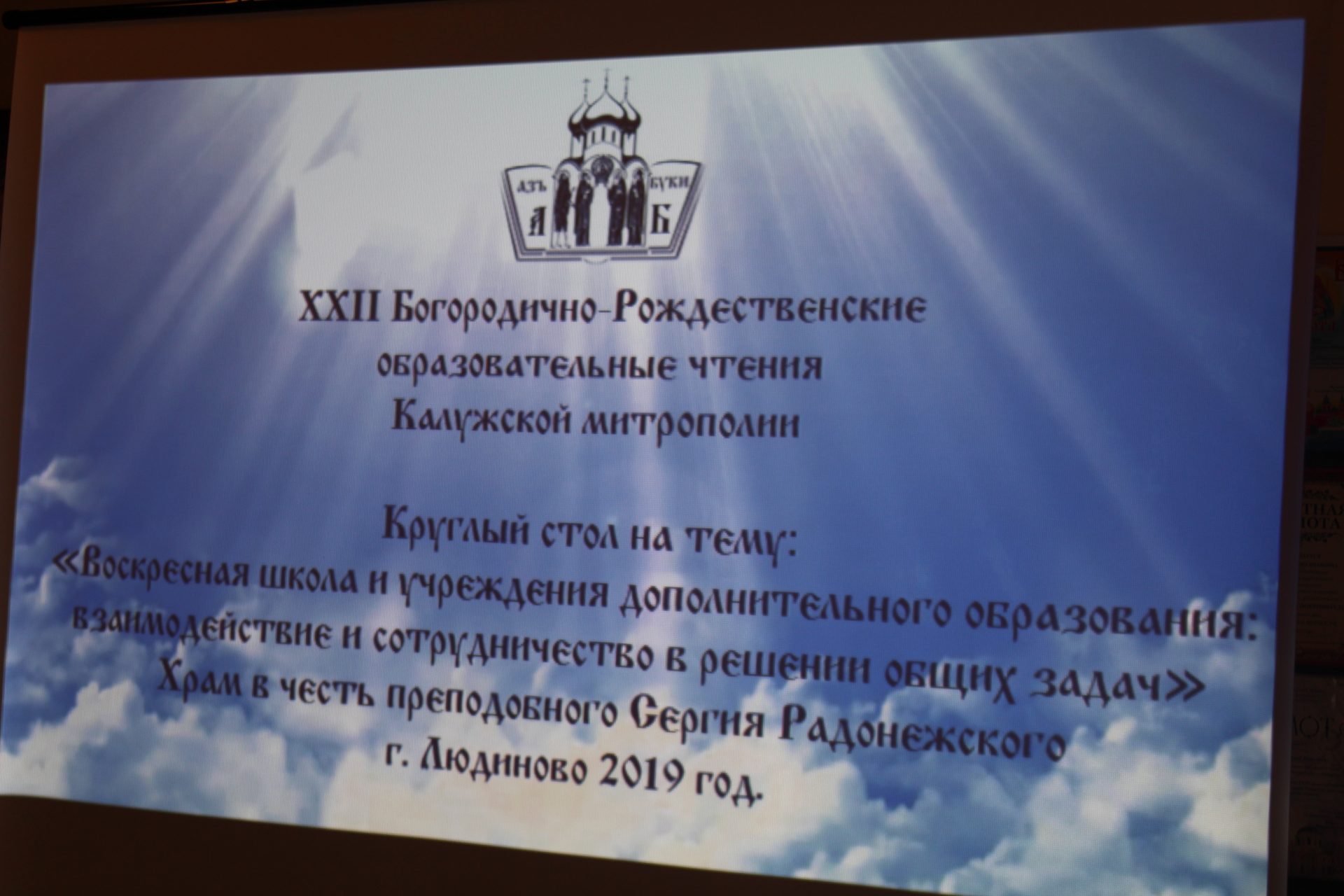 24 сентября в воскресной школе «Радонеж» храма преподобного Сергия Радонежского города Людиново под председательством благочинного 6 округа настоятеля храма преподобного Сергия Радонежского протоиерея Василия Биляк в рамках XXII Богородично-Рождественских образовательных чтений Калужской митрополии состоялся круглый стол : «Воскресная школа и учреждения дополнительного образования: взаимодействие и сотрудничество в решении общих задач».
