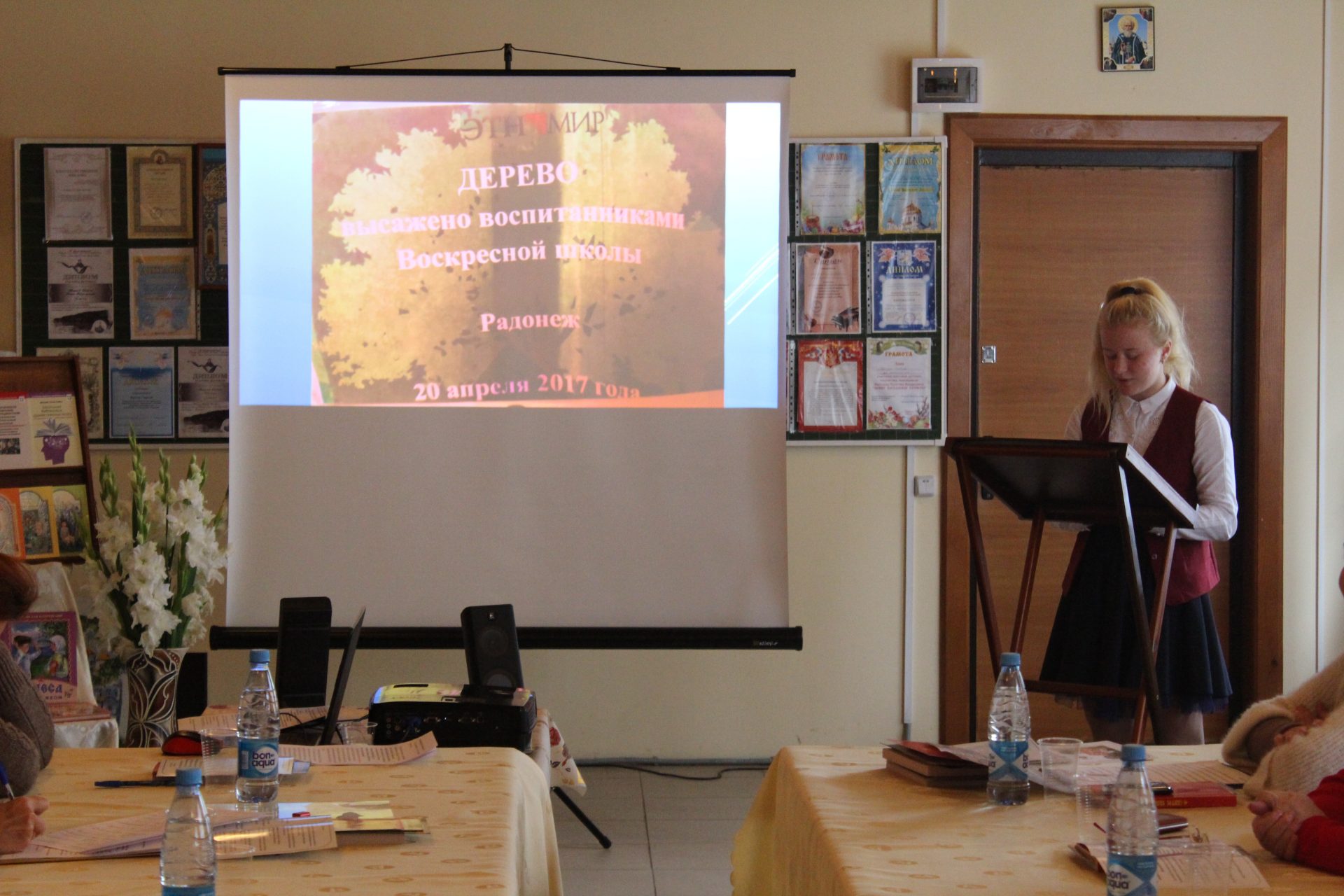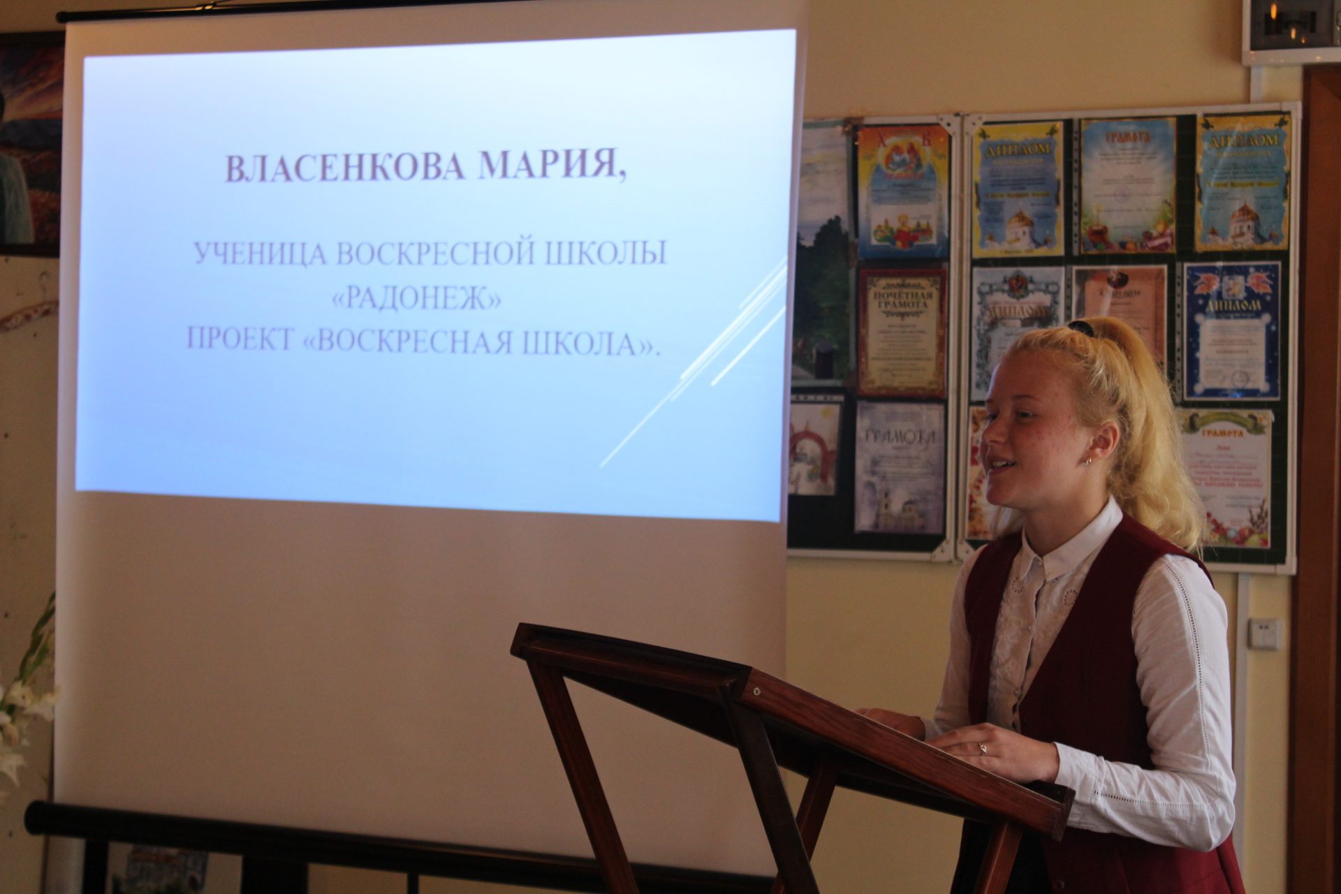 1) Всем участникам был представлен фильм о воскресной школе «Радонеж», ученица школы Власенкова Мария представила проект «Воскресная школа»;