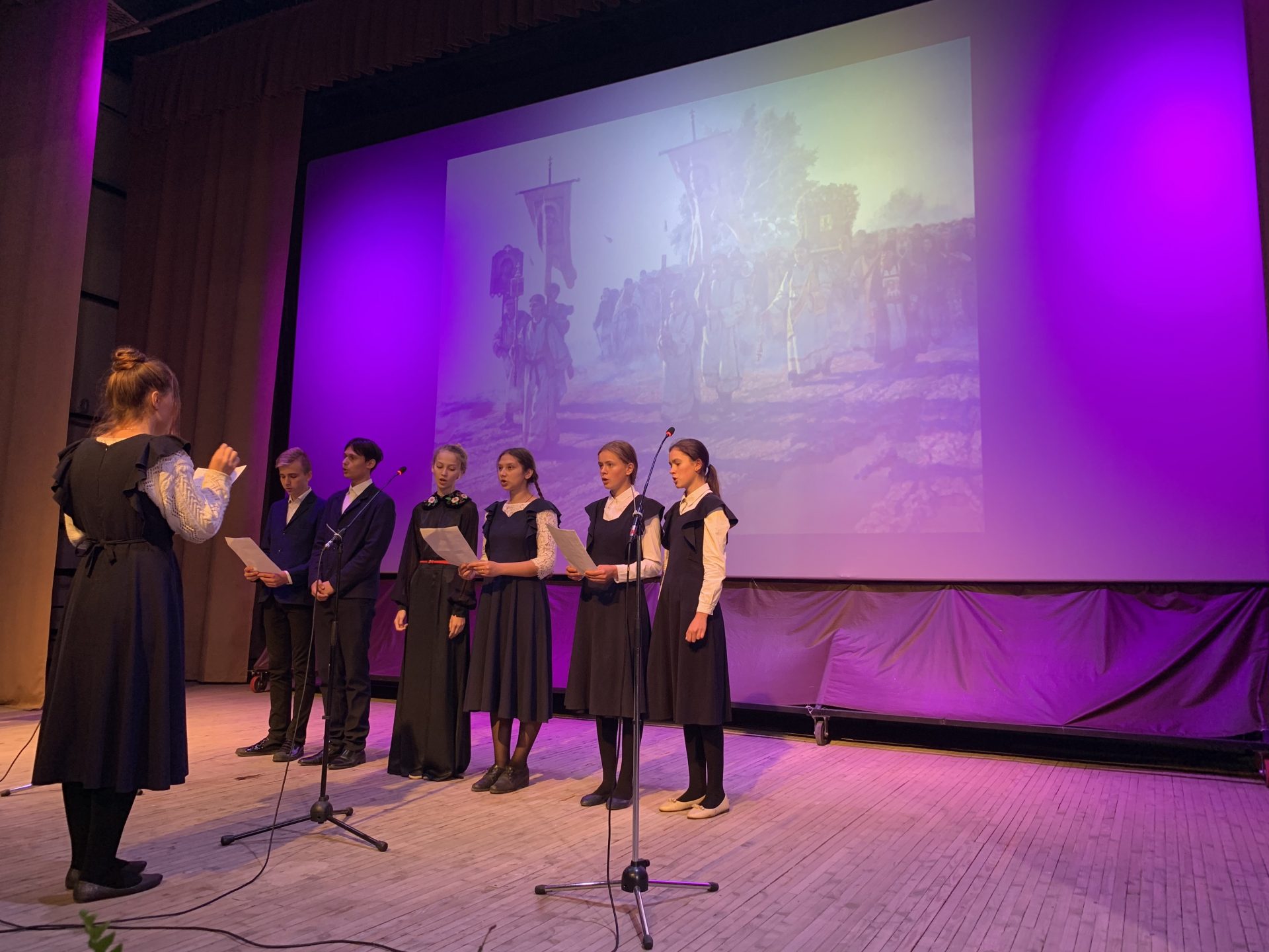 Затем состоялось музыкальное приветствие Козельской школы искусств. В исполнении преподавателей прозвучала песня «Над тихой рекою», а учащаяся Козельской православной гимназии Мария Павлова исполнила балладу о матери. Хор гимназии исполнил стихиру «Земле русская».