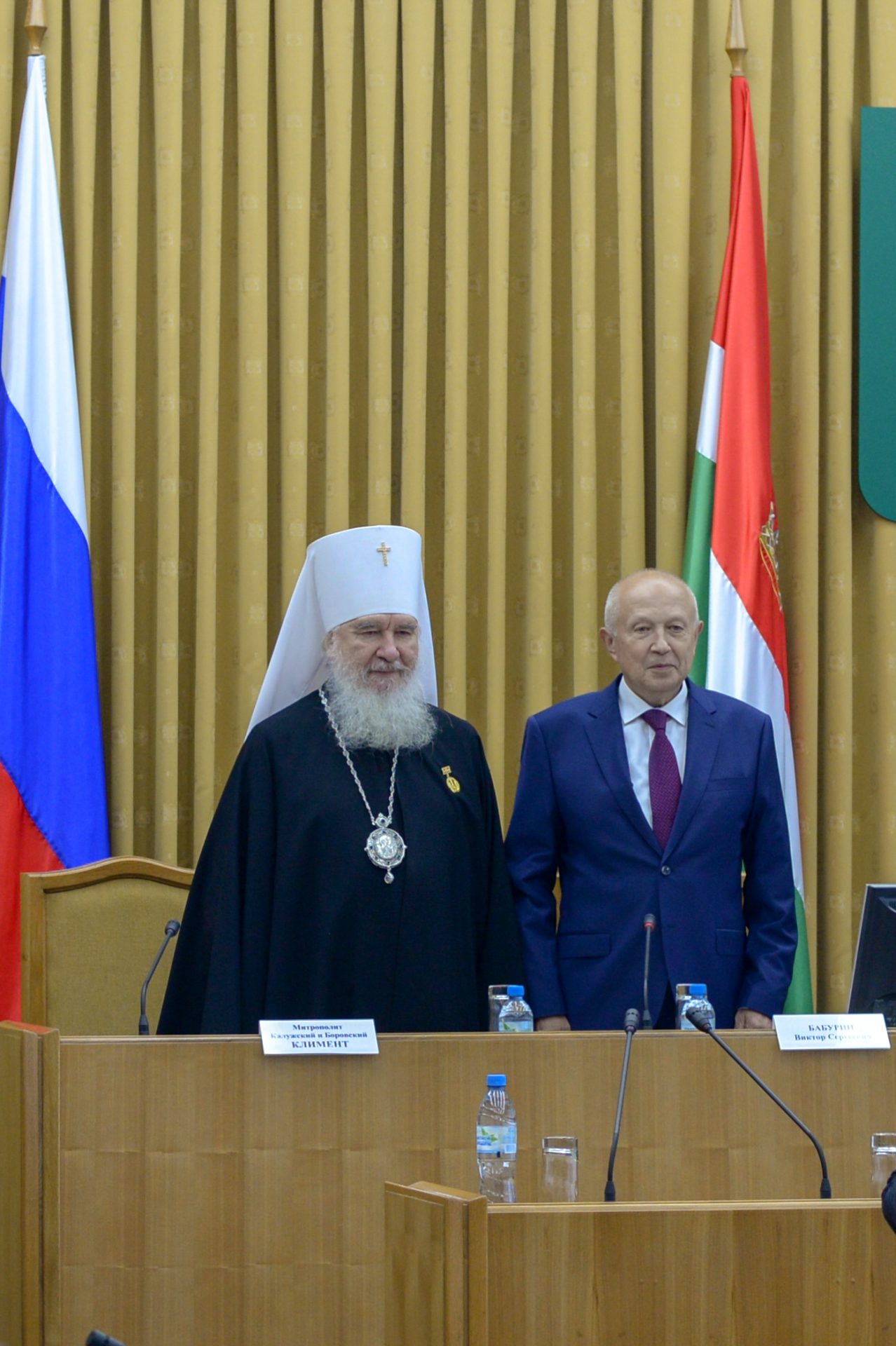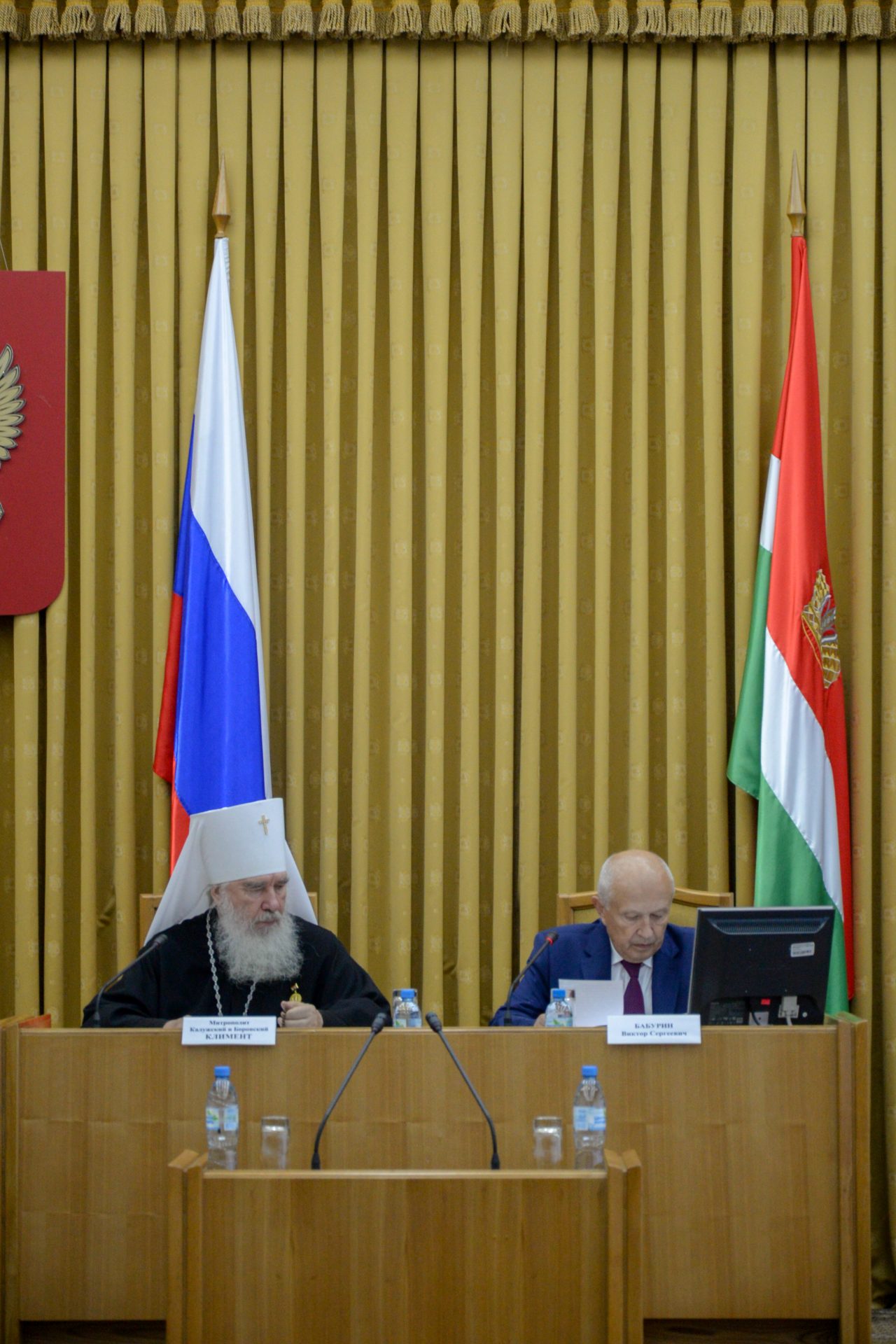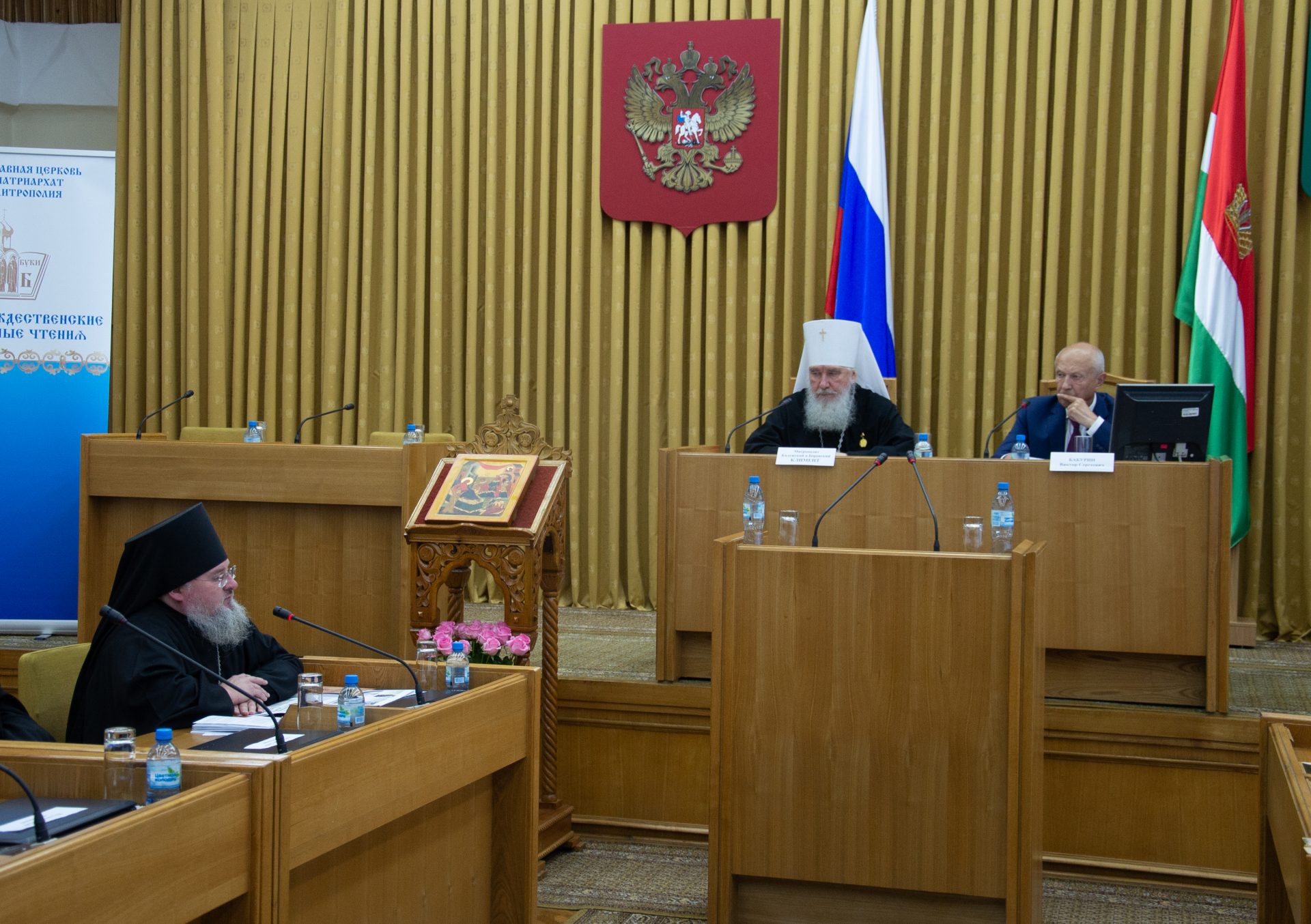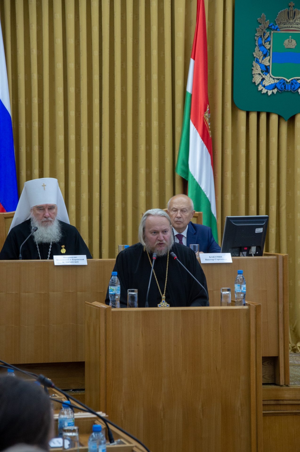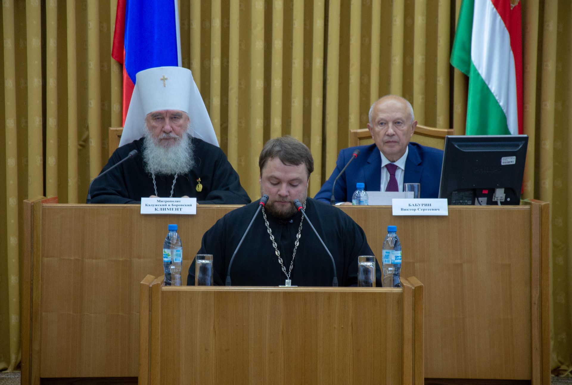 Открыли заседание митрополит Калужский и Боровский Климент, председатель Издательского совета Русской Православной Церкви, Глава Калужской митрополии и Бабурин Виктор Сергеевич, Председатель Законодательного Собрания Калужской области.