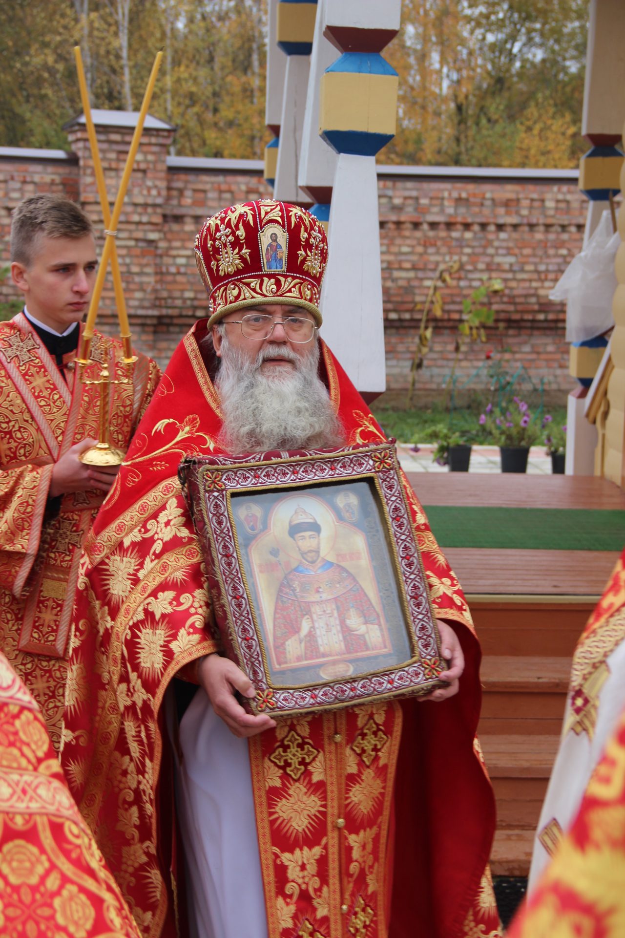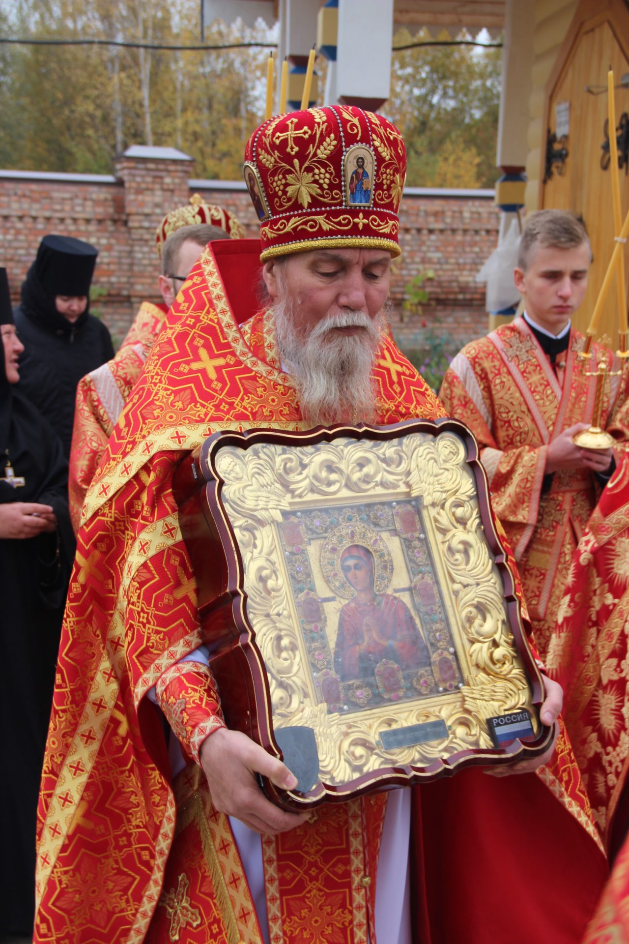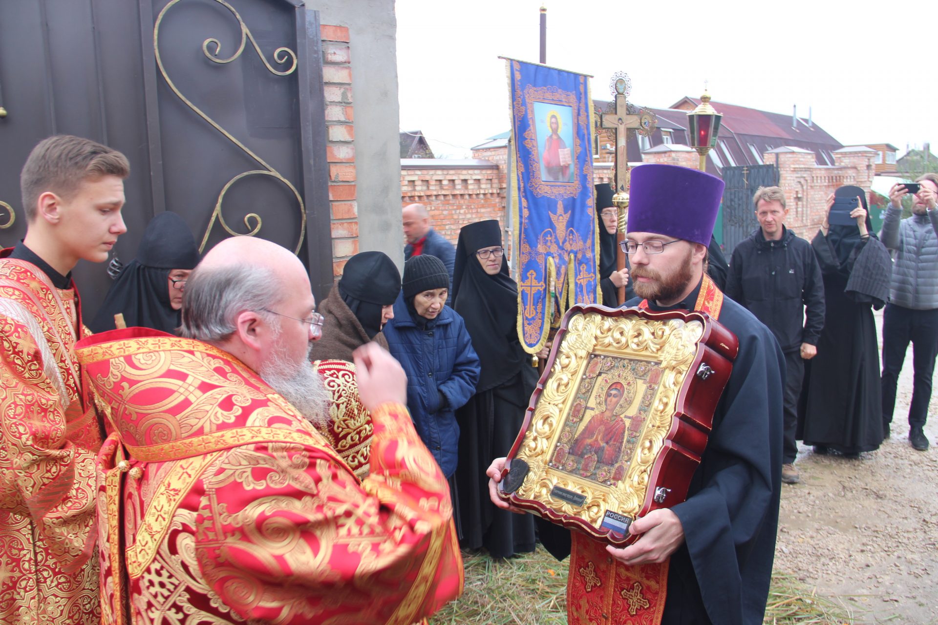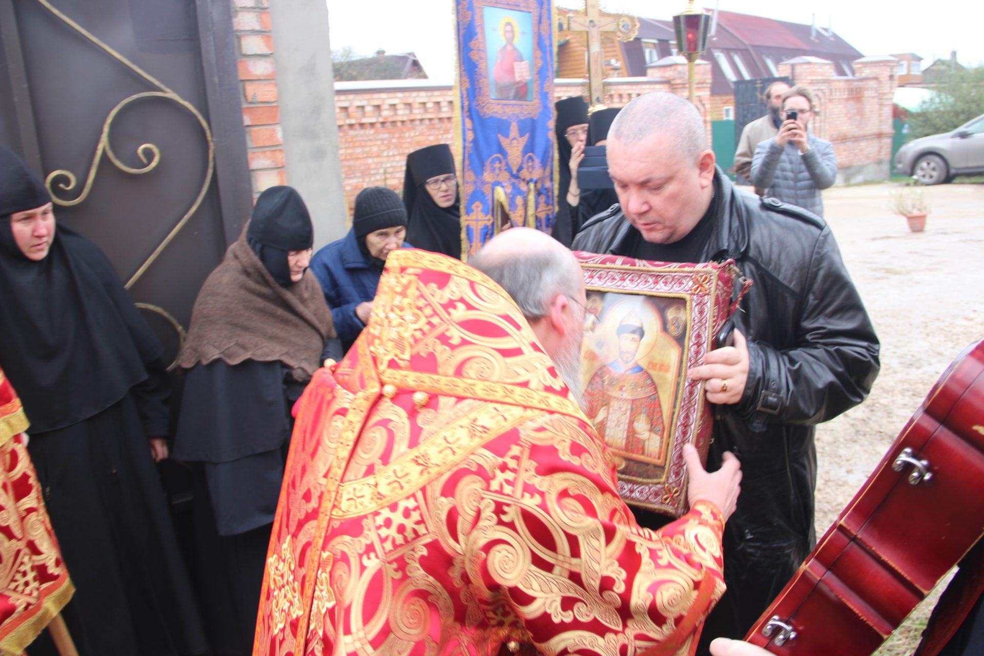 Перед началом литургии священнослужители крестным ходом вышли к воротам монастыря , чтобы встретить святыни, прибывшие в этот праздничный день во святую обитель – мироточивые иконы Божией Матери «Умягчение злых сердец» Донецкая и святого Страстотерпца Царя Николая.
