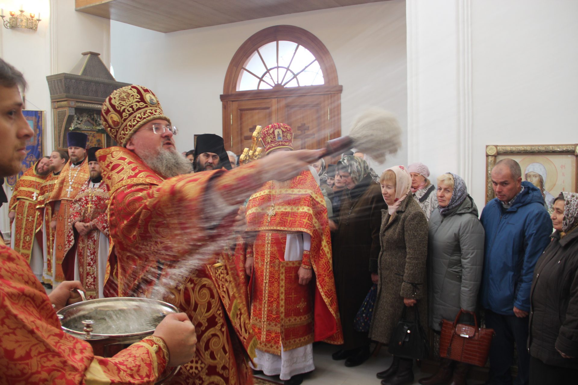По окончании литургии духовенство в центре храма пред праздничными иконами совершило торжественный молебен в конце которого, вознеся молитвы Божией Матери, святой равноапостольной Фекле и Страстотерпцу Царю Николаю, владыка окропил богомольцев святой водой, а затем были провозглашены уставные многолетия.