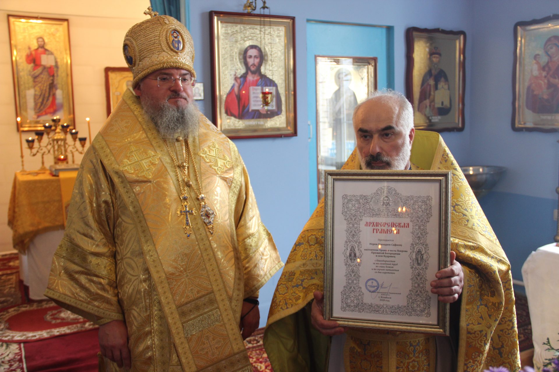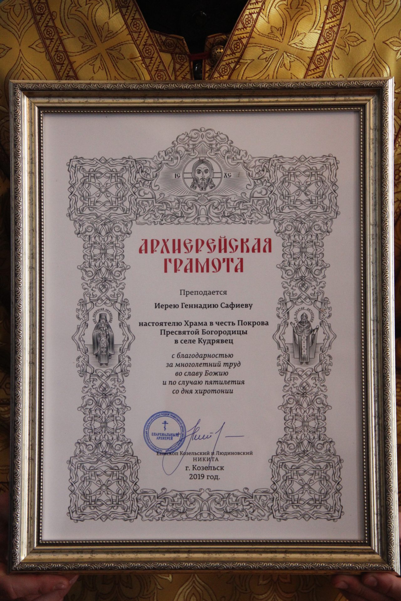 Во внимание к усердным трудам во славу Святой Церкви и в связи с пятилетием служения в священном сане настоятель храма иерей Геннадий Сафиев был награжден Архиерейской грамотой.