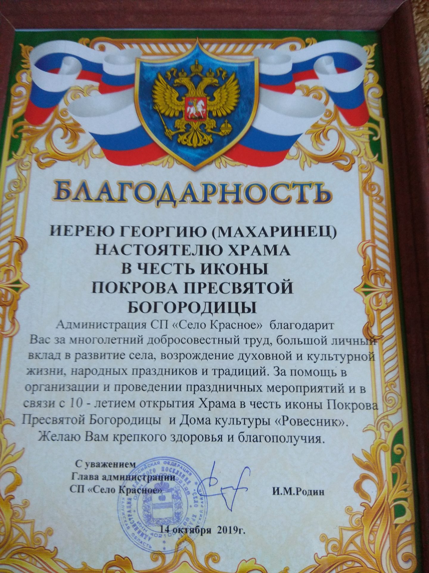 14 октября престольный Праздник отметил приход в честь Покрова Пресвятой Богородицы в селе Красное. Торжества начались накануне со всенощного бдения. Утром была отслужена Божественная Литургия, на которой настоятель храма иерей Георгий Махаринец вознёс молитву о мире на Украине. По окончании Божественной Литургии был отслужен молебен с крестным ходом вокруг храма. Иерей Георгий Махаринец поздравил всех присутствующих с праздником Покрова Пресвятой Богородицы, далее все прихожане были приглашены на праздничный концерт с чаепитием в сельский дом Культуры «Ровесник», который приготовила Брулева Татьяна Семёновна, заведующая ДК. На праздничном мероприятии администрация выразила благодарность жителям, предпринимателям и спонсорам всех праздничных событий села, в том числе благодарность была выражена настоятелю храма Покрова Пресвятой Богородицы в селе Красное иерею Георгию Махаринец, за многолетний добросовестный труд, большой личный вклад в развитие села, возрождение духовой и культурной жизни, народных праздников и традиций; за помощь в организации и проведении праздничных мероприятий и в связи с 10-летием открытия храма Покрова Пресвятой Богородицы и дома Культуры «Ровесник».
