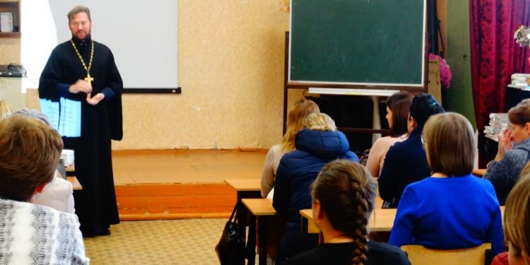 11 октября протоиерей Александр Карпов, настоятель храма Успения Пресвятой Богородицы села Хвастовичи, по просьбе преподавателя начальных классов Серёгиной Натальи Викторовны провёл беседу о духовно — нравственное воспитании школьников с преподавателями и родителями учеников младших классов на тему : » Посеешь привычку — пожнёшь характер». По окончании беседы батюшка ответил на вопросы родителей и поблагодарил за понимание в совместном воспитании детей.