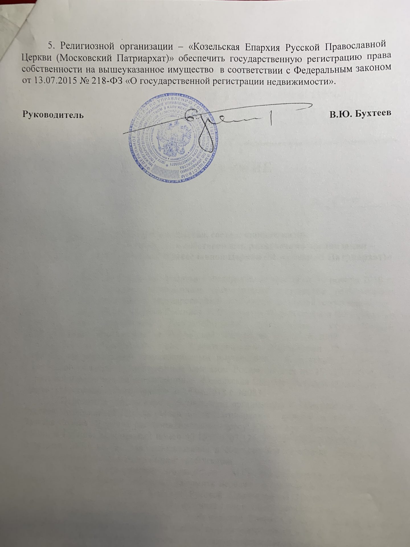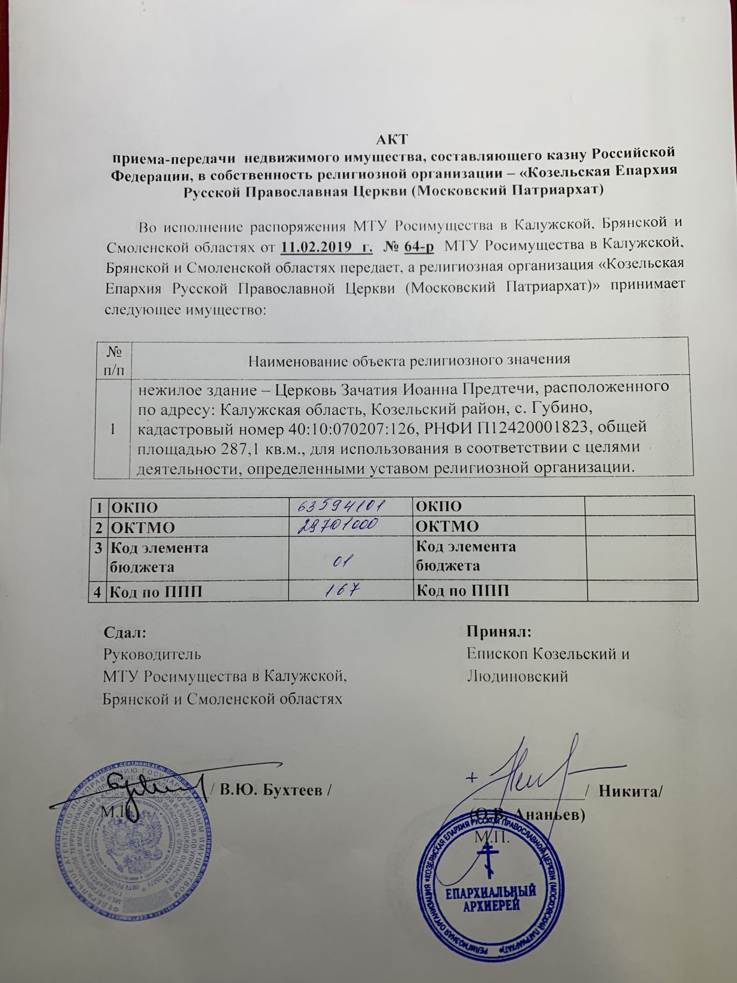 Акт подписали: Руководитель МТУ Росимущества в Калужской, Брянской и Смоленской областях Бухтеев Виталий Юрьевич и епископ Козельский и Людиновский Никита.