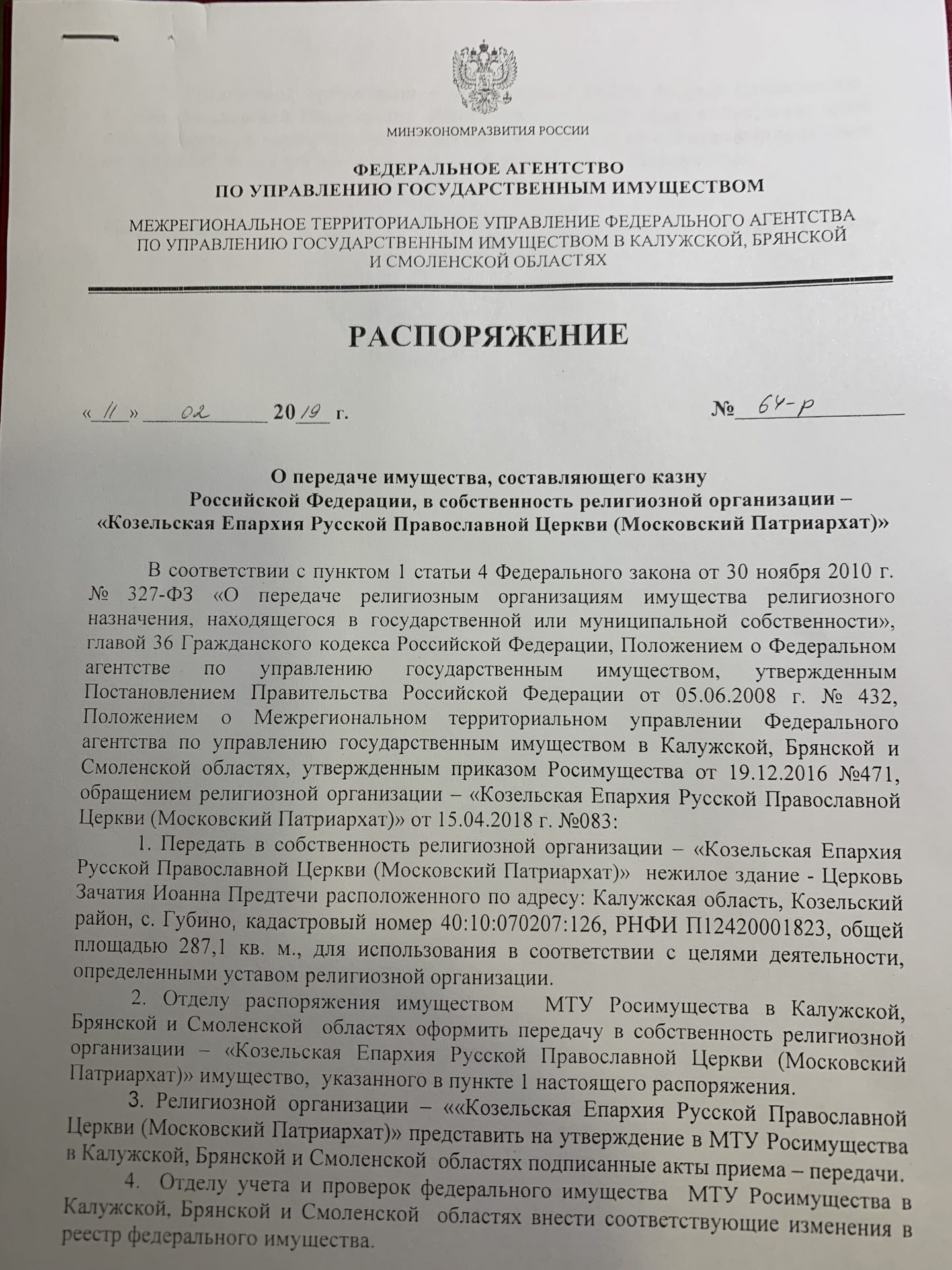 16 октября в городе Калуге в Межрегиональном территориальном управлении Федерального агентства по управлению государственным имуществом Калужской, Брянской и Смоленской областях состоялось подписание Акта о приеме-передаче недвижимого имущества, составляющего казну Российской Федерации – церкви Зачатия Иоанна Предтечи в селе Губино Козельского района, в собственность Козельской епархии Русской Православной Церкви.