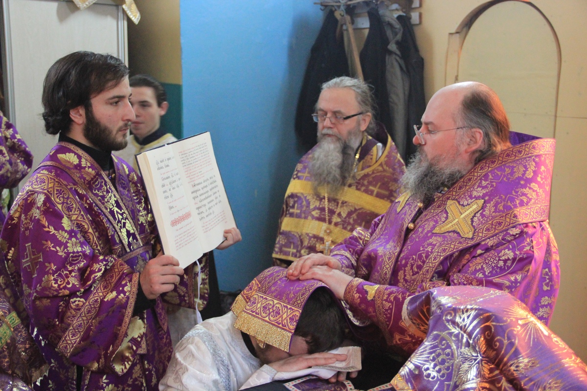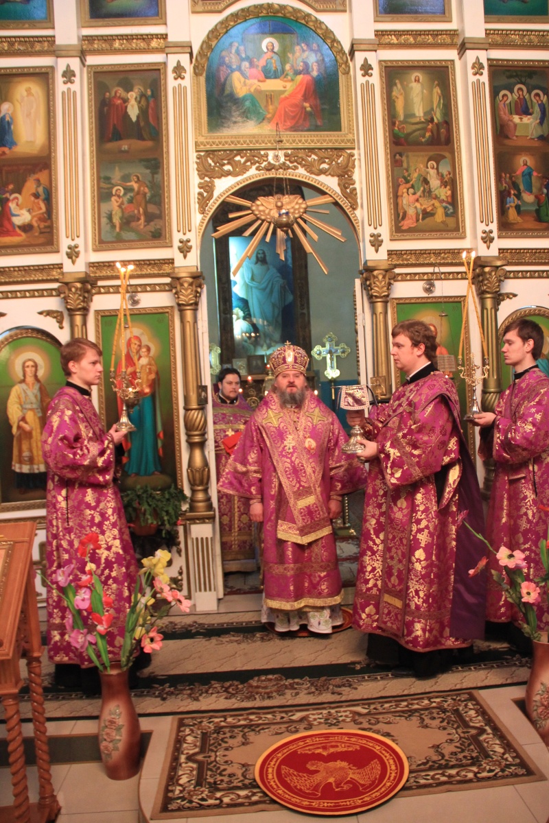 Его Преосвященству сослужили: благочинный округа протоиерей Василий Биляк — настоятель храма, протоиерей Дмитрий Губаль, протоиерей Алексий Жиганов, протоиерей Александр Карпов, иерей Антоний Хатунцев и диакон Евгений Ковригин — заведующий канцелярией Козельского епархиального управления. После Великого Входа в священный сан иерея был рукоположен клирик Успенского храма села Хвастовичи диакон Павел Мещеряков. В завершении богослужения владыка обратился к молящимся с архипастырским словом.