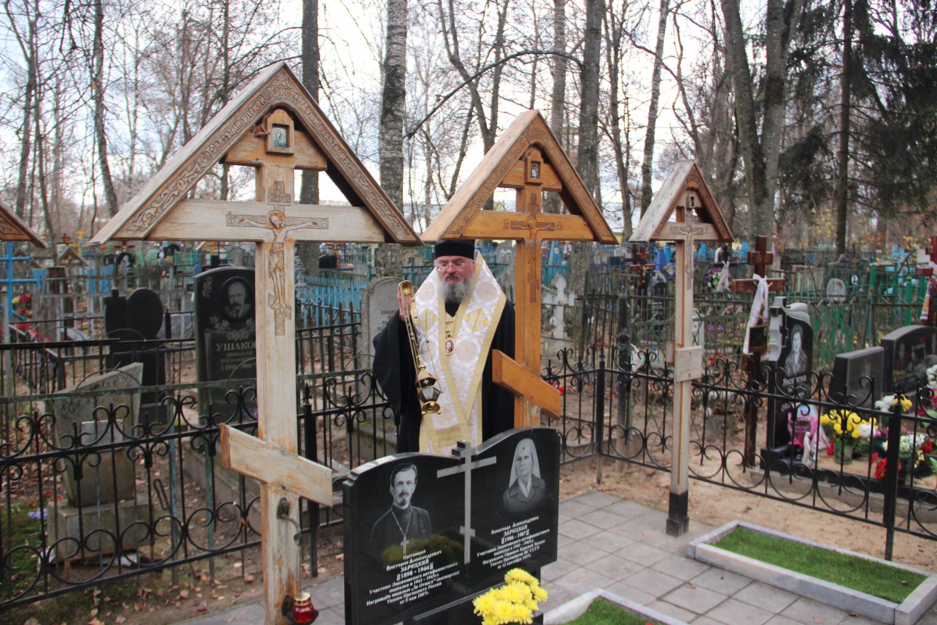 После богослужения в храме владыка Никита совершил заупокойную литию на могиле героя Великой Отечественной войны участника Людиновского антифашистского подполья протоиерея Викторина Зарецкого.