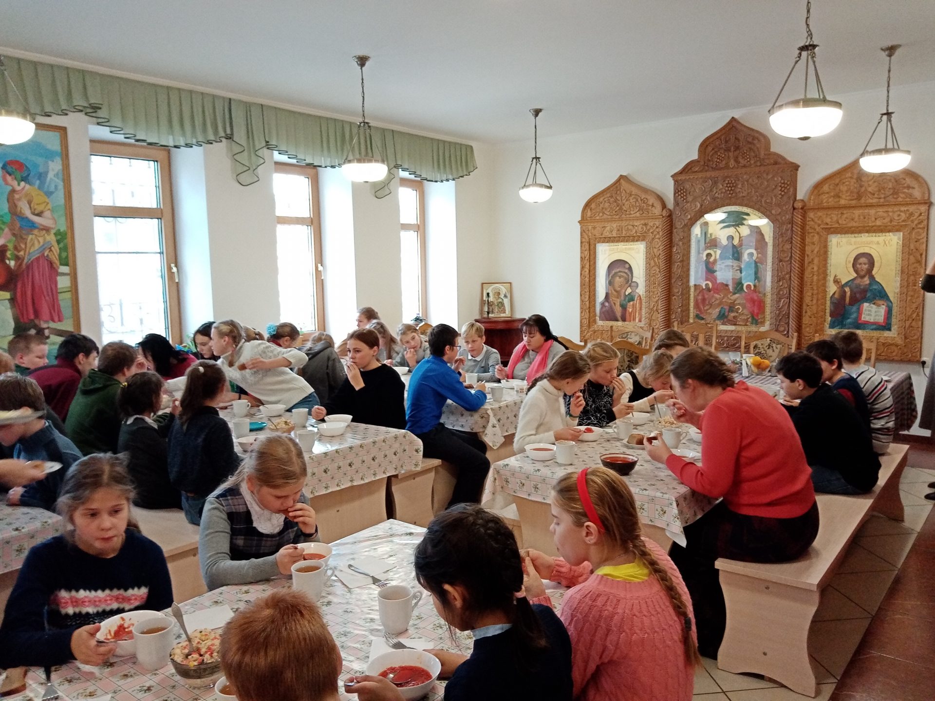 В Обнинске в храме Рождества Христова, по благословению митрополита Калужского и Боровского Климента, детей встретили очень радушно и вкусно накормили.