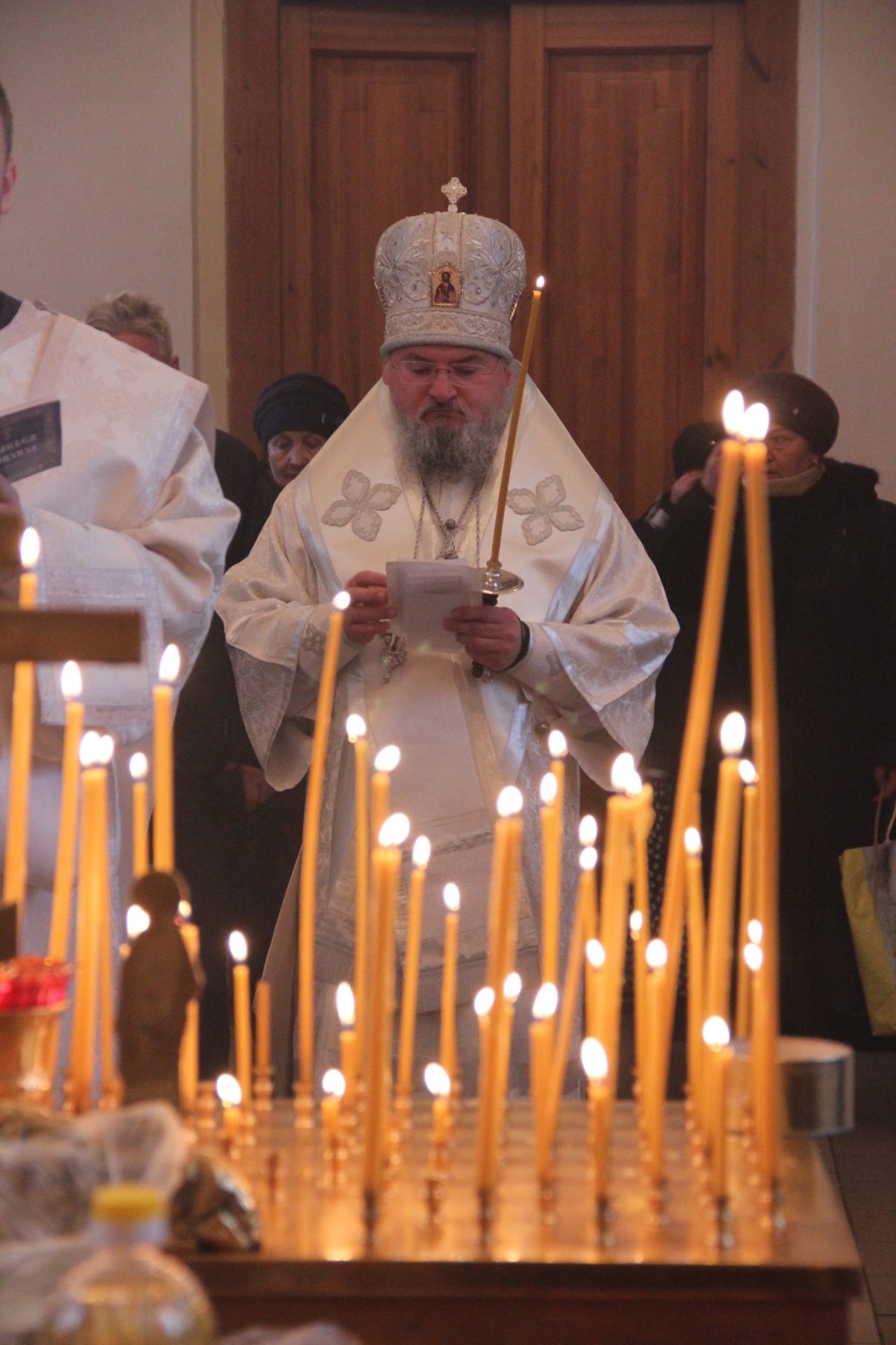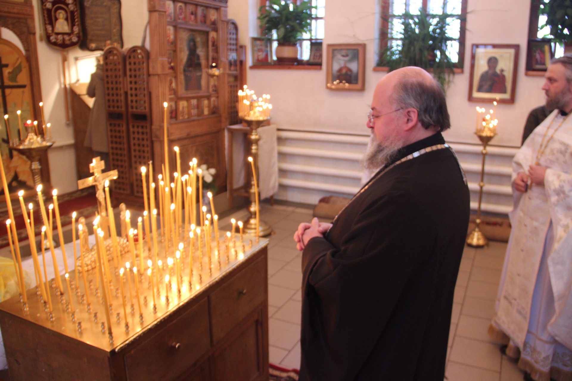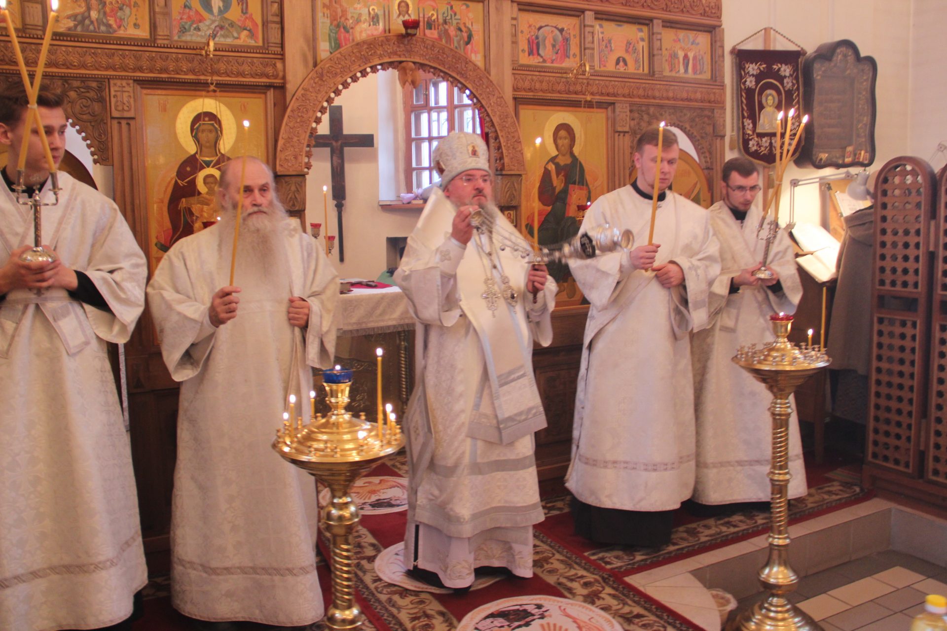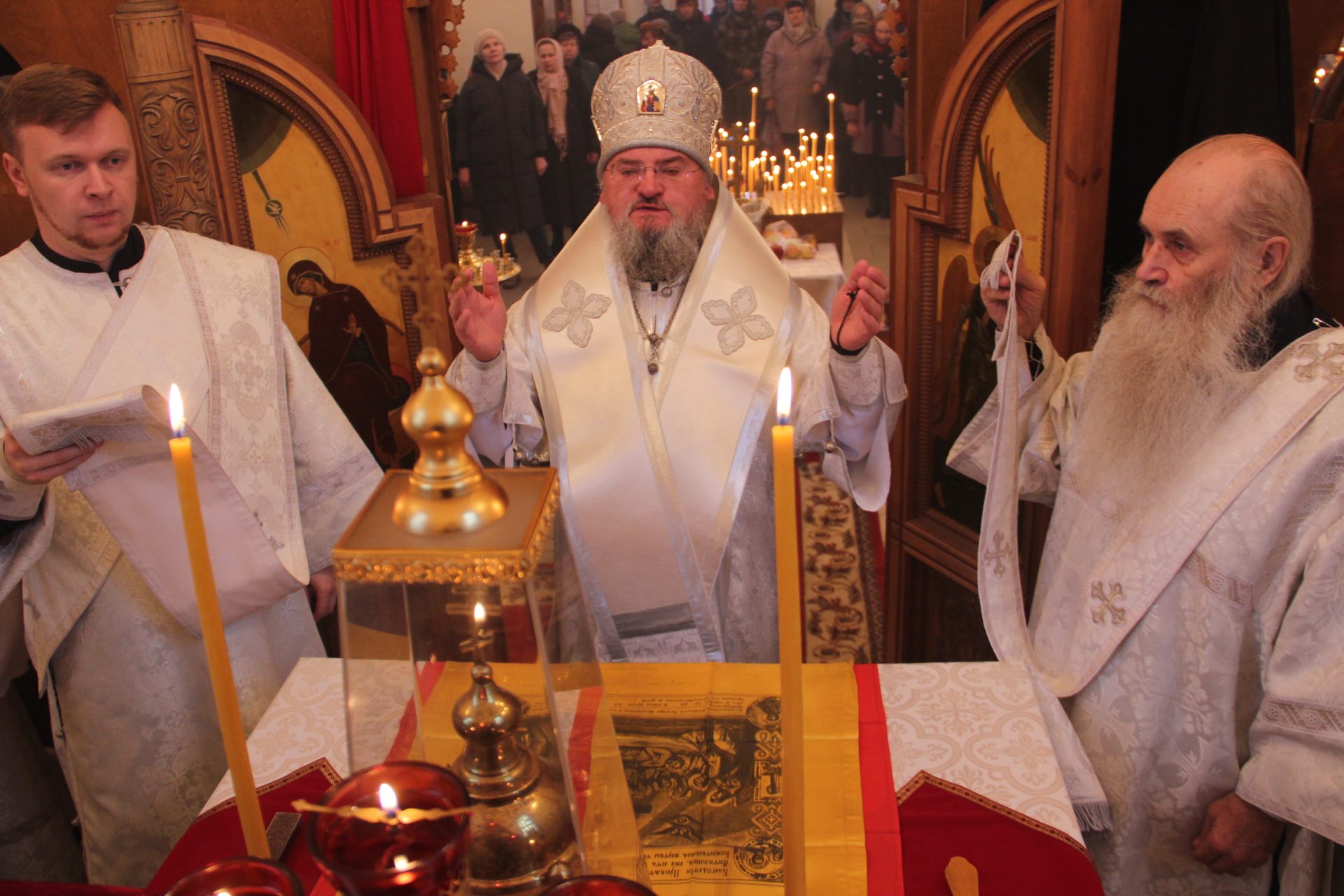 Архипастырю сослужили: настоятель храма иерей Николай Кузнецов, диакон Евгений Ковригин и иеродиакон Виталий (Павленко).
