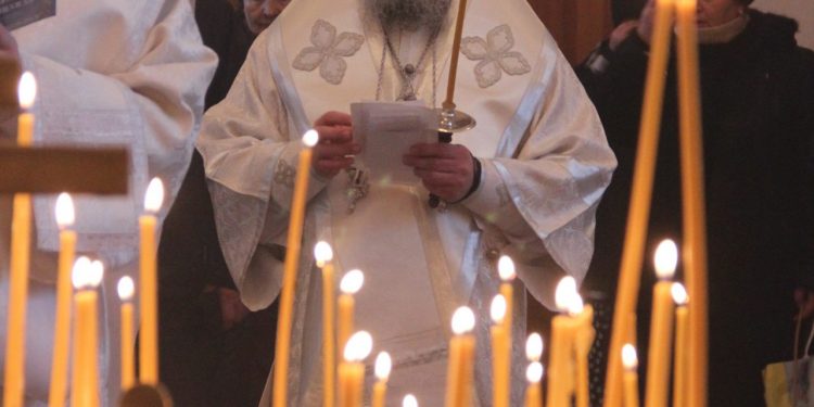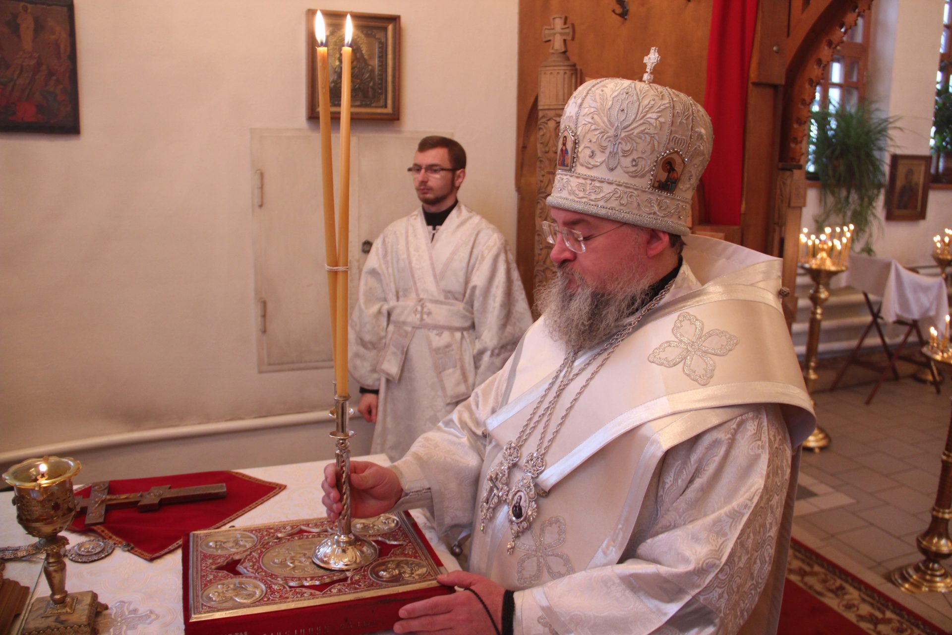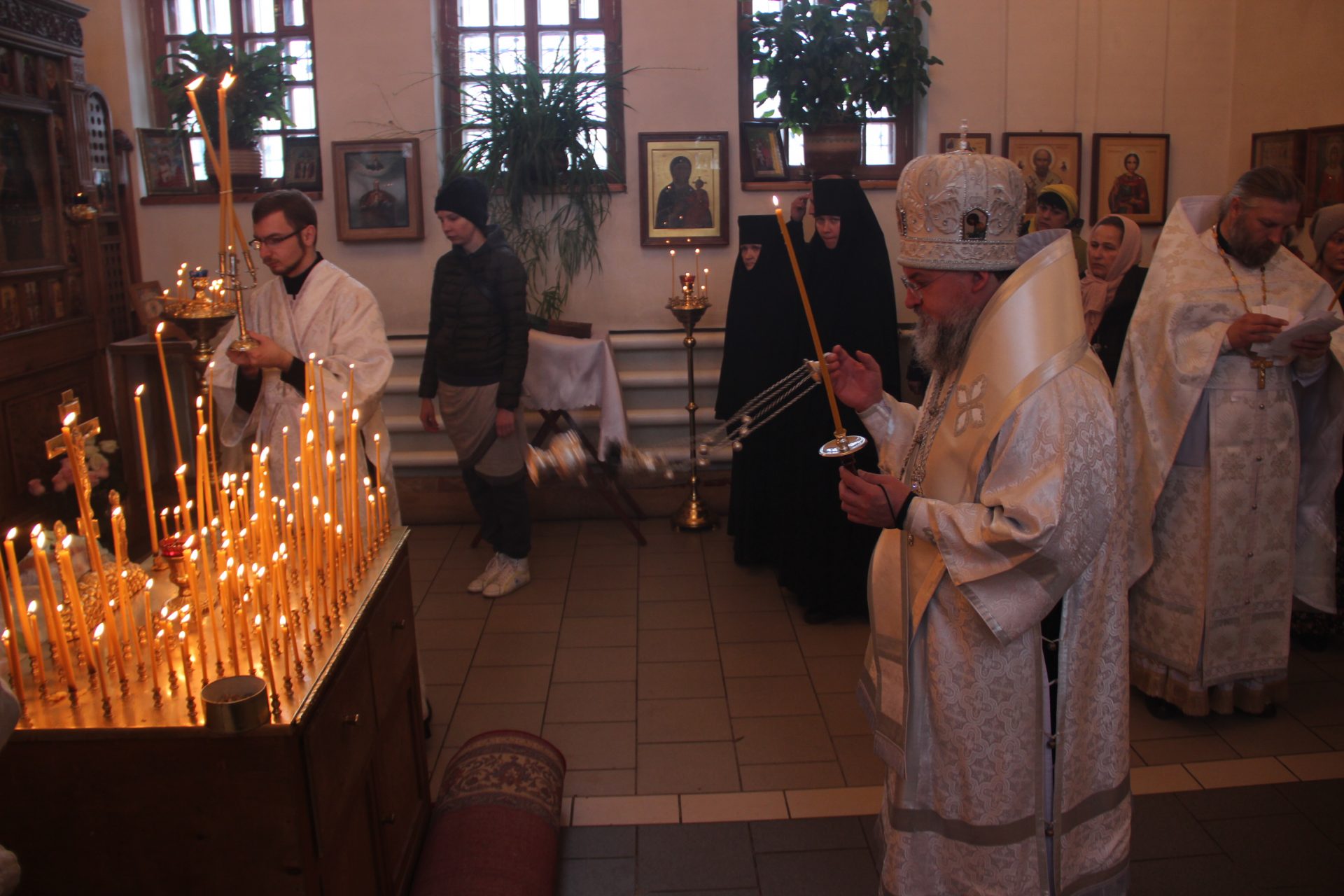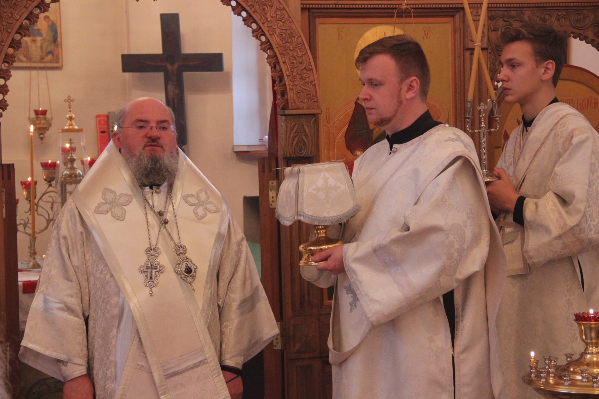 Архипастырю сослужили: настоятель храма иерей Николай Кузнецов, диакон Евгений Ковригин и иеродиакон Виталий (Павленко).