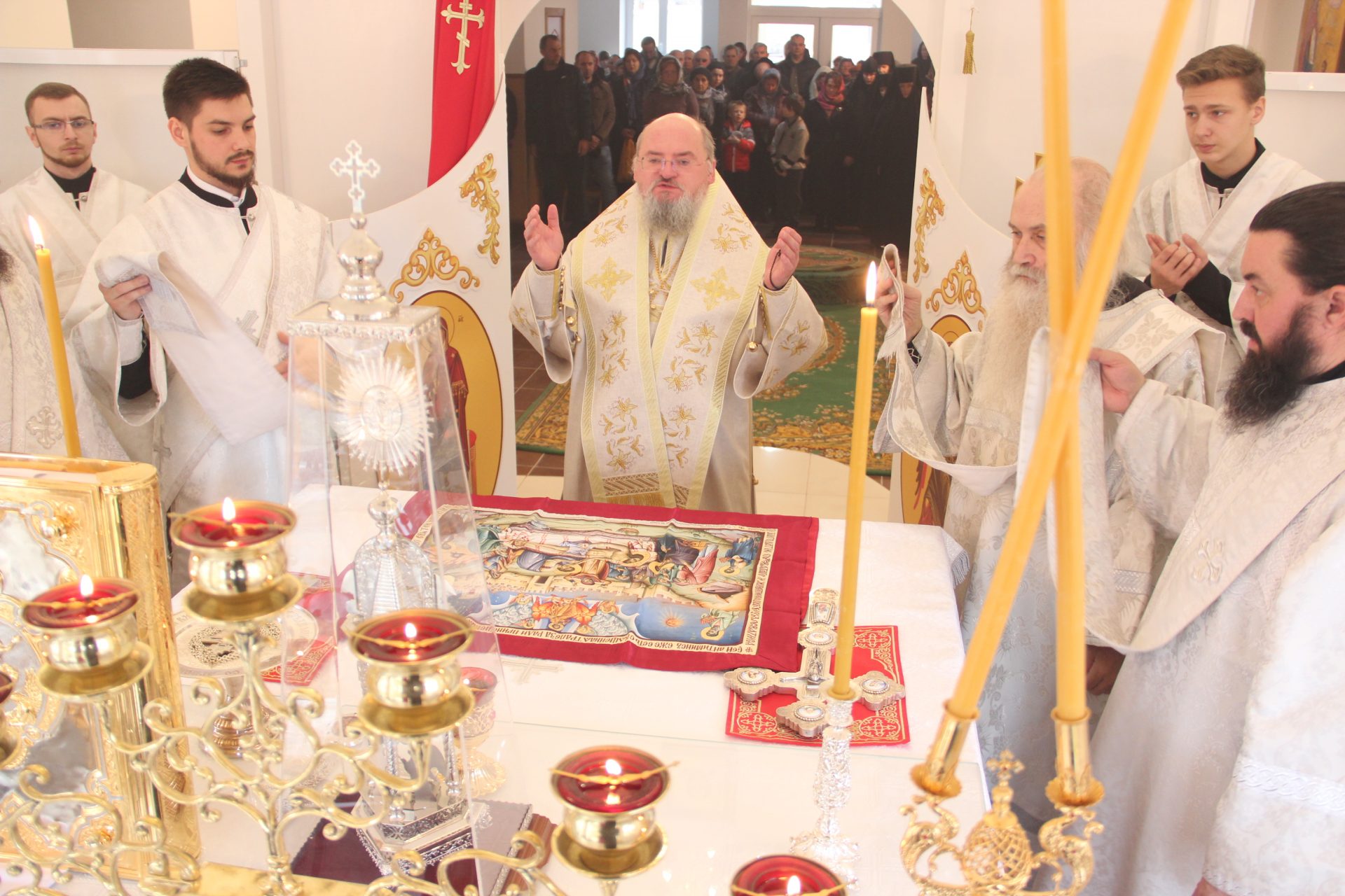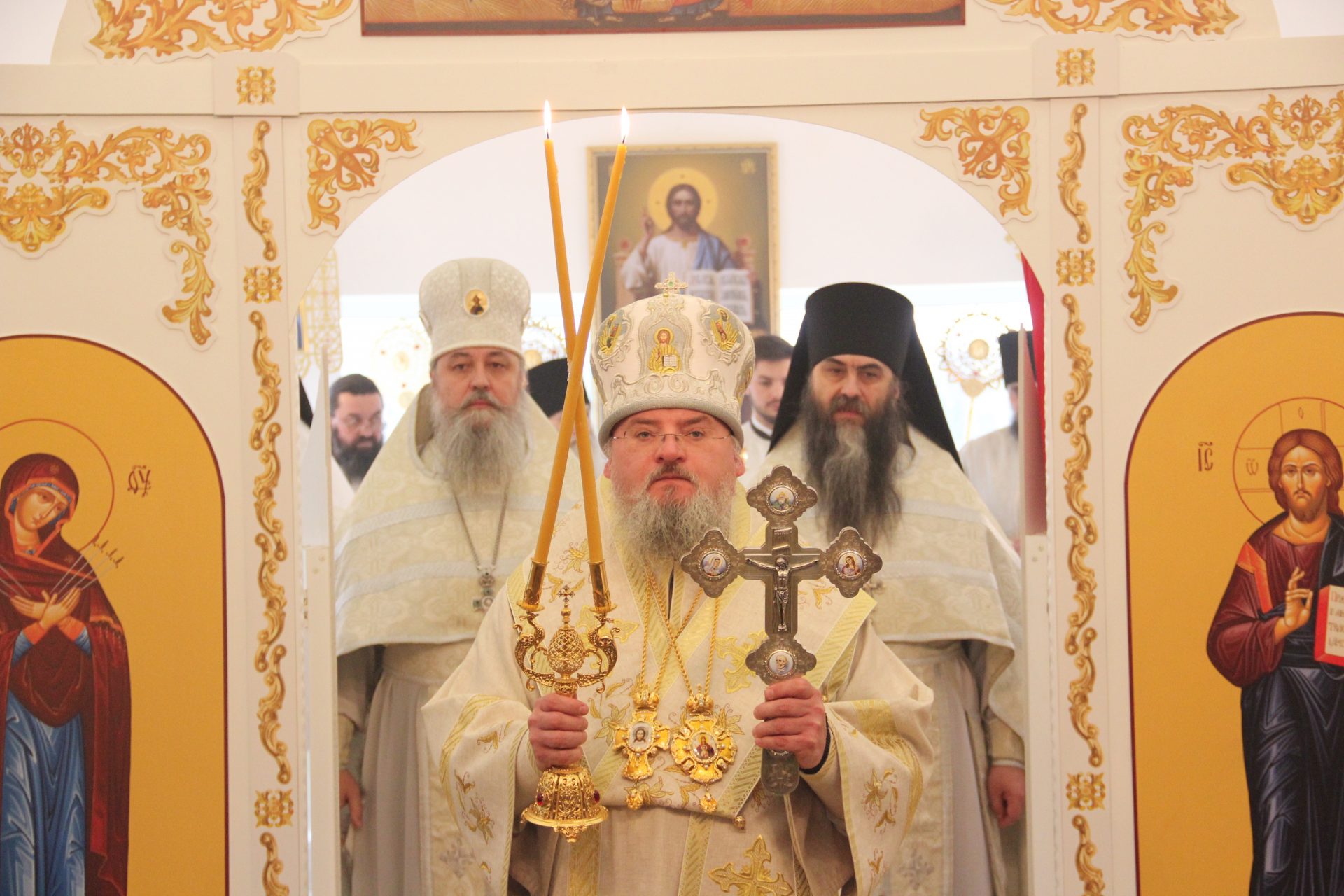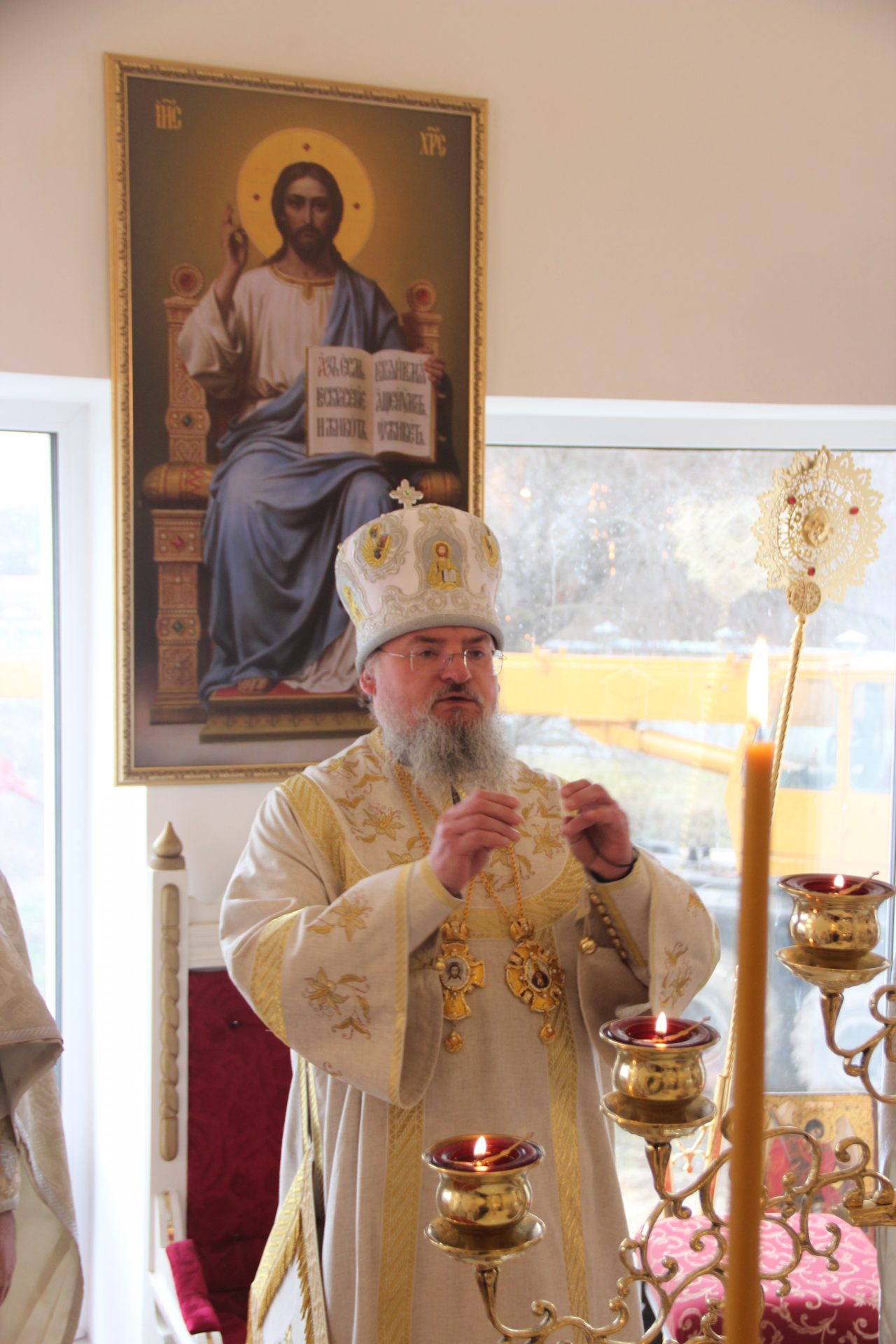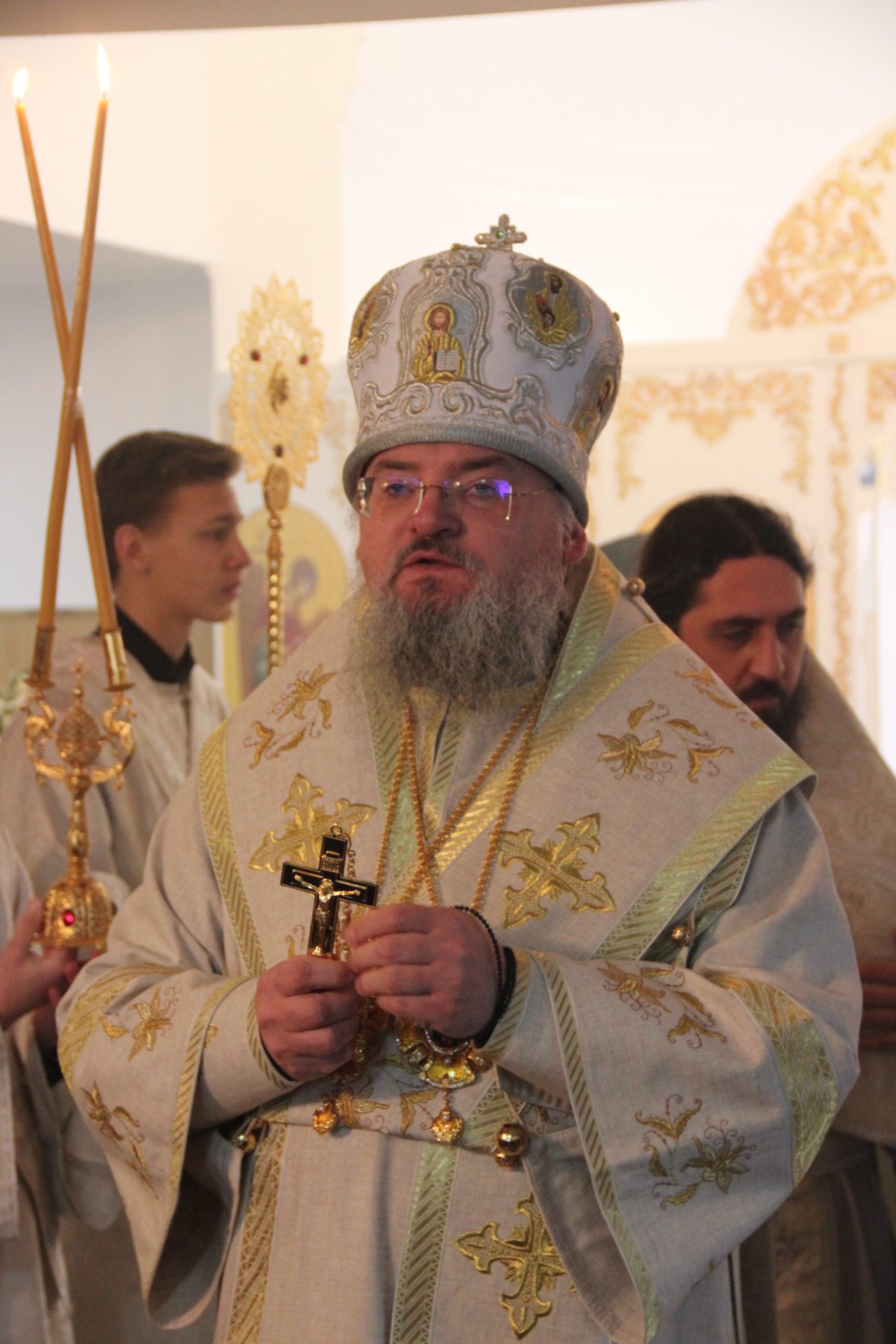 По отпусте литургии священнослужители совершили праздничный молебен, после которого владыка обратился к богомольцам с проповедью.