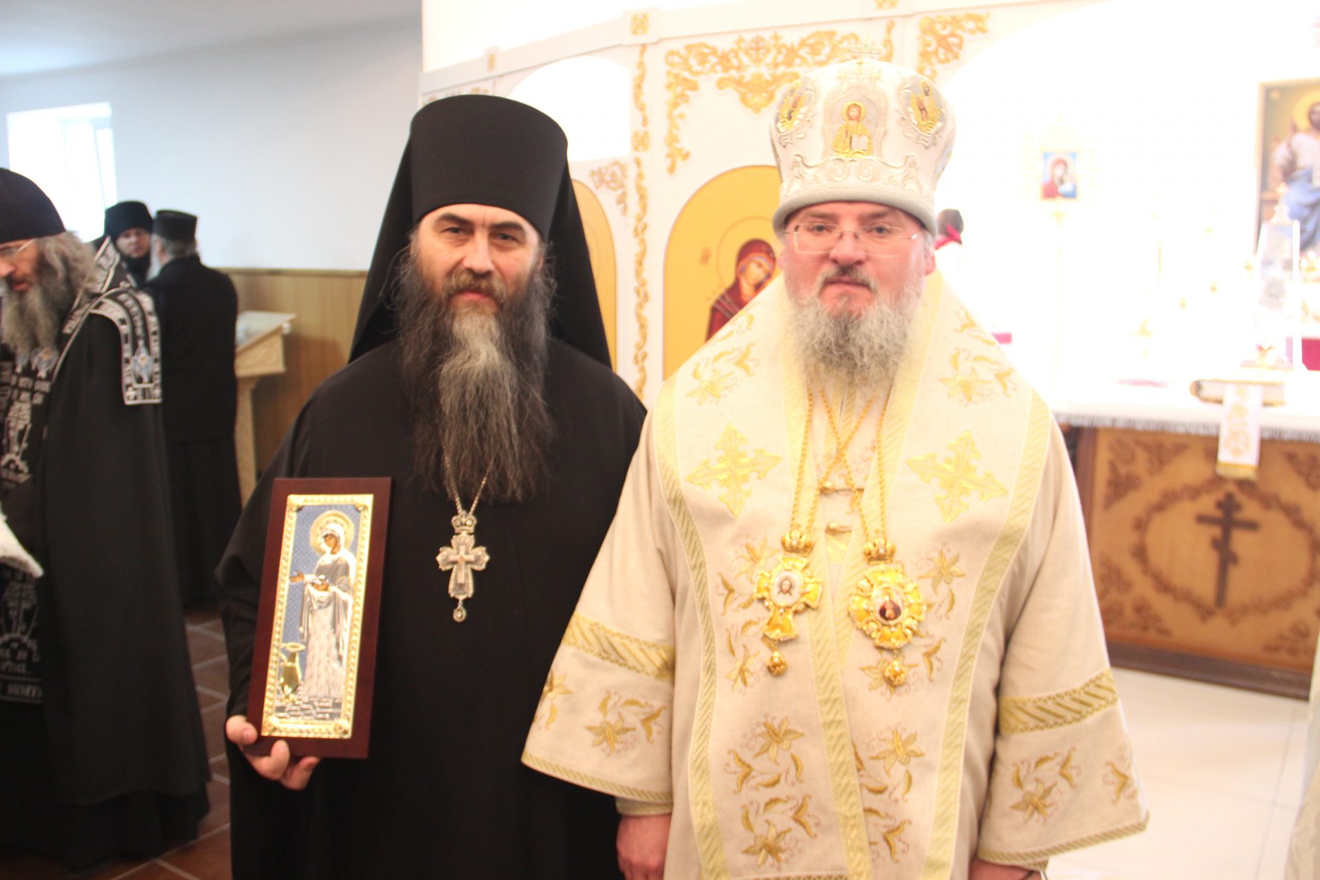 Архипастырь поздравил настоятеля обители игумена Михаила с днем тезоименитства и преподнес ему икону Пресвятой Богородицы.