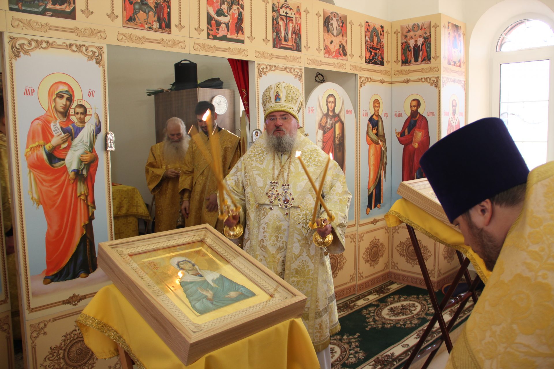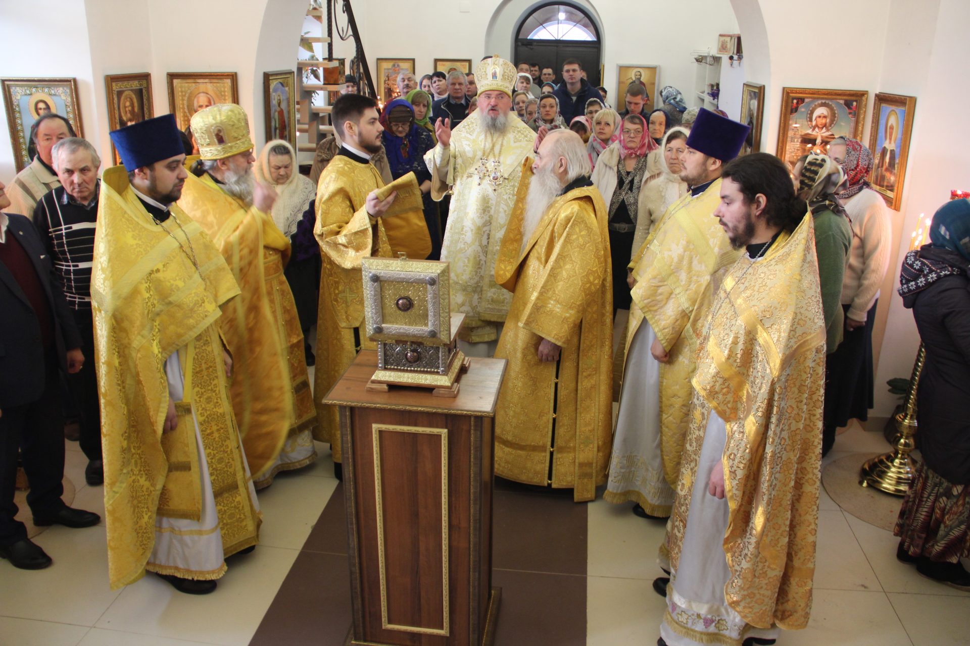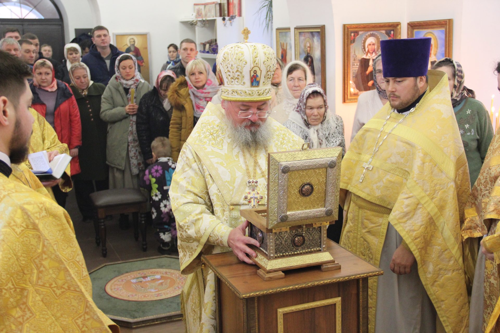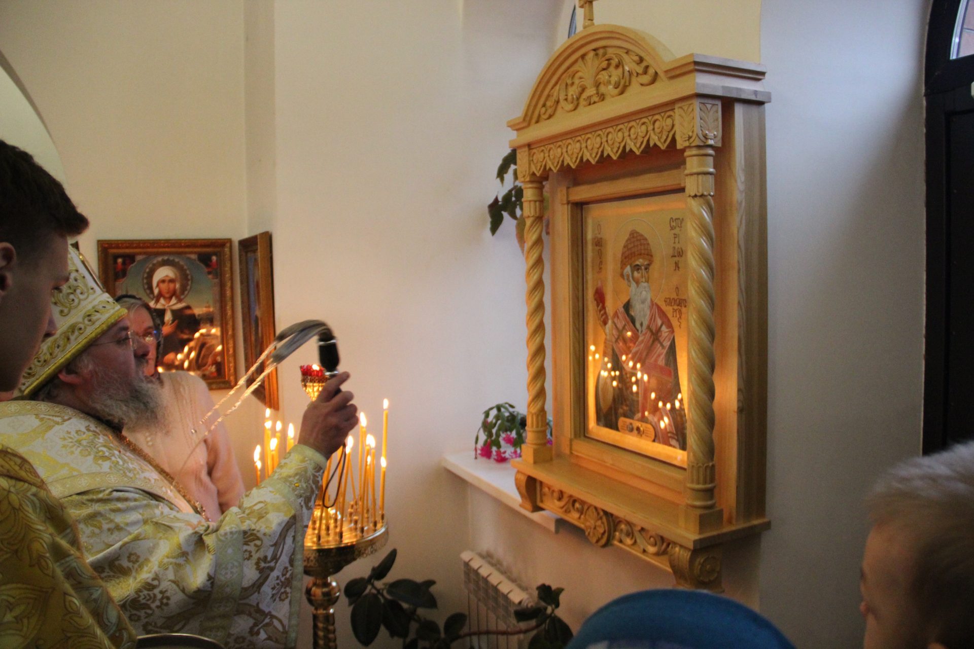 Перед началом литургии из алтаря в центр храма был вынесен мощевик с частицами мощей святых благоверных Петра и Февронии Муромских чудотворцев, который владыка передал в дар приходу. Также архипастырь освятил храмовую икону святителя Спиридона Тримифунтского, написанную и освященную на острове Корфу. В икону была вставлена частица мощей святителя, также переданная владыкой для храма.