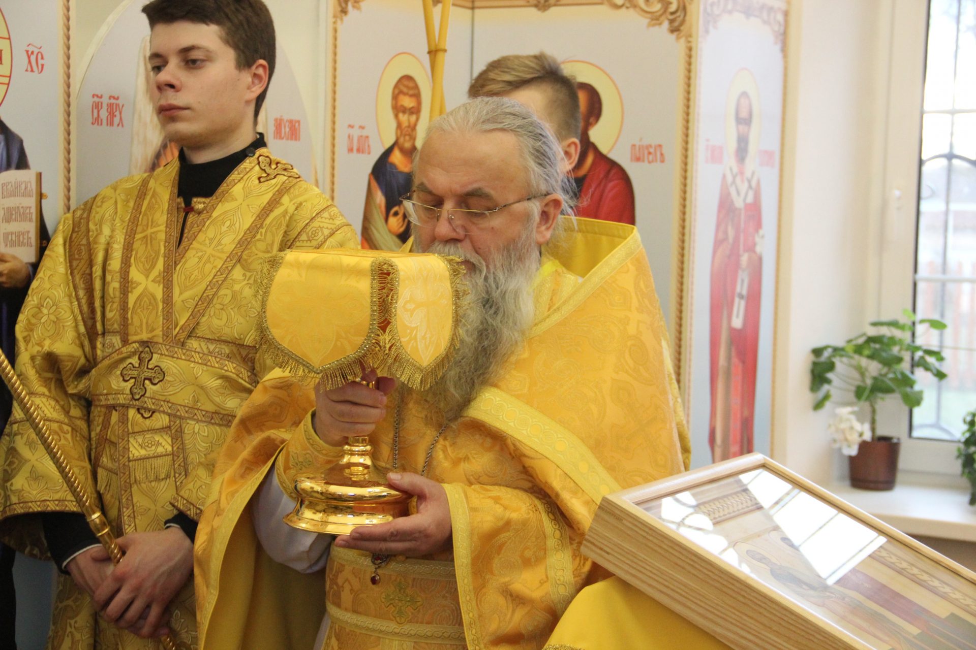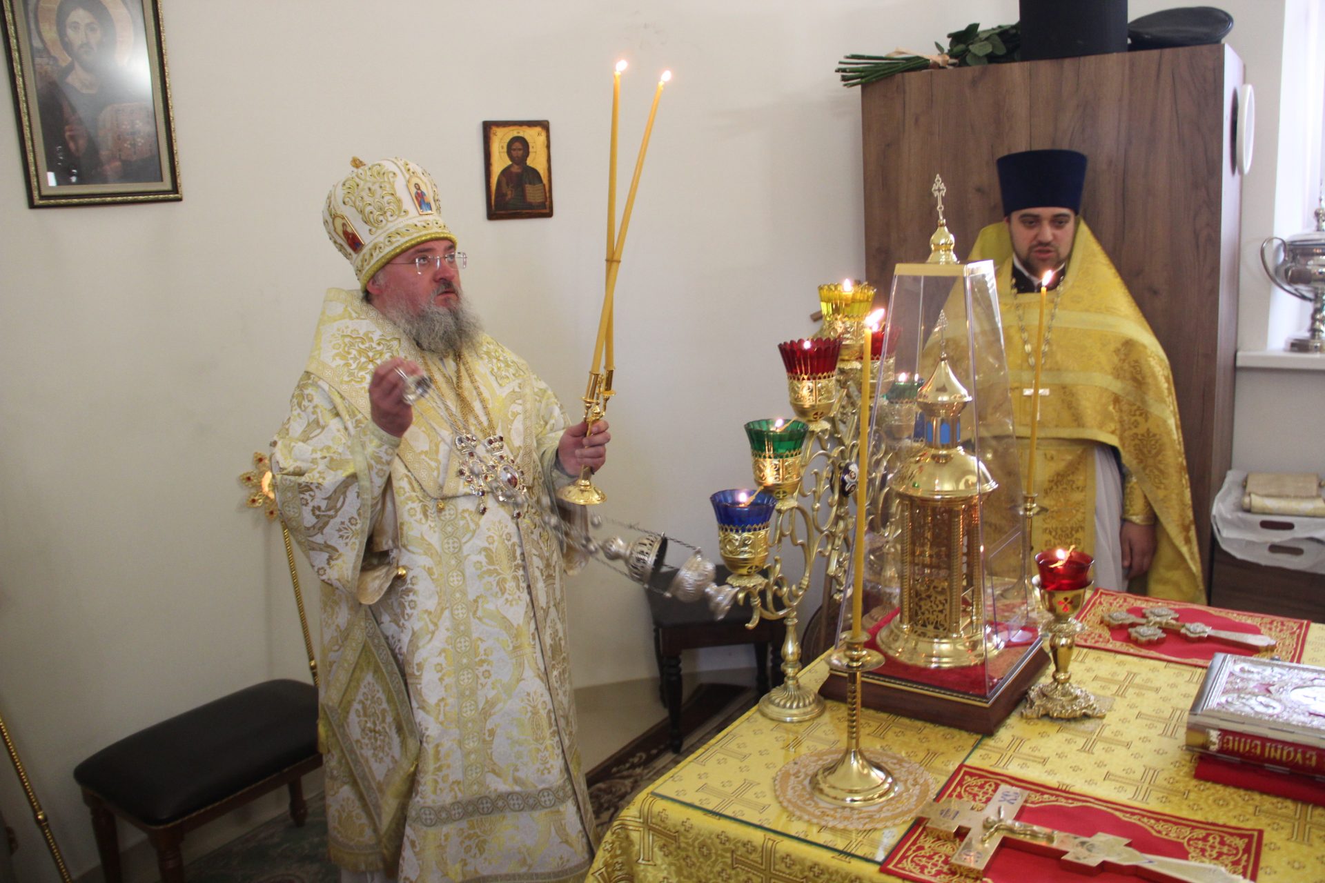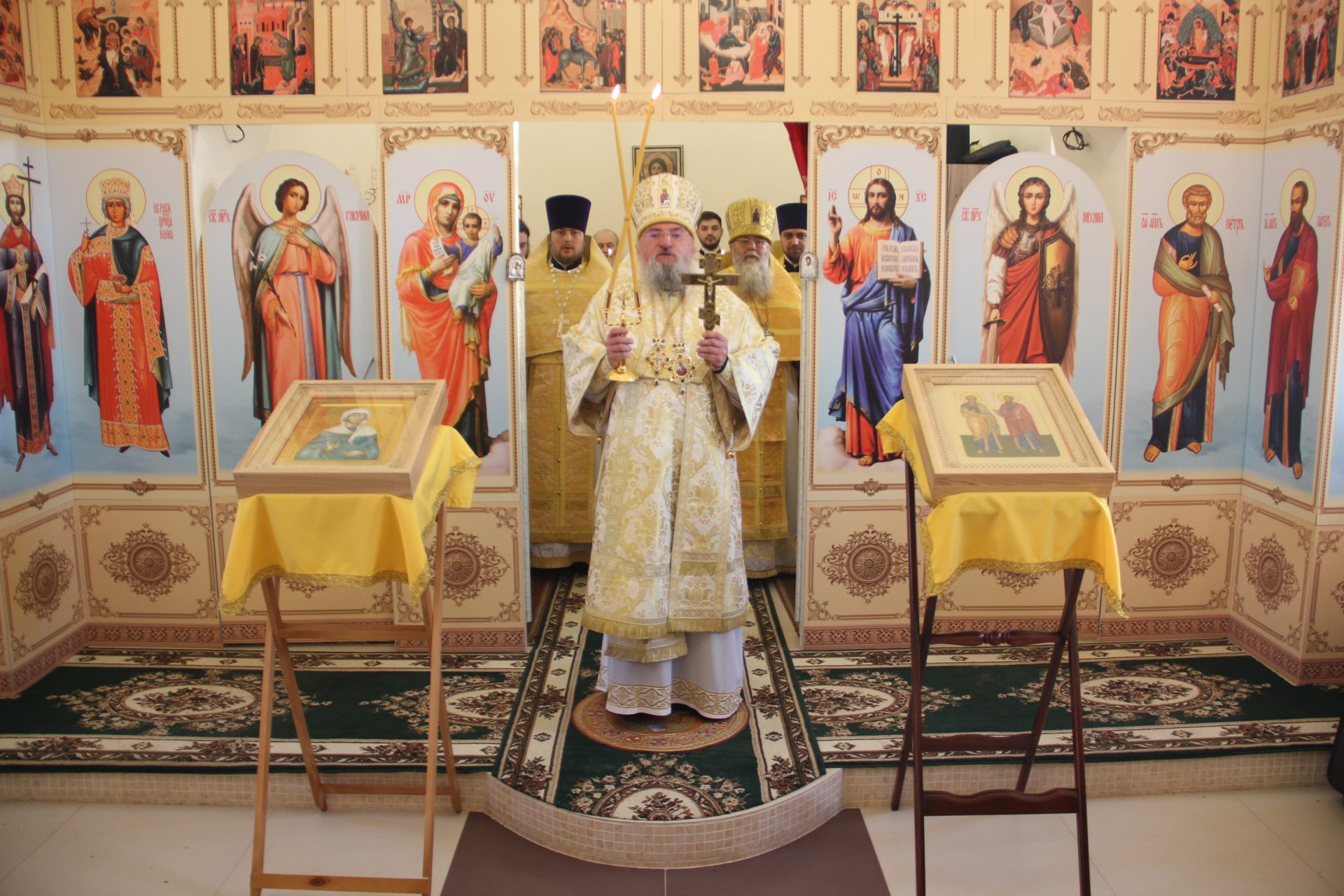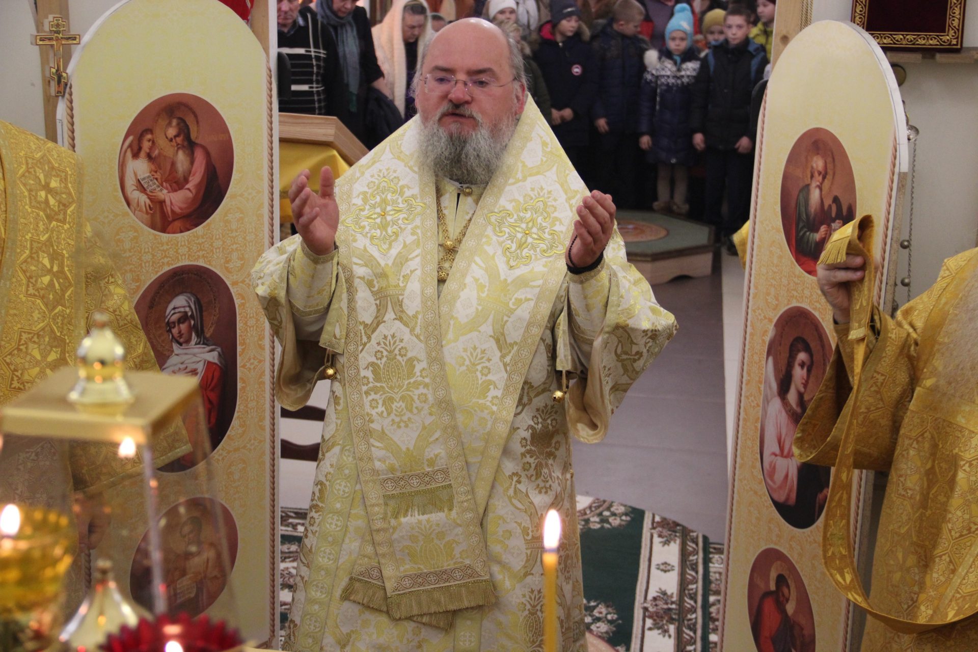 Перед началом литургии из алтаря в центр храма был вынесен мощевик с частицами мощей святых благоверных Петра и Февронии Муромских чудотворцев, который владыка передал в дар приходу. Также архипастырь освятил храмовую икону святителя Спиридона Тримифунтского, написанную и освященную на острове Корфу. В икону была вставлена частица мощей святителя, также переданная владыкой для храма.