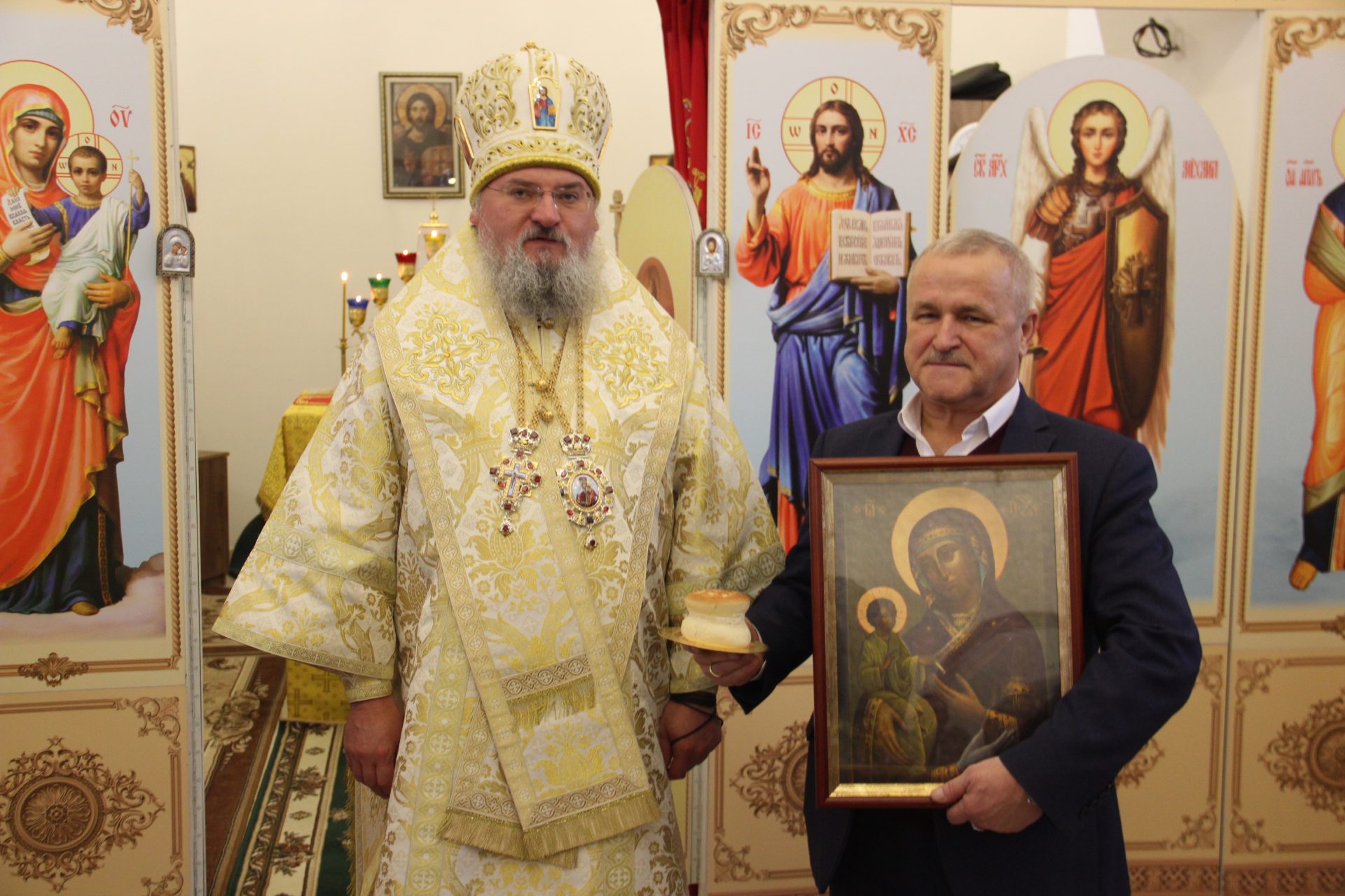 Архипастырь поздравил ктитора храма Николая Николаевича Кленова с днем тезоименитства и преподнес ему святую просфору и икону Пресвятой Богородицы.