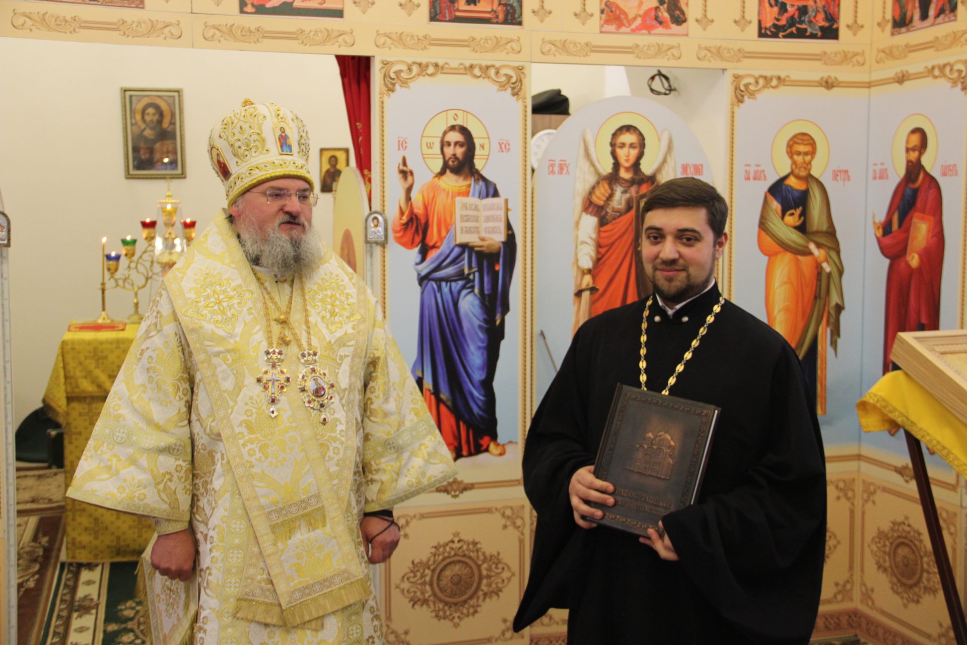 Владыка также поздравил настоятеля храма иерея Артемия Арутюняна с успешным завершением обучения в Санкт Петербургской духовной академии, защитой дипломной работы и присуждением ему степени магистра богословия и вручил ему памятный подарок.