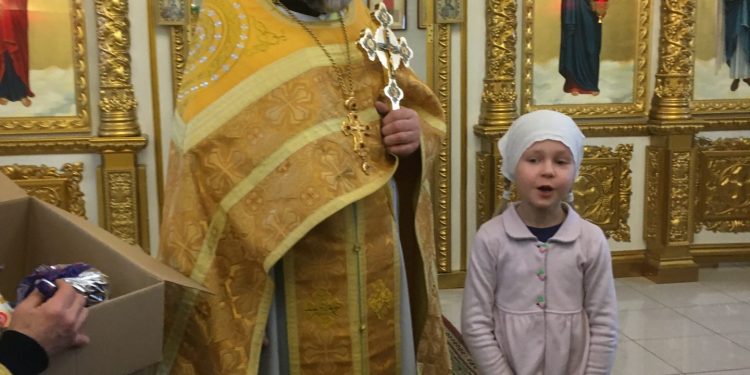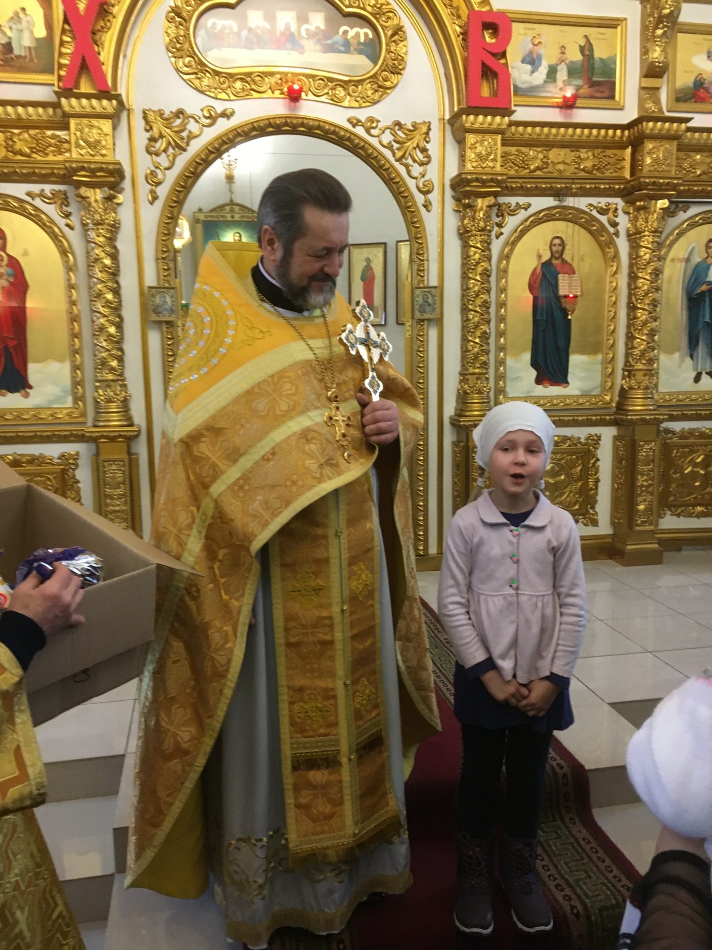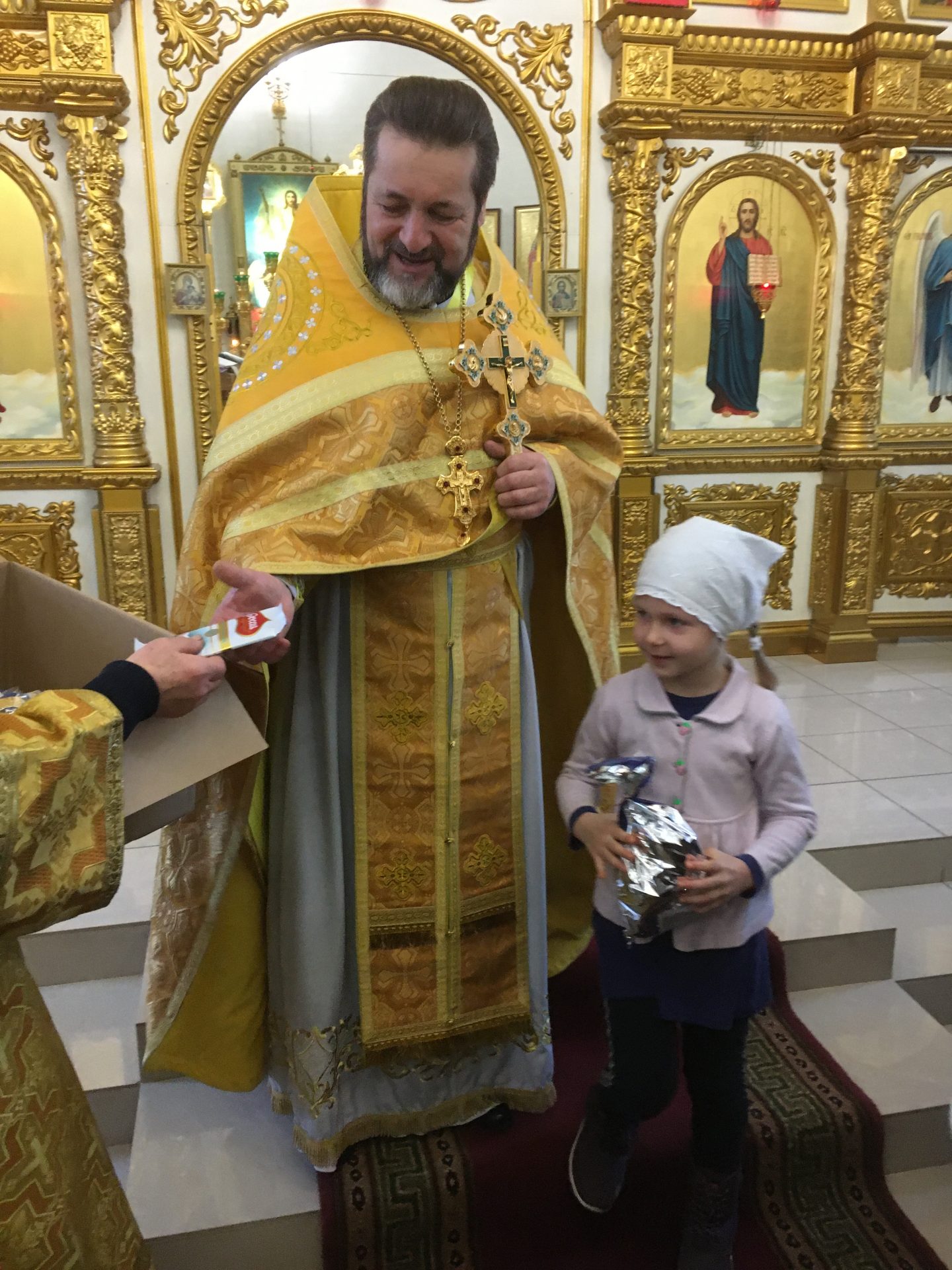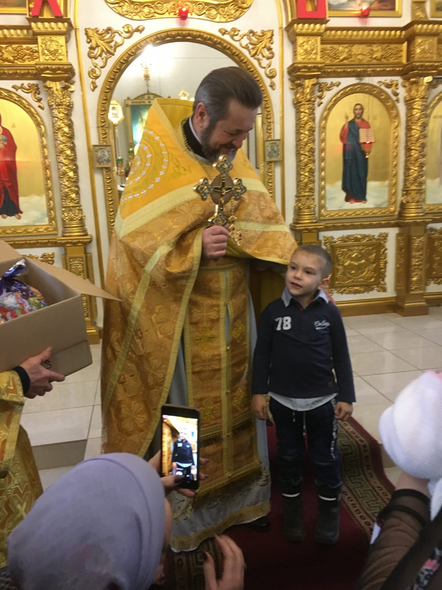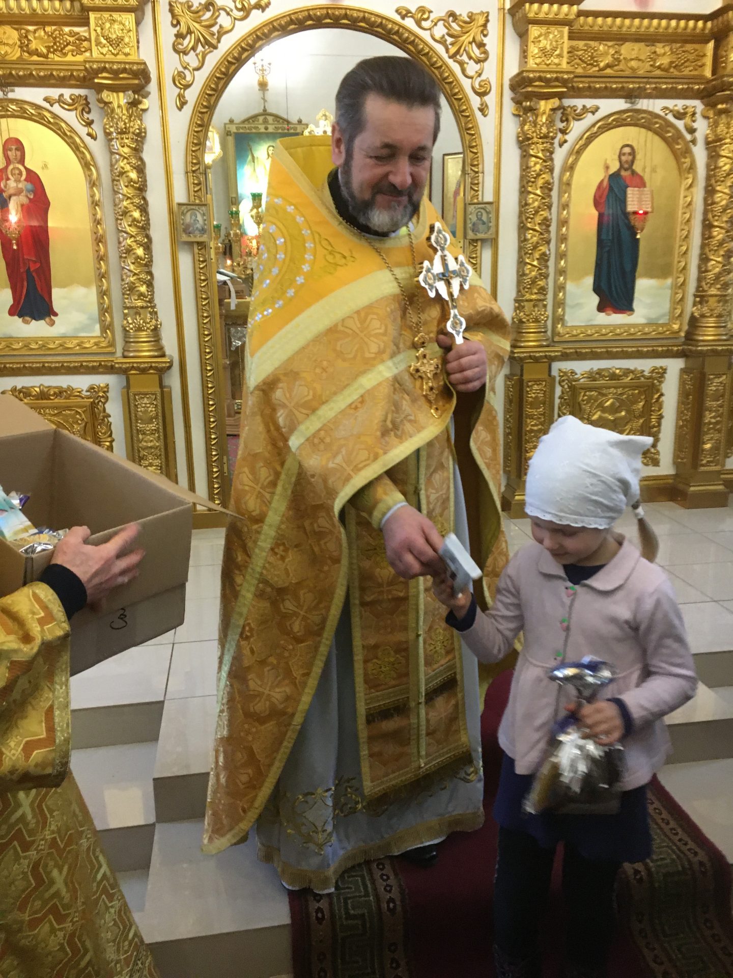 По сложившейся традиции юные прихожане прославляли святого угодника Божия и из рук батюшки получили сладкие и памятные подарки.