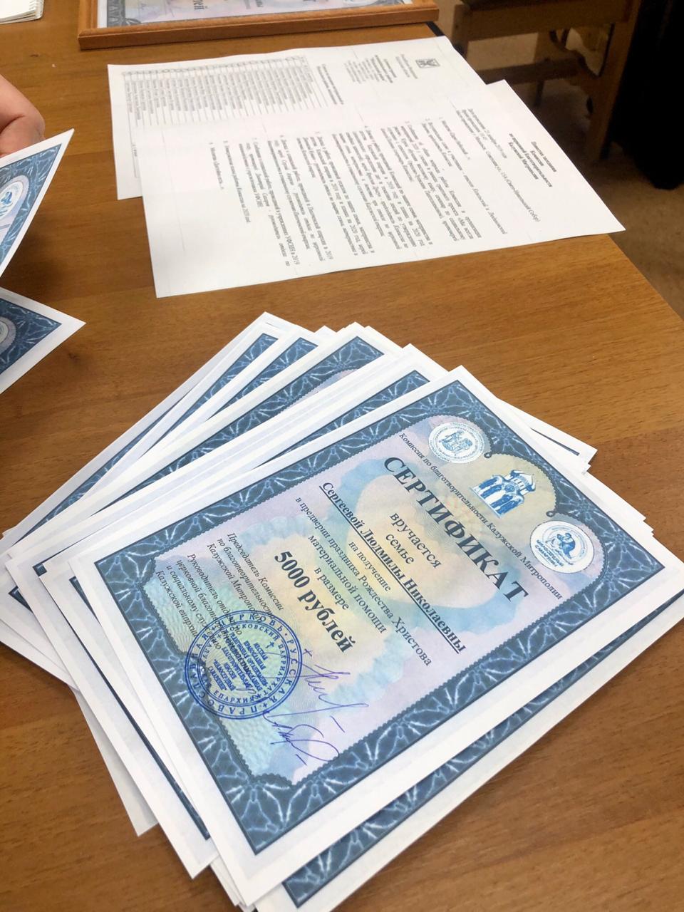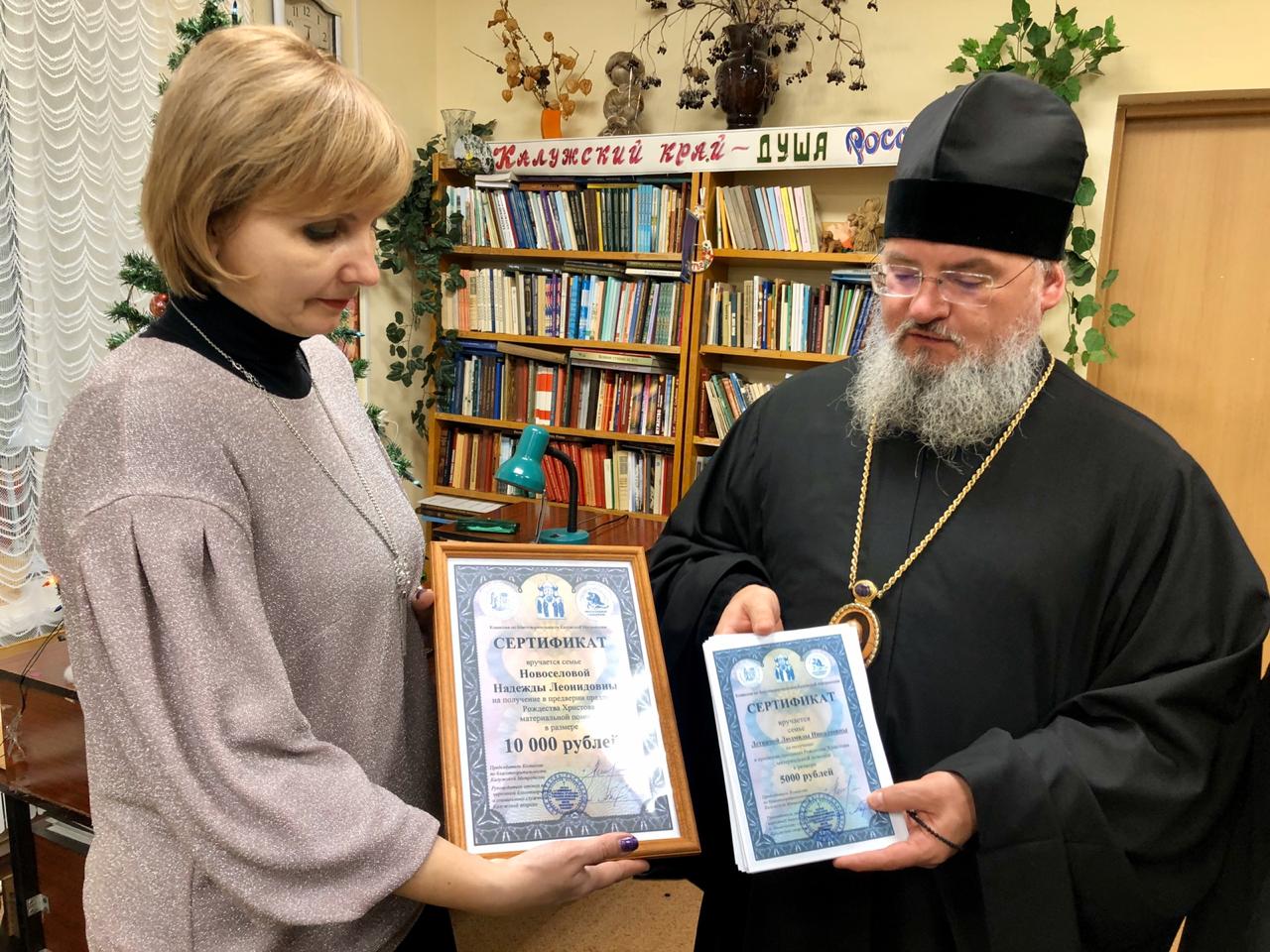 Сертификаты на получение средств были вручены в рамках проводимого итогового заседания Комиссии по благотворительности Калужской Митрополии  председателем Комиссии — епископом Козельским и Людиновским Никитой, совместно с секретарем Комиссии,  председателем православной благотворительной Миссией «Милосердный самарянин» – протоиереем Алексеем Пелевиным и руководителем отдела по защите семьи, материнства и детства Песоченской епархии – иереем Вячеславом Береговым заместителю по социальной политике главы администрации МР «Мосальский район»  Кузиной Ирине Михайловне для вручения семьям.
