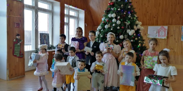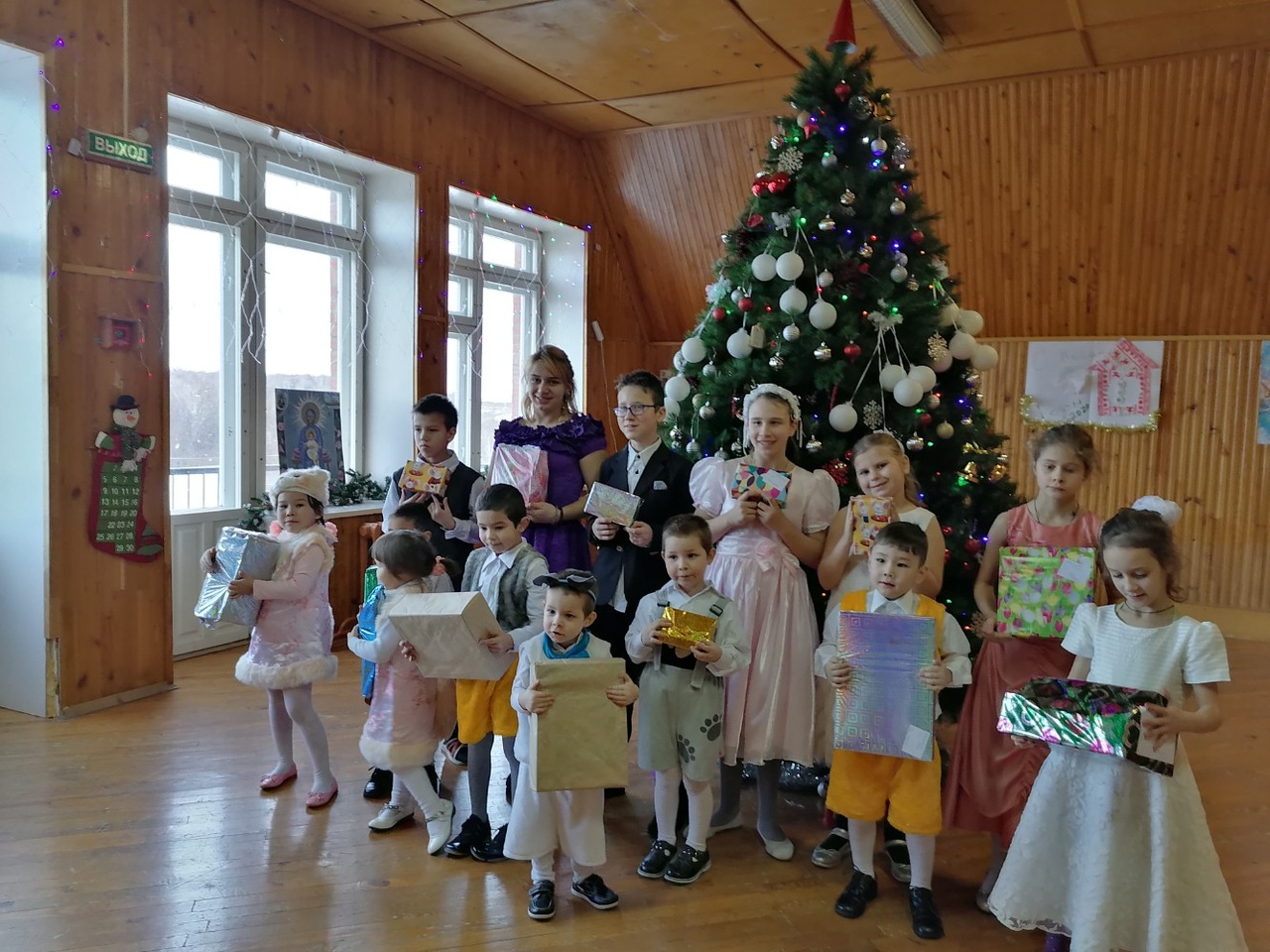 Читали стихи, пели песни в актовом зале, кружились в хороводе, играли в игры вместе с воспитателями и директором под елкой в спортивном зале. Завершился праздник вручением подарков, которые отправили детям школьники из СОШ №9 г. Раменское Московской области.
