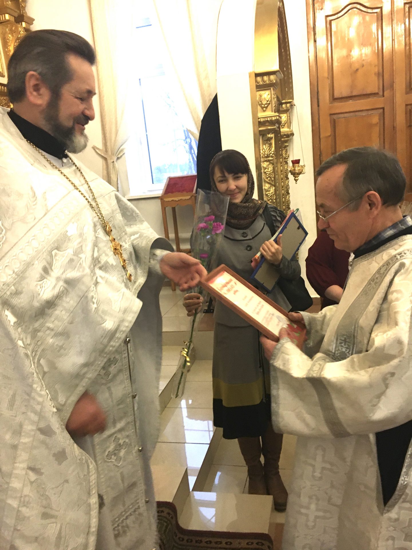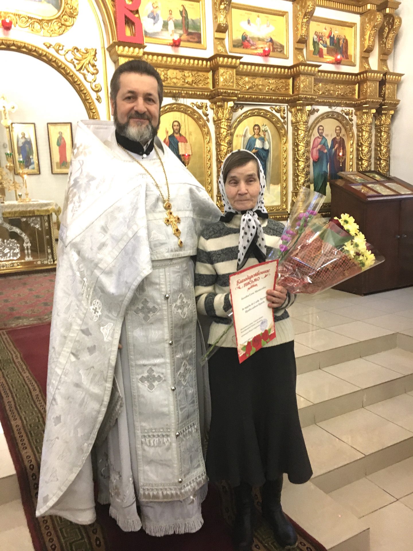 8 января, на второй день праздника Рождества Христова в храме святых бессребреников и чудотворцев Космы и Дамиана поселка Думиничи по окончании Божественной литургии настоятель храма протоиерей Иоанн Староста поздравил всех с праздником Рождества Христова а также поздравил с Днем рождения Базовую Елену Михайловну, прихожанку храма. Батюшка пожелал крепкого здоровья и помощи Божией в ее труде и быть еще много лет полезной Церкви Христовой, хор пропел многая лета. Отец Иоанн поблагодарил многих прихожан которые уже много лет трудятся во славу Божию на клиросе и принимают активное участие в жизни прихода, многие были награждены благодарственным письмом. Затем состоялся Рождественский утренник для детей.