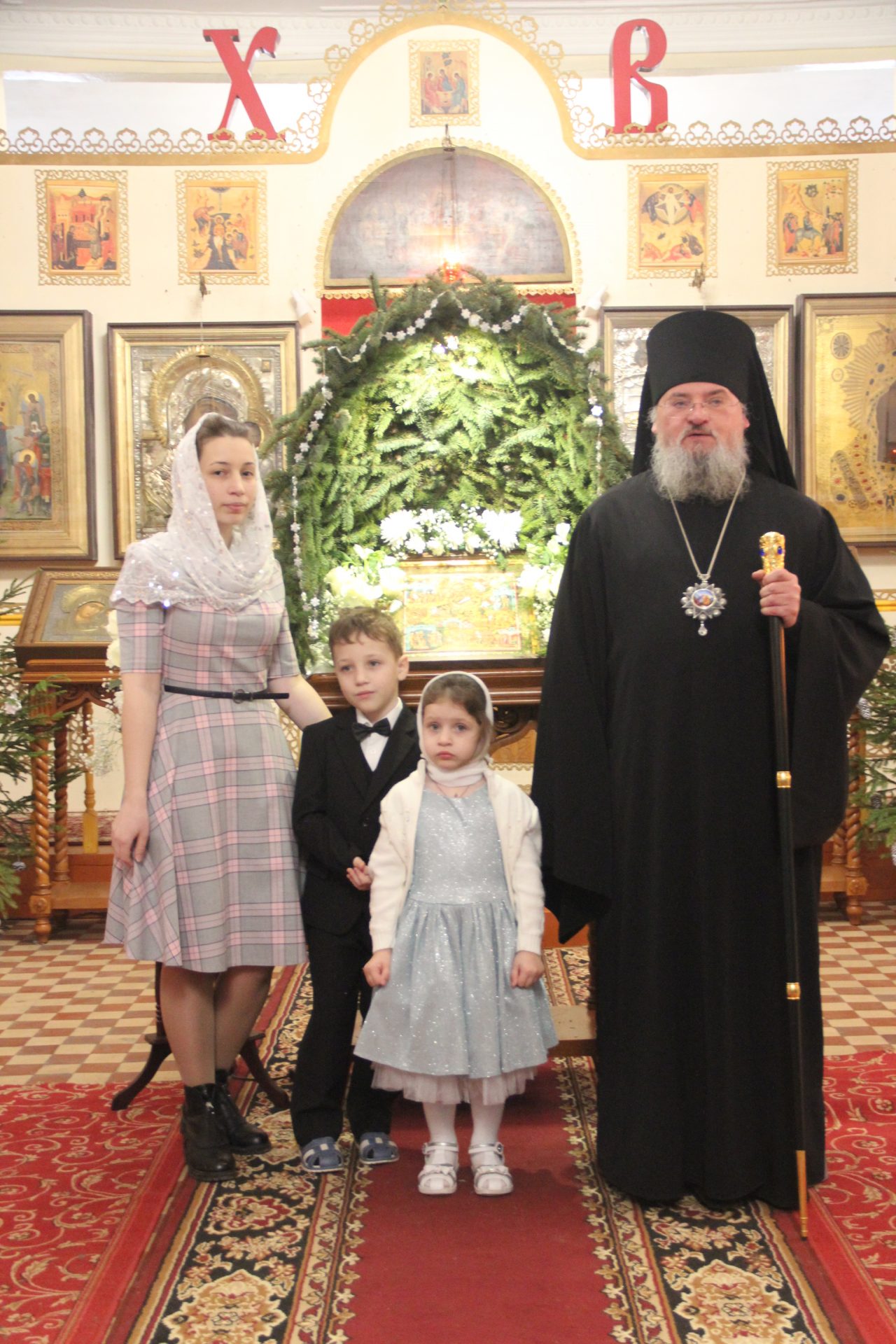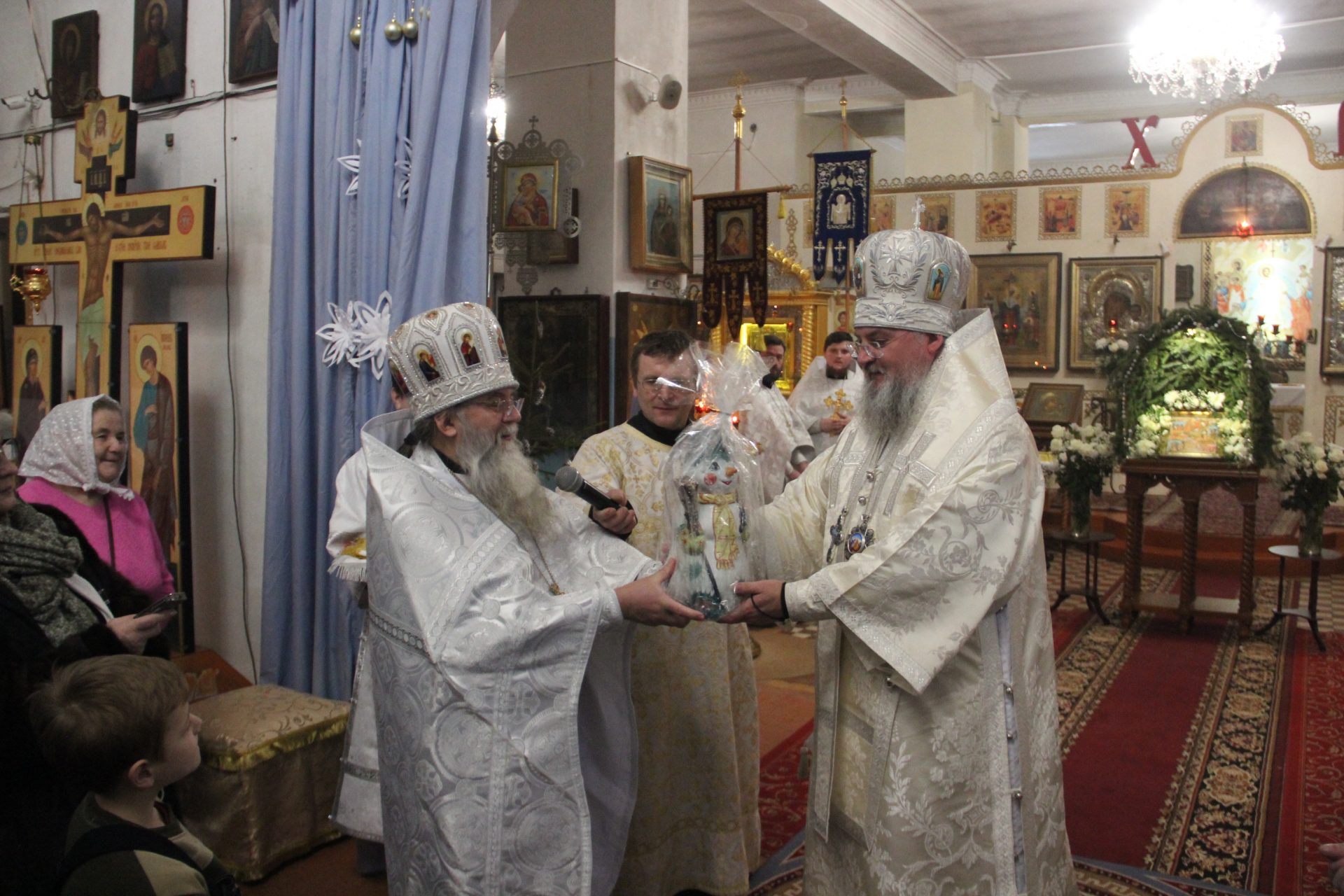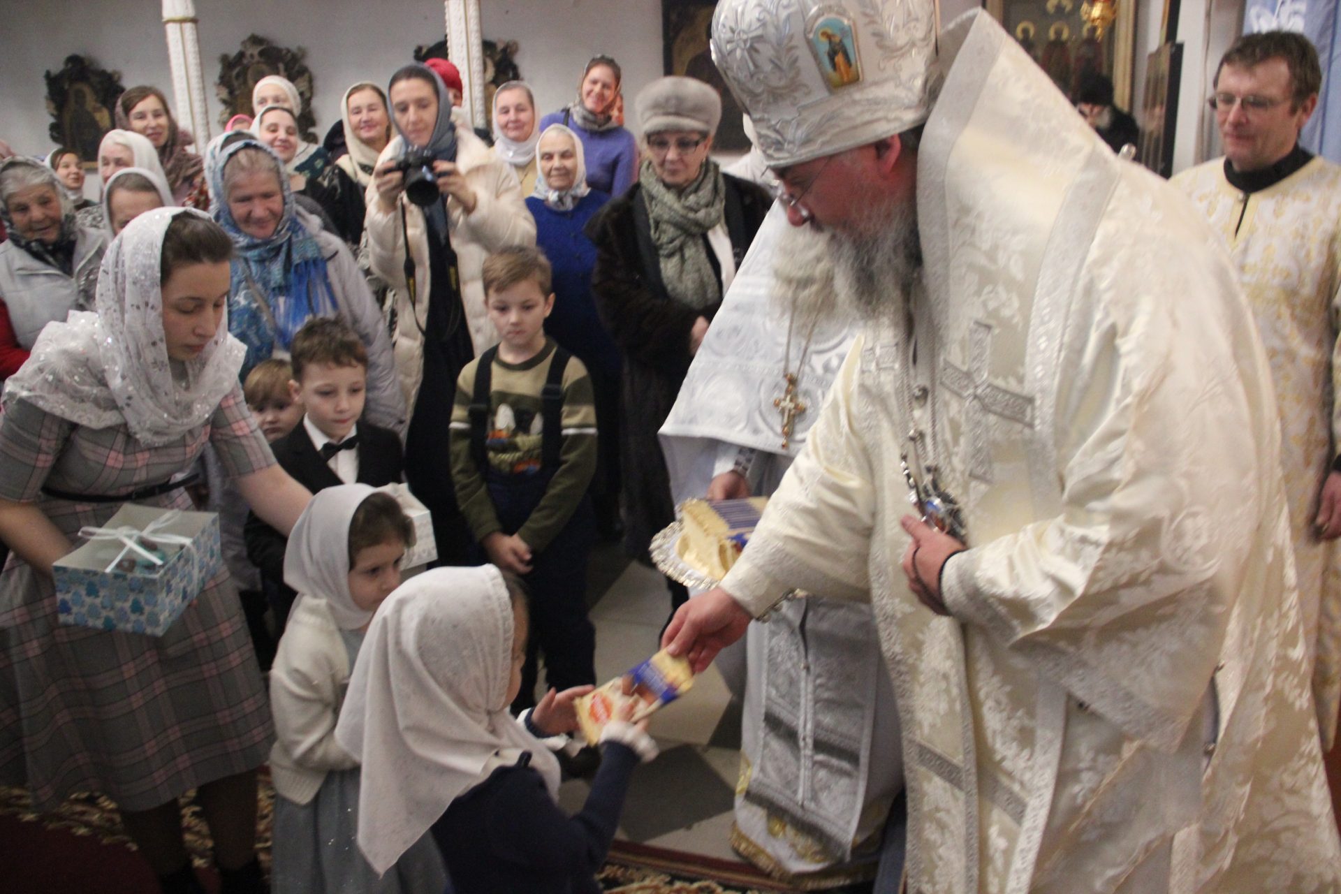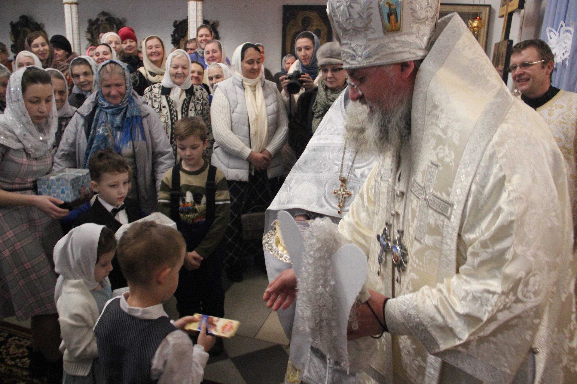 Владыка передал в дар собору комплект покровов на Евхаристические сосуды и закладку в Святое Евангелие. Юные прихожане поздравили архипастыря со светлым праздником Рождества Христова.